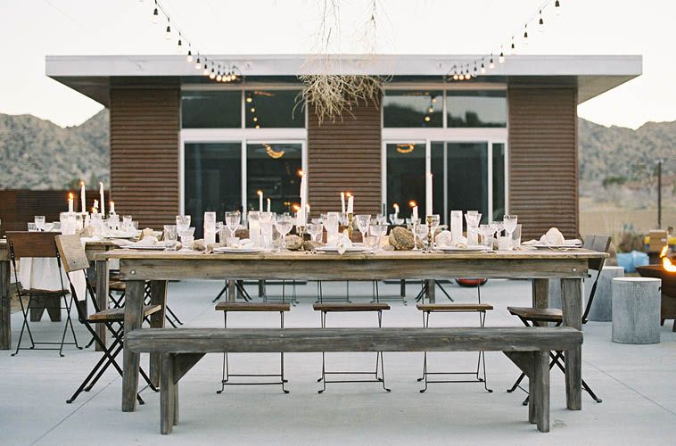 Rachael Ann Lunghi of Lace & Likes and Siren Floral Co. is all too familiar with the power of the desert. That’s why she recently did up the cinematic photoshoot of bride and wedding table at the charming oasis of Homestead Modern No. 1 in Pioneertown, California. A charming, contemporary example of escapism in the high desert, Pioneertown was built as scenery and sets by Hollywood studios following World War II. It remains a beloved destination, especially if you fancy a saloon atmosphere, because the celebrated musical roadhouse Pappy & Harriet's regularly comes to life just down the road.
