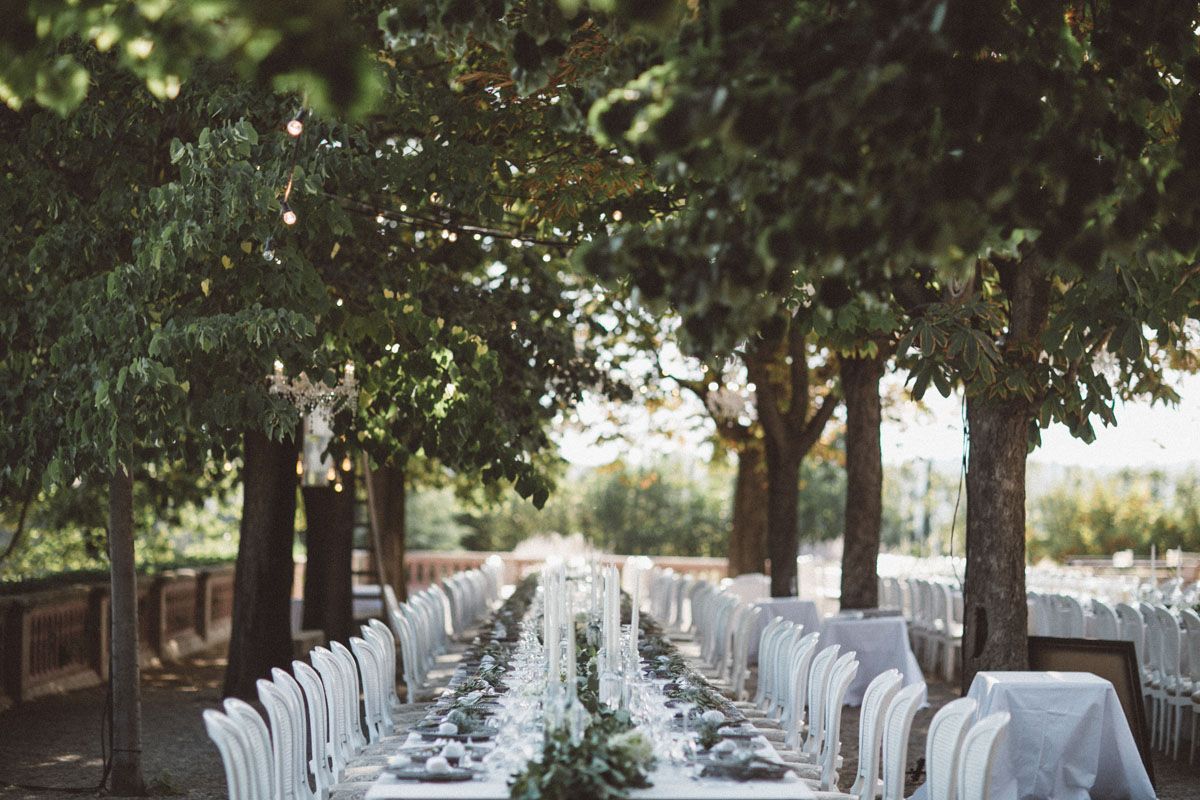 It was a wedding for 300 guests that flew in from around the world but mostly from Dubai. A cocktail reception was held in the castle gardens around the fountain with Spanish tapas and cava. Guests then moved upstairs to the terrace area in front of the castle for an al fresco dinner under the trees.