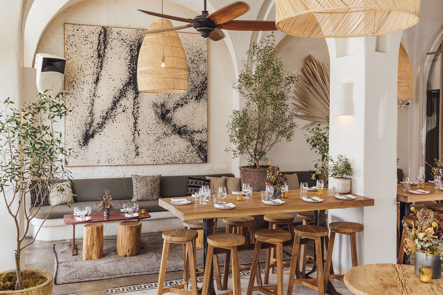 Aperol Spritzes, olive trees, whitewashed walls. No, you're not in Italy or Greece but underneath the "Venice" sign in Los Angeles at the latest hotspot in town, Gran Blanco. Going by the age old real estate rule of thumb, "location, location, location," this restaurant sits on the crème de la crème of Venice Beach property. Maximizing this prime locale, floor-to-ceiling windows open right onto the sidewalk set up with bar seating for your people watching pleasure. Looking inwards, a serene canvas of white, natural textures, and thoughtful details accent the built in banquettes, high top tables and a sturdy white bar that set the scene for the airy, must-be-on-vacation vibes of the restaurant. Serving up shareable bites and breezy drinks, Gran Blanco has quickly made a name for itself as the spot in Venice Beach. Oh, and did we mention that this is the latest project from Gran Blanco's big sister, Great White?