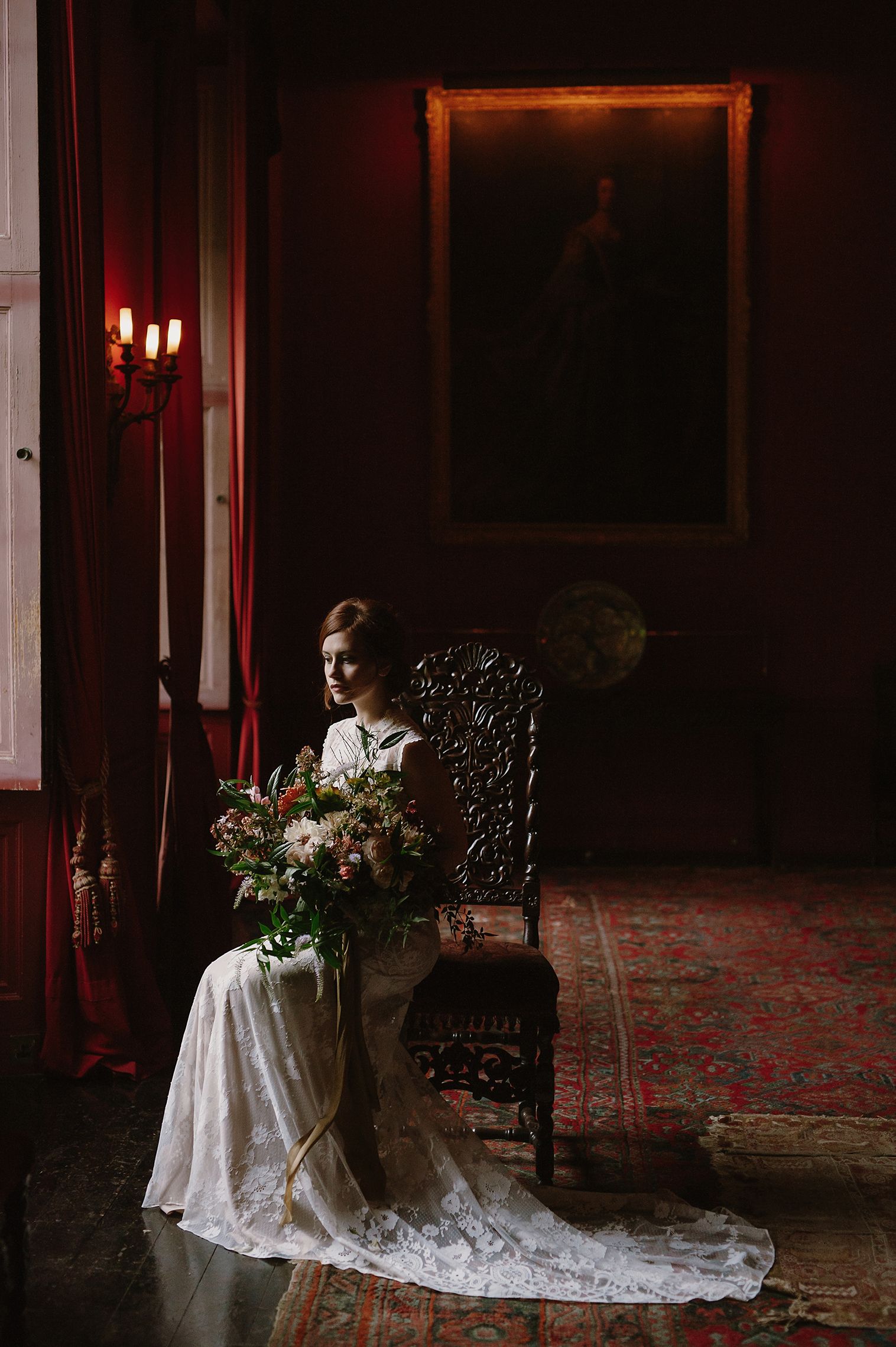 As any Downton Abbey fan will happily reminisce over, the wedding scene when Lady Mary finally marries Matthew Crawley is easily the most beautiful wedding scene in all of TV history. With the perfect amount of light flooding into the big, airy mansion, and the abundance of gorgeous flowers in an otherwise dark and moody setting, there’s an air of old English gloominess that makes the celebration that much sweeter. You can imagine our excitement when we got our hands on this photo shoot with a similar vibe.