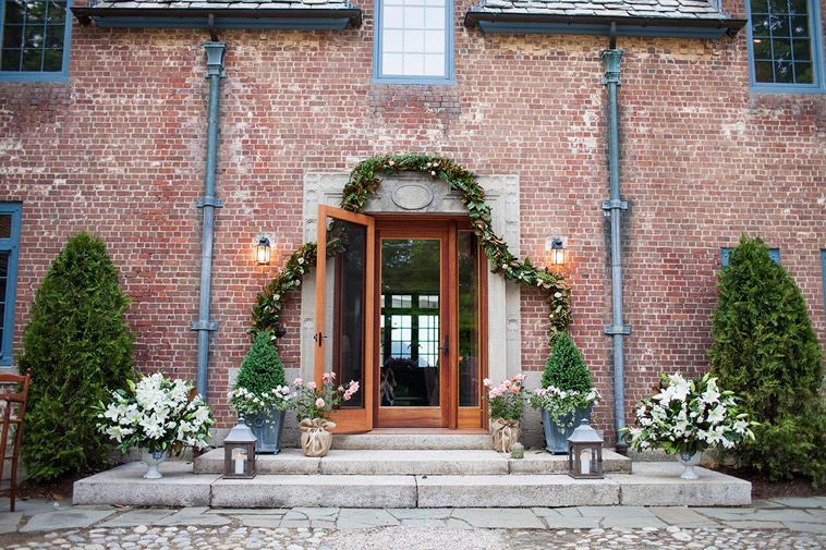 Upon entering the hundred-acre property, guests are greeted with a mile-long archway of old maple trees. The manor, completed in 1927, features flourishes of art deco details with a mostly French Norman inspired exterior.