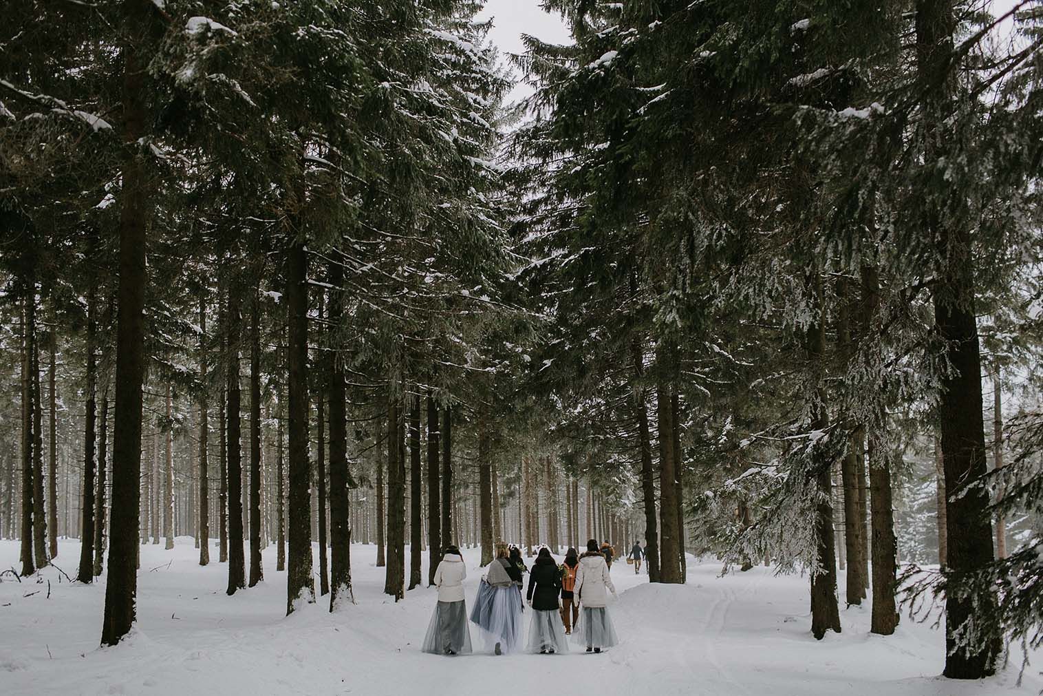 Winter weddings have that elusive, magical air about them that simultaneously makes you want to have one while also being terrified of the all of the unknown that comes with the season. One couple from the Czech Republic decided to embrace this mysticism with their completely outdoor, remote wedding in the Sumava National Park with sleds and snow-shoes to boot. Winter white, blue and grey hues dominated the day while the bride wore a flower crown befitting a snow queen and a frosty-toned tulle skirt. Drinks were brought along to warm up their winter bones and the day culminated in a family-style, home-cooked meal.