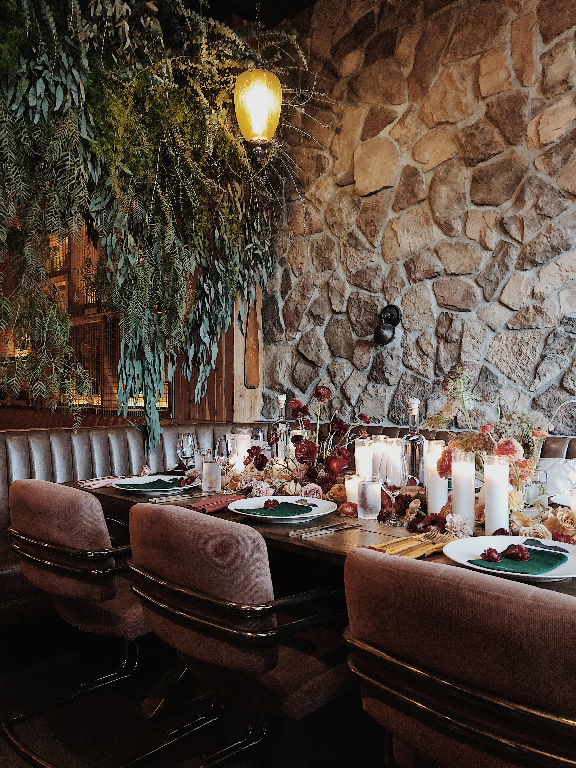 Inspired by growing up in the 1970's, Sycamore Den is filled with leather banquets, amber pendant lights, shotguns hanging on the walls and wood paneling, plenty of wood paneling. Comfortable and maybe even familiar, the cozy space easily dresses up with simple florals and foliage to set the scene for celebrating your groovy love.