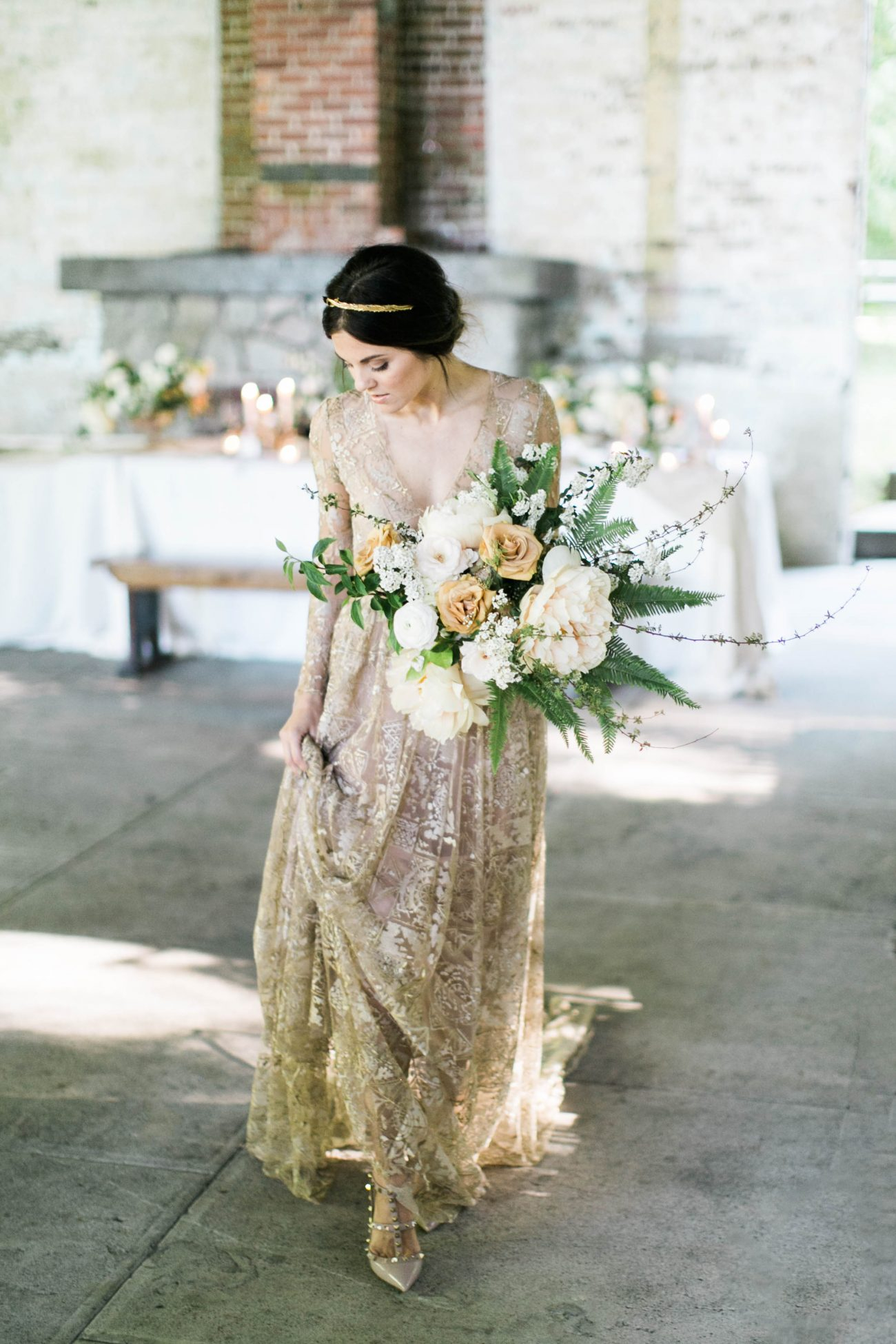Gold has been trending on tables everywhere for the past few years, but what about flipping the trend with a gold lace wedding dress and gunmetal flatware? The bouquet by Sinclair & Moore has the perfect pops of golden tones to accentuate the gown designed by Emily Riggs. See more on Once Wed here.