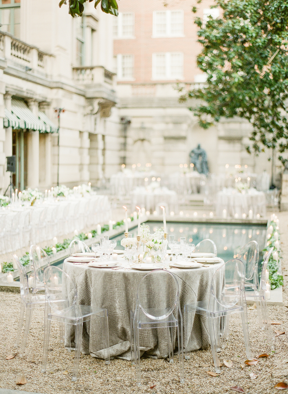 Foggy and moody winter weddings are always magical. Add in the ethereal nature of ghost chairs around an elegant candle filled table and you have set the scene for an alfresco fete, almost too gorg to be true. Strawberry Milk Events designed this ghost chair laden wedding at The Anderson House, built more than 100 years ago in Washington, DC. The venue is considered to be the captial city's "most fashionable mansion."