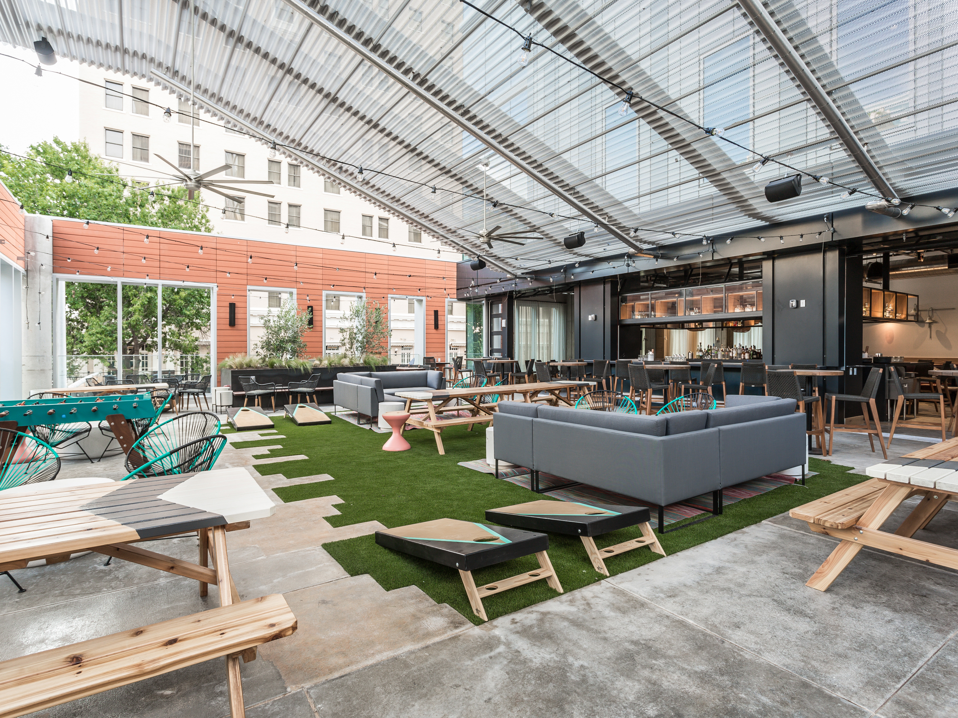 It’s like an adult playground at this ATX rooftop bar. Try your hand at oversized Jenga, cornhole, shuffleboard and more while sipping on local Texas brews at Upstairs at Caroline.