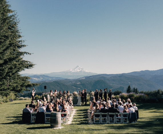 Cobblestone patios wind through expansive vineyard grounds at Gorge Crest Vineyards in Underwood, Washington, with sweeping views of the Columbia River and Mt. Hood. Marry on the expansive lawn with views of snow-capped Mt. Hood and set feasting tables alight with local fare and wines as far as the eye can see.