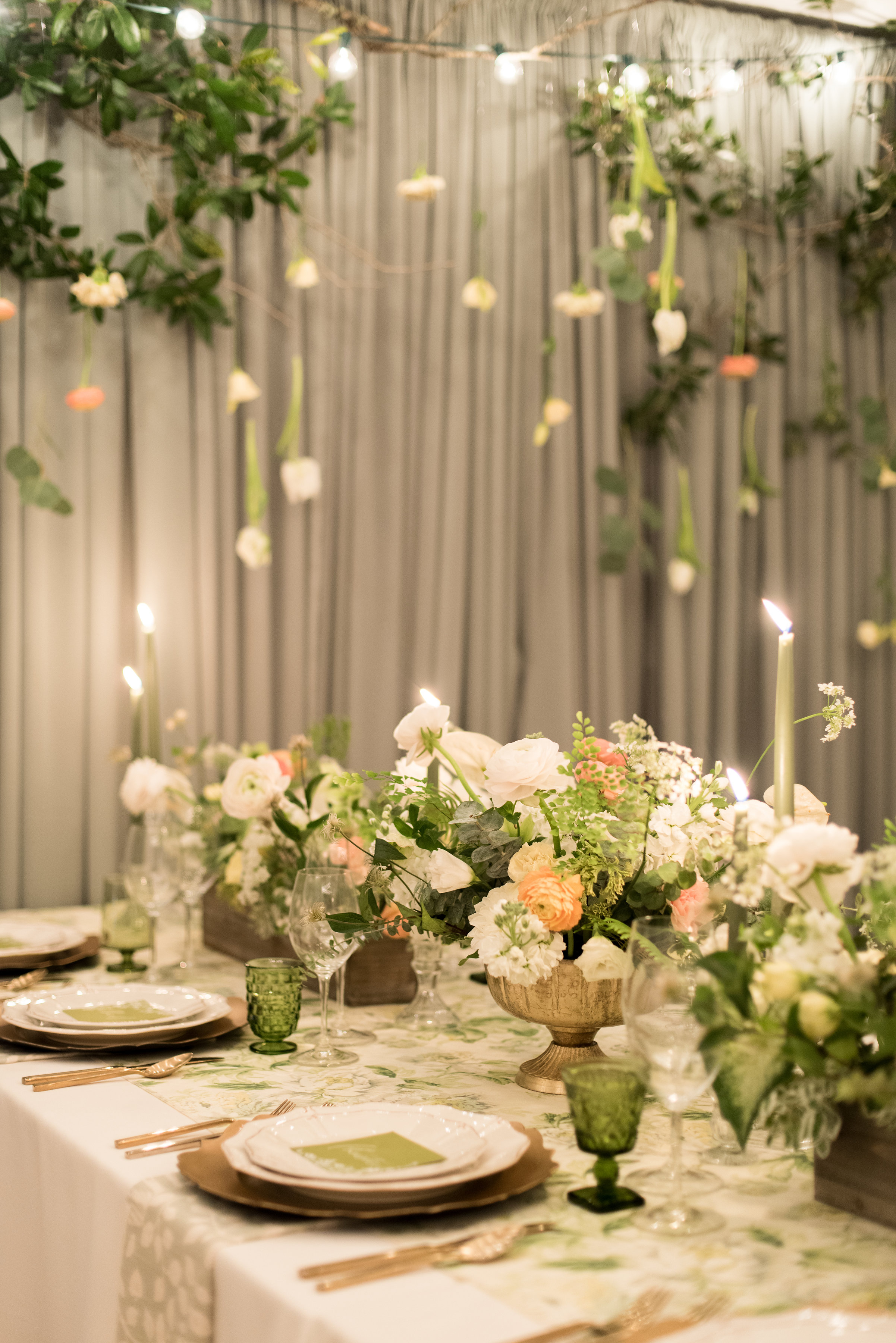 Whether it's a true theme or just a design element, choose something and carry it throughout the event from invitations to table top decor. Kristin chose to focus on the color green and floral elements. From green paper goods, floral napkins and custom table runner, colored glassware, tapered candles, and sage drapery the theme was carried out in a bold and tailored way. The entire design was very feminine and flirty (like the birthday girl herself)!
