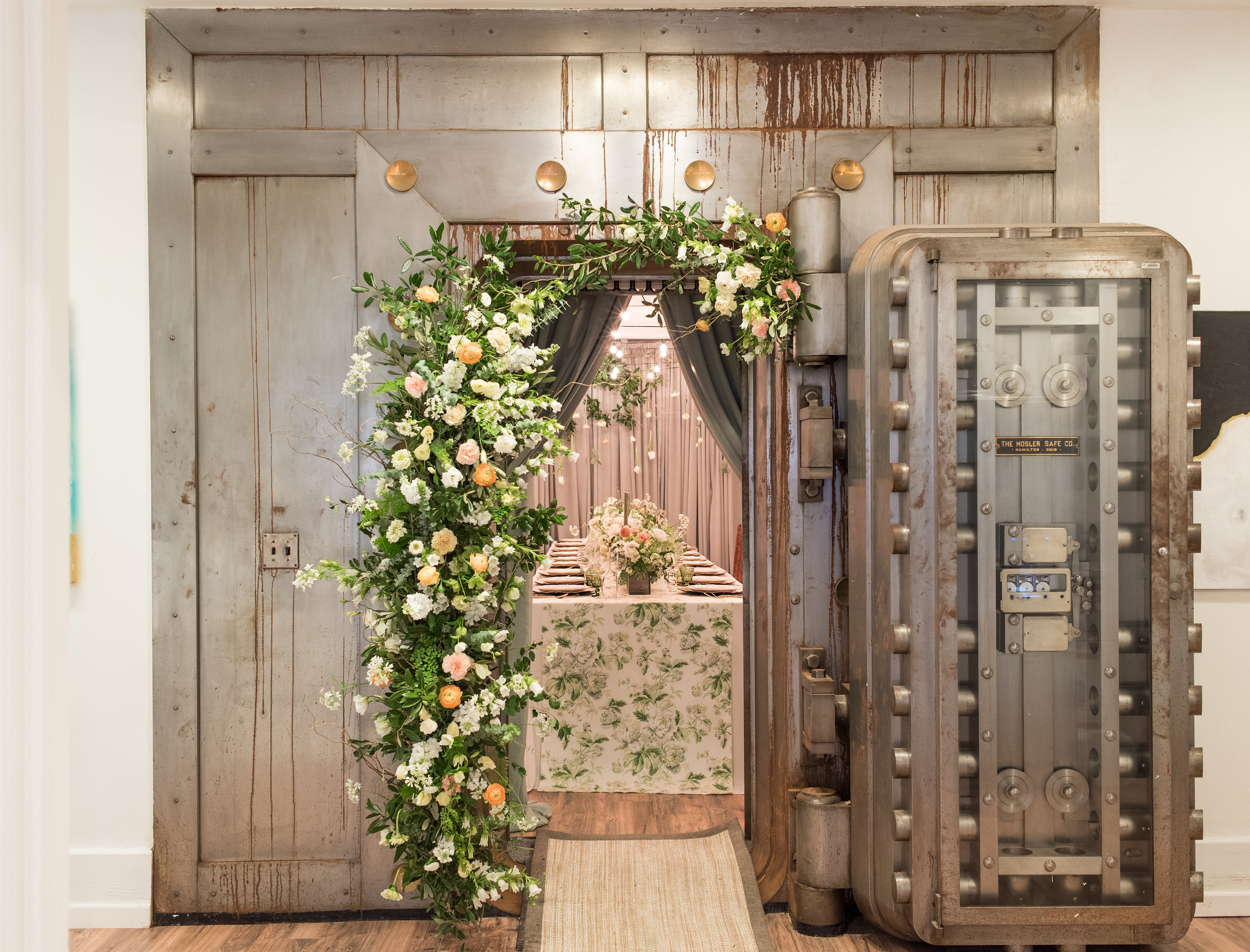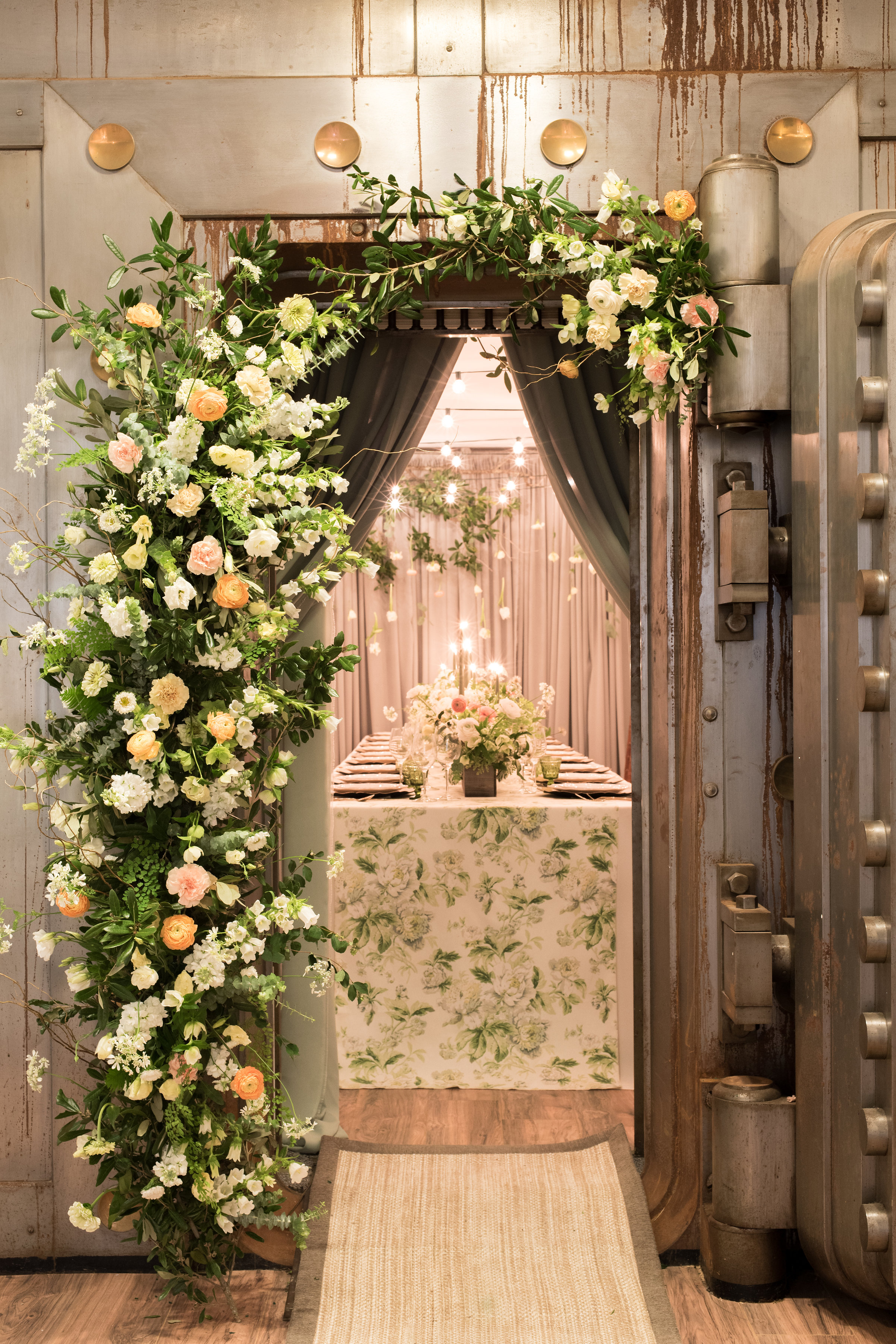 It can be as simple as inviting guests to wear all one color (Kristin asked hers to wear white) or keeping one element of the evening a surprise for guests to look forward to. In Kristin's case, the surprise was the unveiling of an intimate dinner table tucked away in the venue's old bank vault! Guests could see the floral adorned vault door as they sipped their pre-dinner champagne however the true magic of the interior draping and plethora of flowers wasn't revealed until they stepped inside.