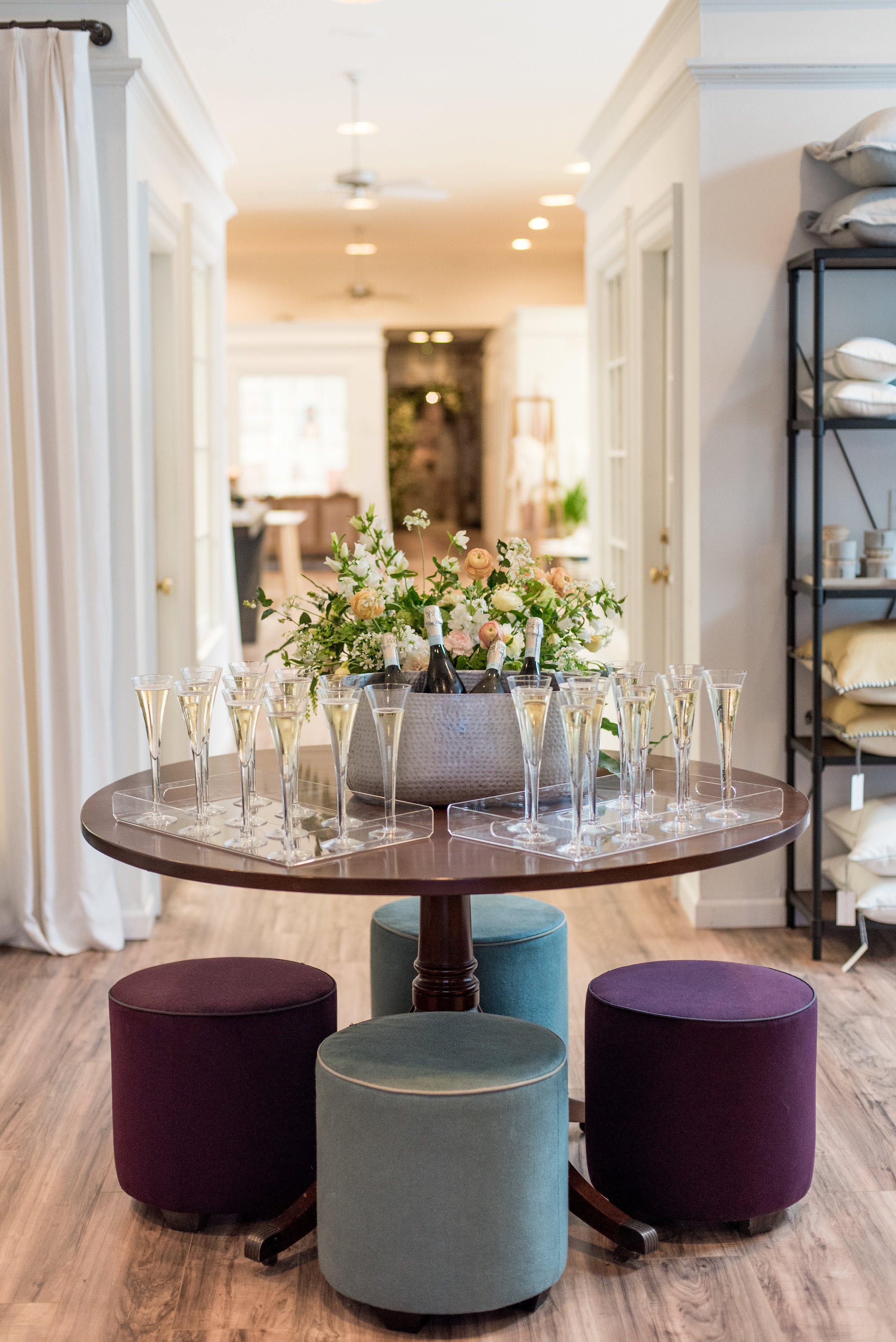 Nothing makes a guest happier and more comfortable than being offered a drink right away. For Kristin's party, we kept it classic by offering champagne in fluted champagne glasses at the gallery entrance. The cocktail hour was held in the main lobby of the old bank venue which currently serves as an art gallery. We kept the champagne flowing as guests got acquainted and the anticipation built for Kristin's unveiling of the dinner room.