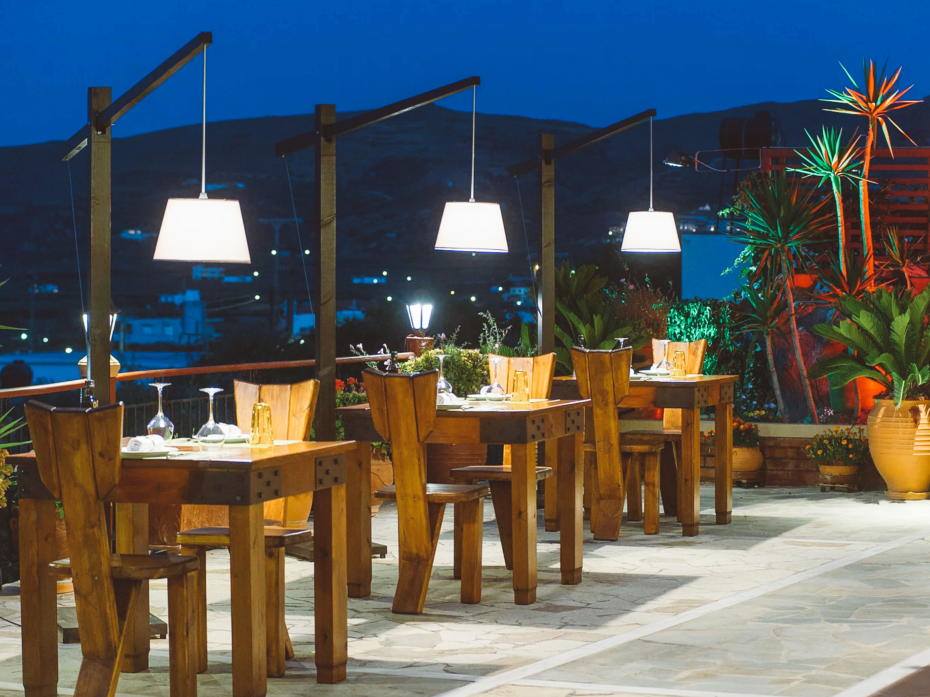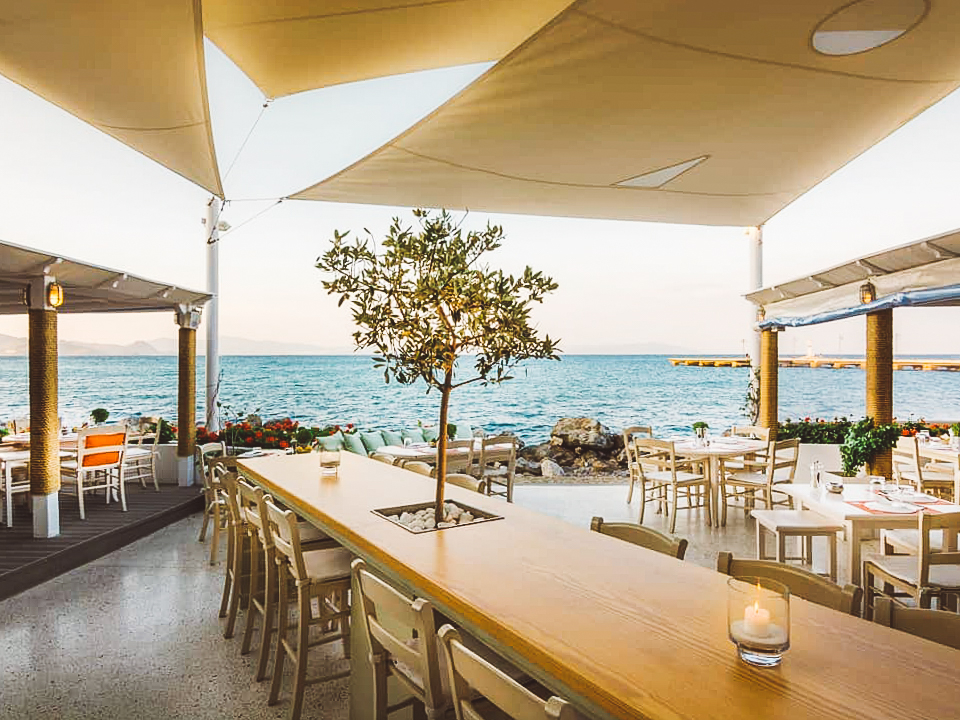The café at Chris Hotel in Skala peers over the edge of the water to both the harbor and the sea. The welcoming, sun-soaked space is a great place to recharge and grab a bite, a cocktail or both.