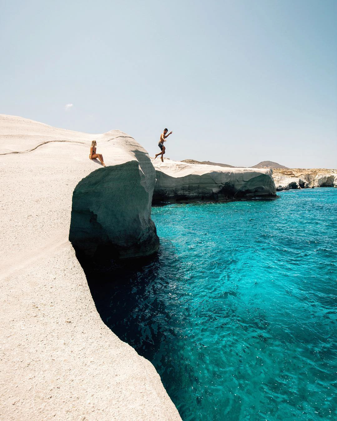 Fluffy white volcanic rocks jaggedly drop straight into the sea at Sarakiniko Beach in Milos. If you dare to cliff jump, this may be the most lunar-like landscape to take the dive.