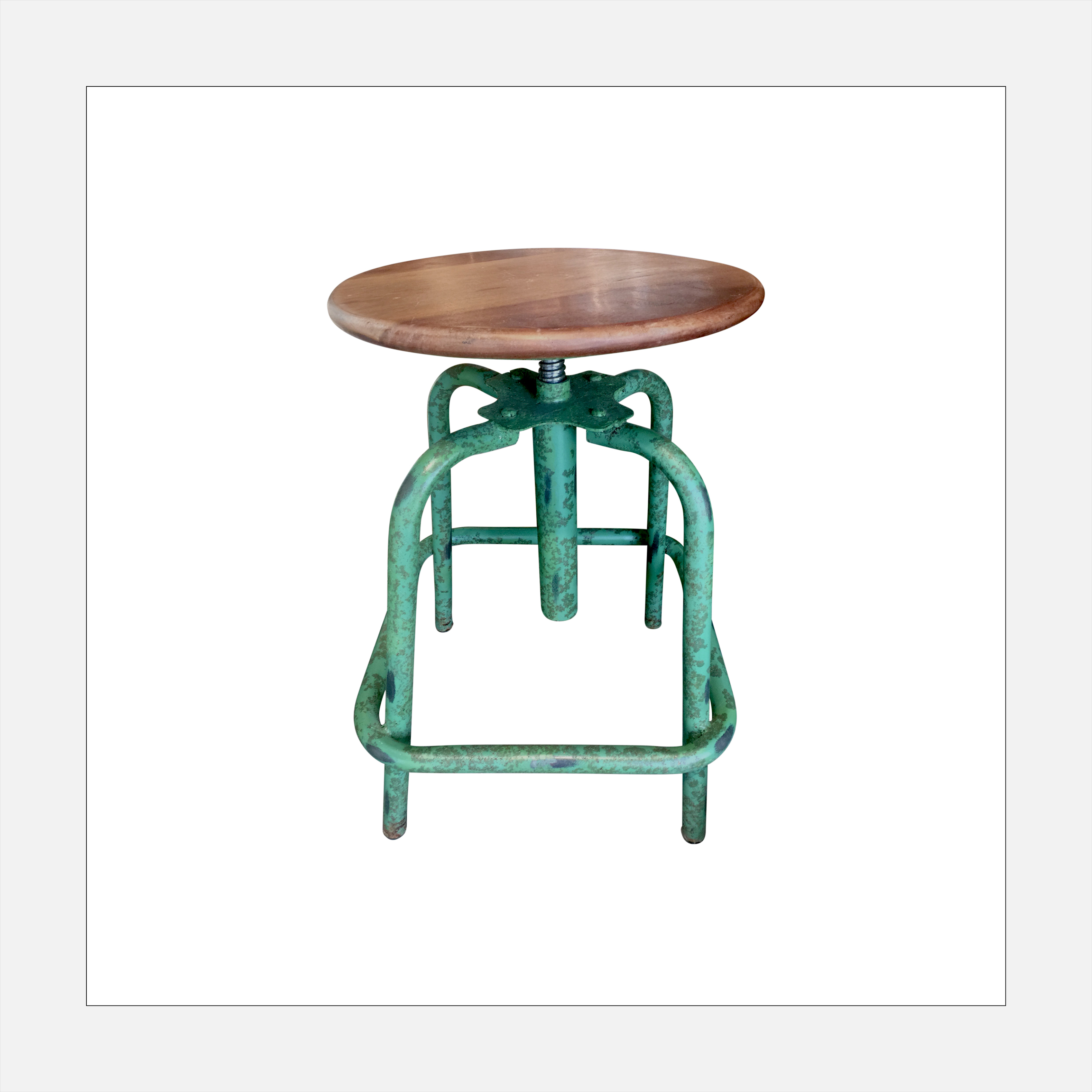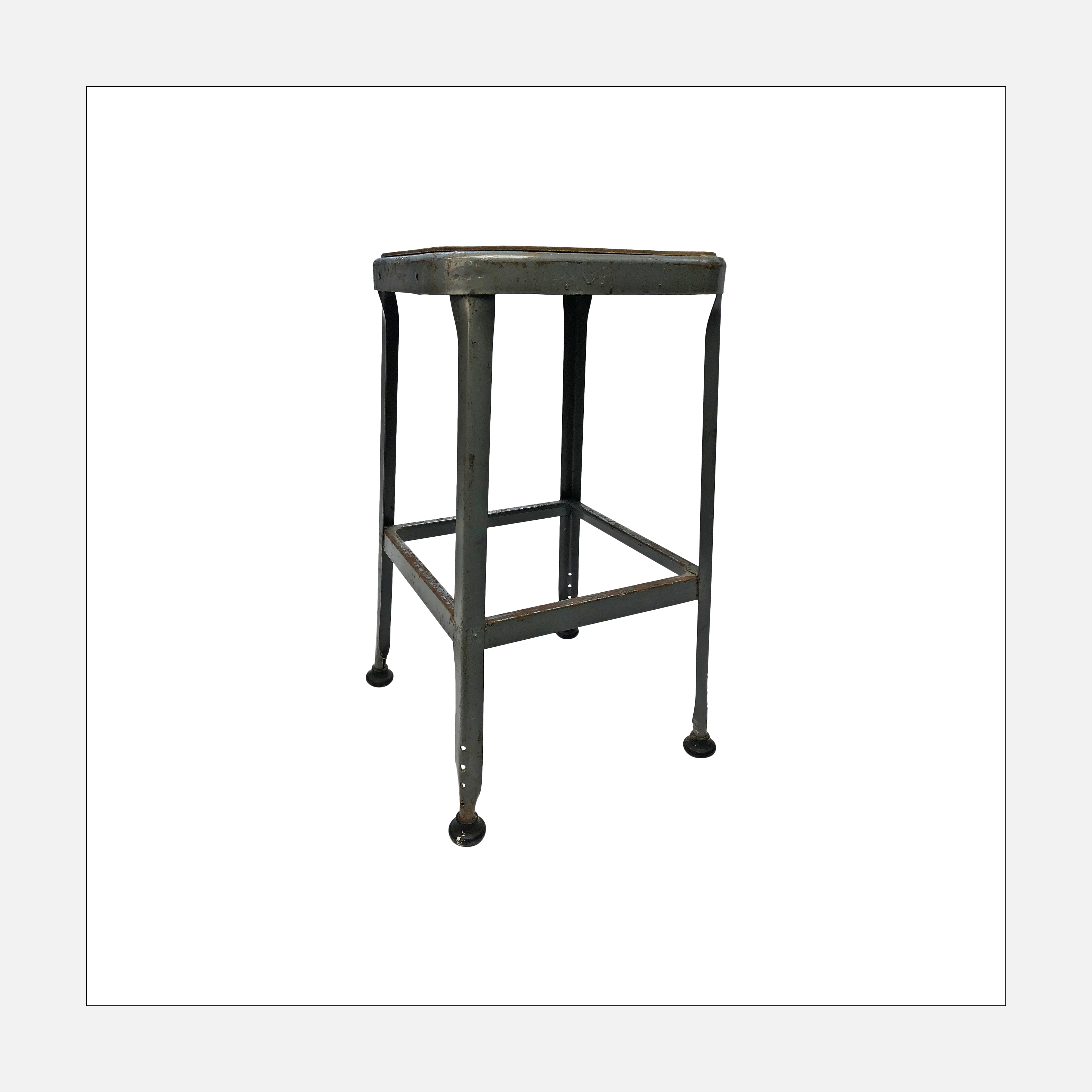 Add this gray metal shop stool for more layered, industrial style. Worn in all the right places, the Masonite seat sits atop a painted gray base.