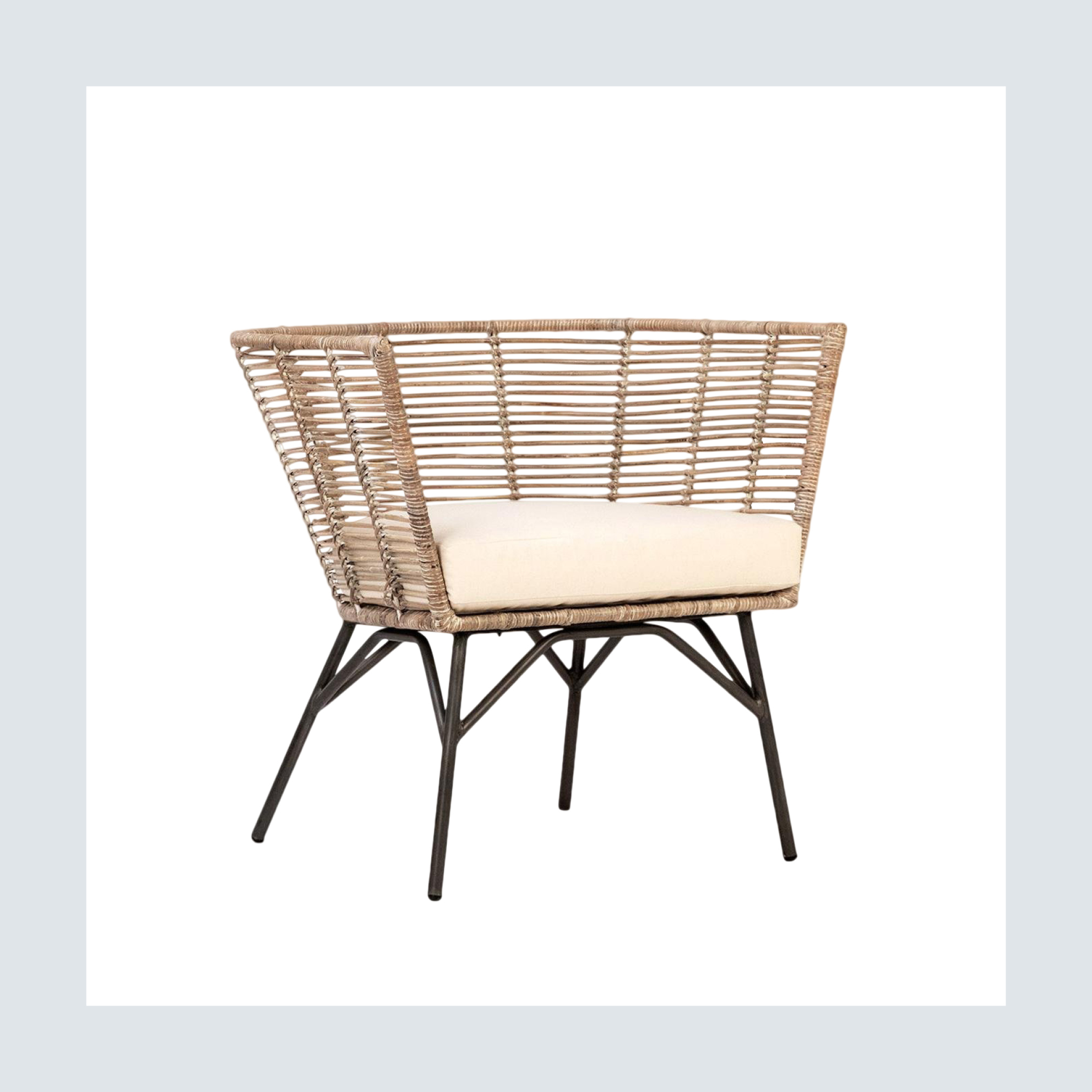 This modern rattan chair has clean lines, a natural linen seat cushion and a whole lot of Marrakech-worthy vibe. Use it as a side chair in a lounging space on your patio, or arrange a full set of these around a comfy outdoor dining table.