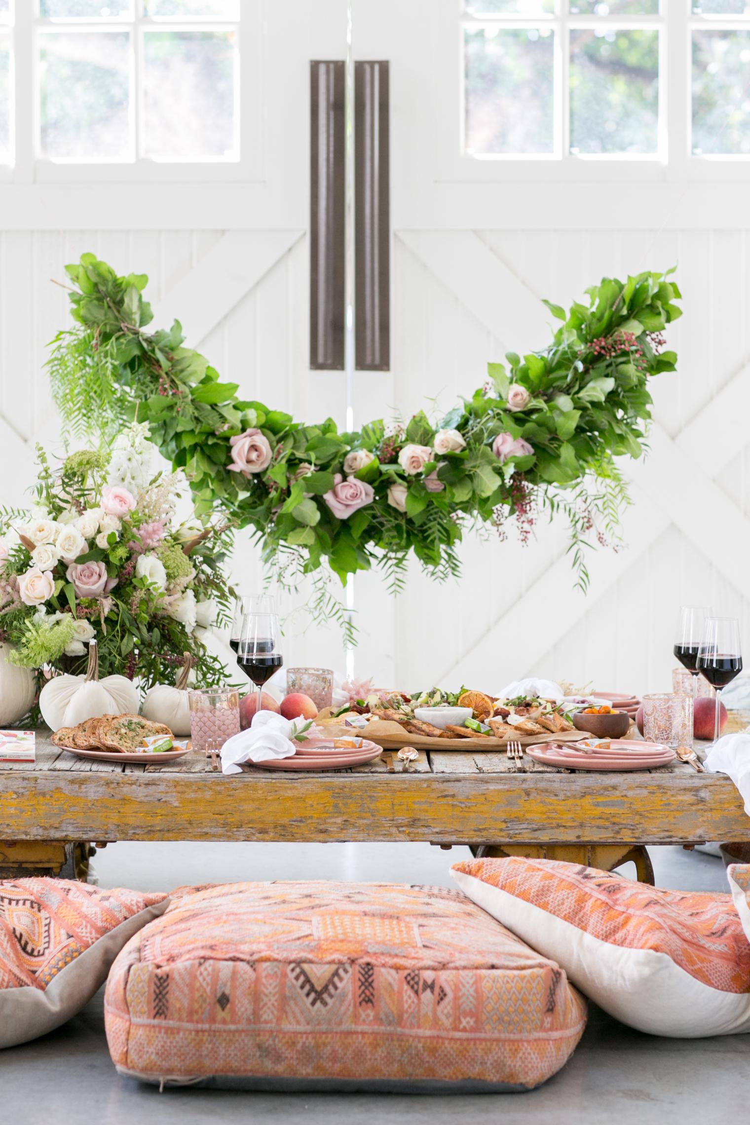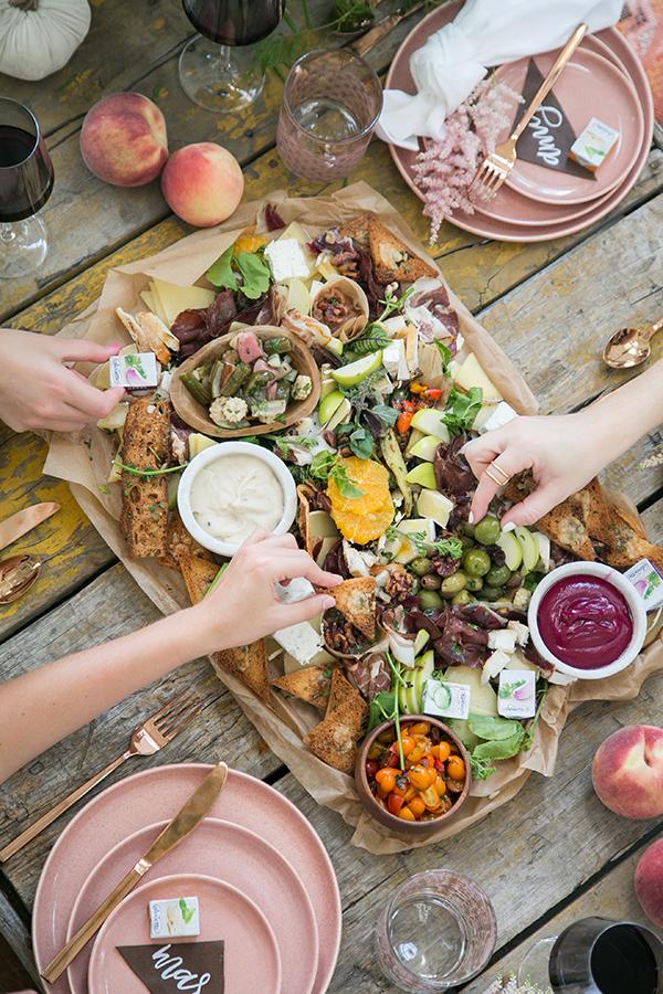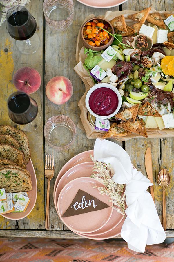 Since the floor seating is super comfy and relaxed feeling, it's fun to add a formal feel by setting the table. I like the ritual of setting the table because there’s nothing like pretty dinnerware. Let the charcuterie and cheese be the centerpiece, then just snack, drink and cheers away! Pro Tip: Here is a handy guide to make sure you set it properly (the forks go on the left).
