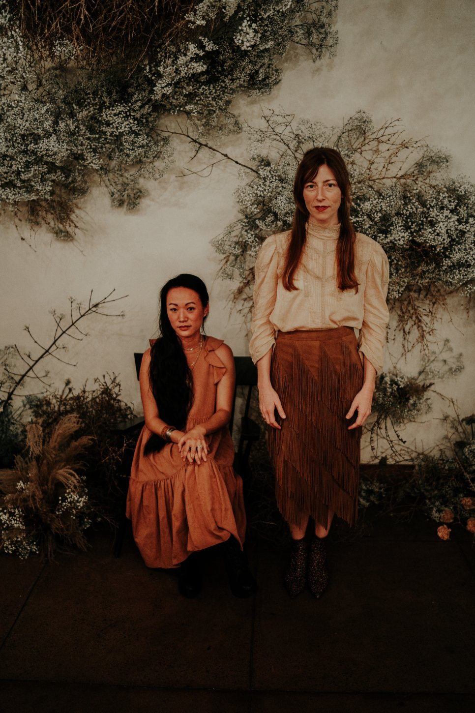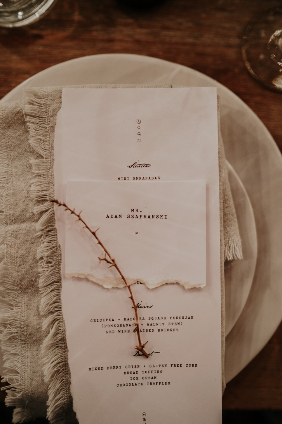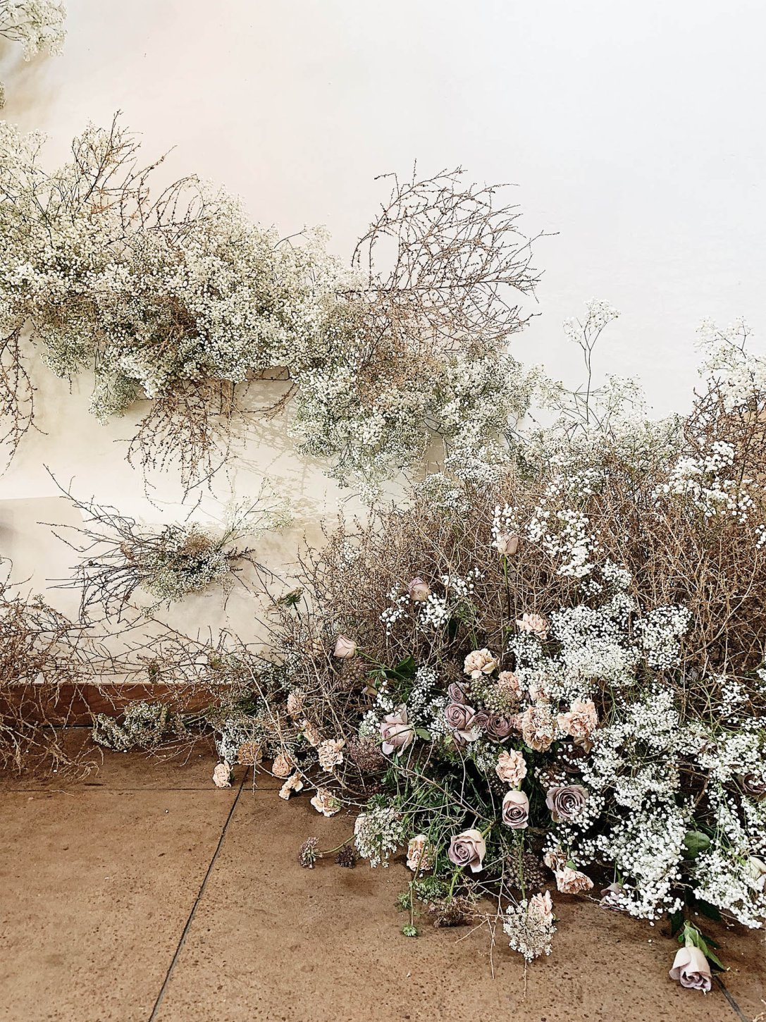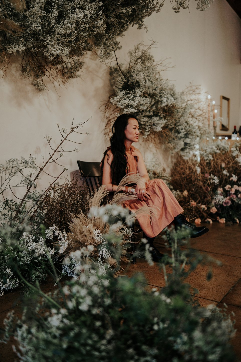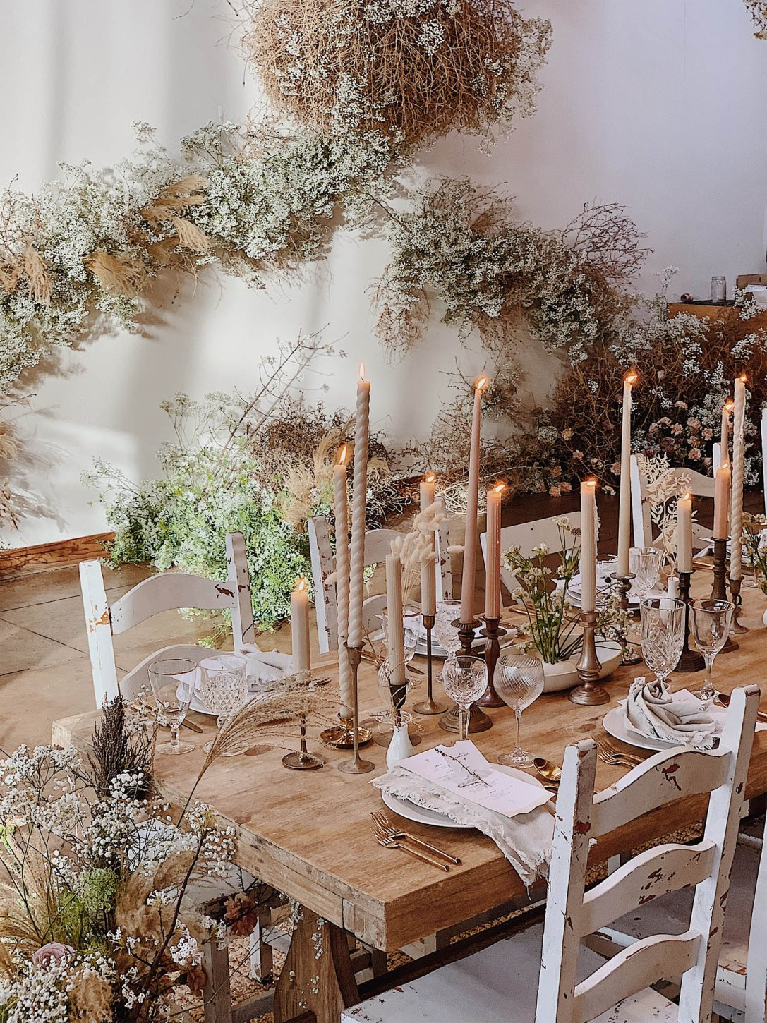 If you can’t host in a snowy forest like Ralph Lauren’s windows, recreate the magic indoors by building a landscape that feels like a campsite set in the American West. Florist Layered Vintage, had fun with foraged elements like wild brambles, rambling roses, and tumbleweeds arranged at floor level circling long whitewashed feasting tables as if nature simply grew around them. Tumbleweeds and wild brambles were hung from the ceiling, climbing up walls, wrapping around chair legs, and filling every corner like an overgrown prairie path.