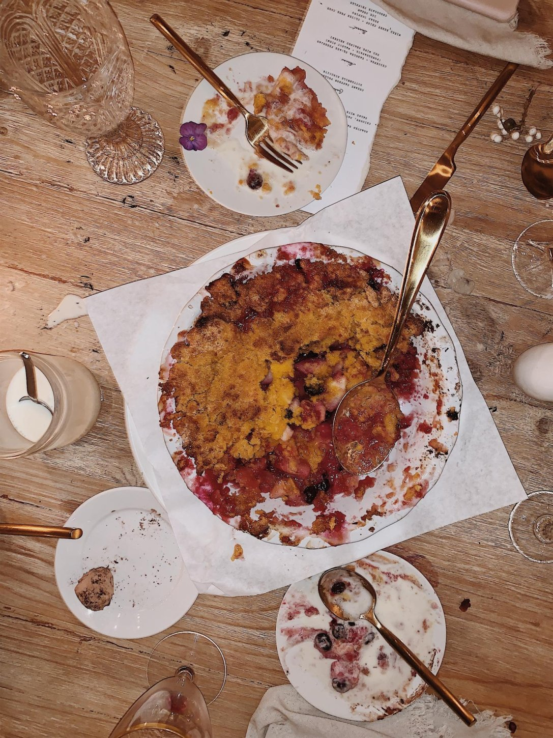 Instead of s’mores, serve a mixed apple crisp with a corn-bread crumble, as if someone baked it at the edge of a clearing. Add vanilla ice cream, chocolate truffles, and a drizzle of warm caramel for a fireside indulgence. It’s part nostalgia, part frontier feast, and totally Camp VR.