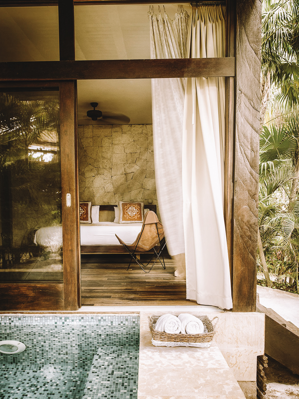 If you’re a design lover with a penchant for swimming in pools, Be Tulum will not disappoint. Each room at this small boutique hotel has its own plunge pool and there’s an awesome glass infinity pool deck outside on the beach.