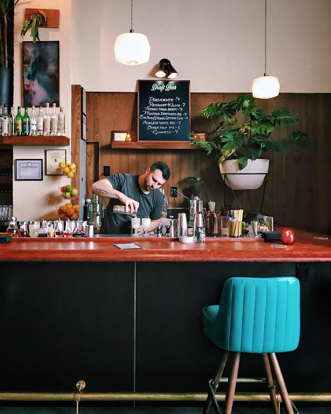 The venue has a sort of tropical midcentury feel, as well as a large outdoor patio. Here they take a classic—a penicillin takes scotch, lemon, honey and ginger—and make it even better. The Penichillin is also the most joyfully perfect name for a frozen version of the drink. In an era of cocktailing in which frozen cocktails proliferate, and are mostly subpar, the Penichillin maintains both it’s frosty iciness ant it’s booze-forward content all the way to the last drop. – The Liquor Cabinet