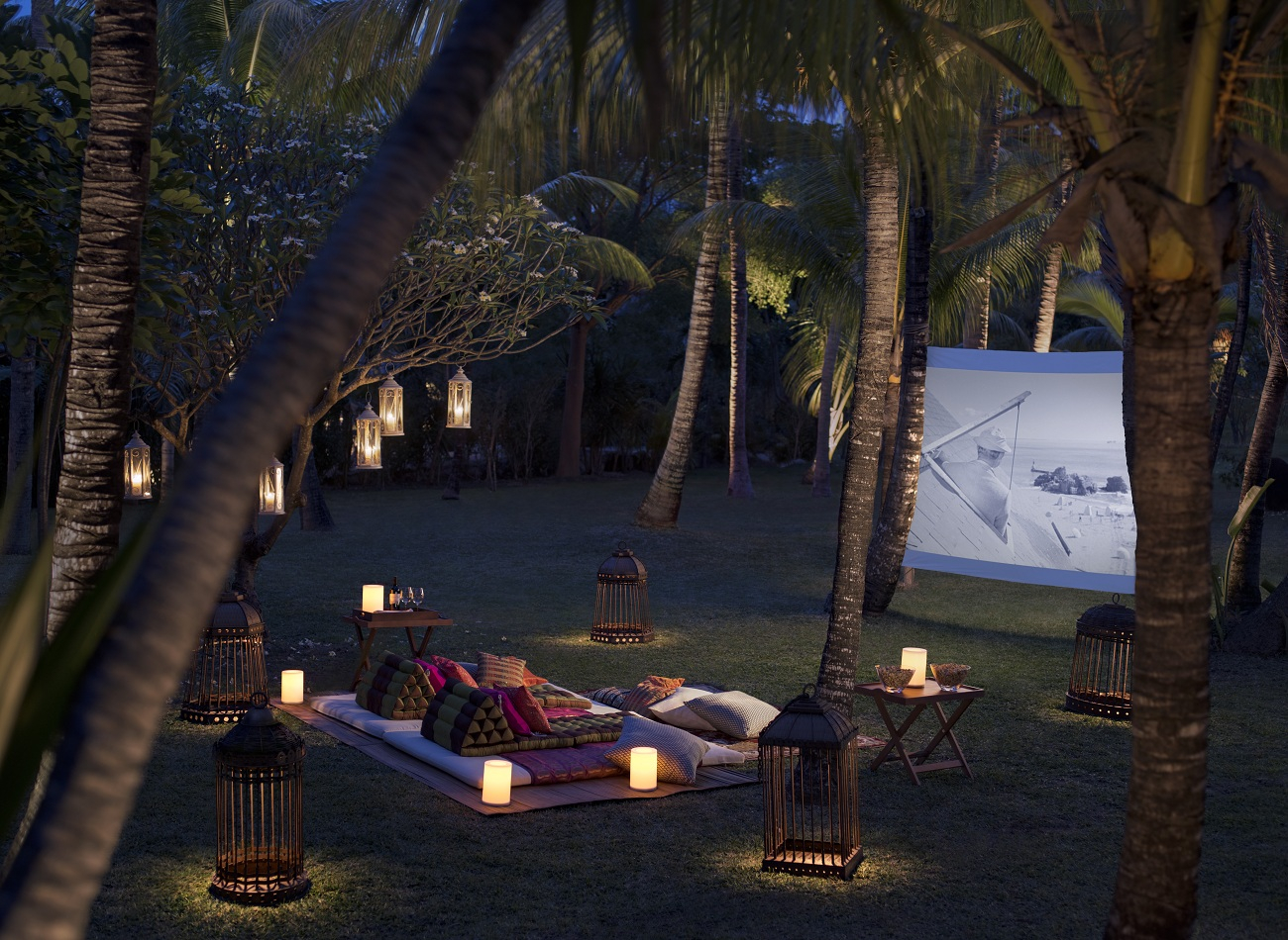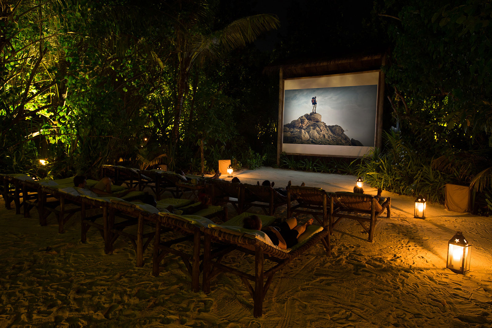 Lay back on a comfy lounge chair, listen to the gentle crash of ocean waves, feel the ocean breeze on your skin, and enjoy classic cinema every night of the week at this paradisaical outdoor beach cinema at this jungle cinema on a beautiful island resort in the Maldives. This 'Jungle Cinema' is the ultimate movie/dining experience.