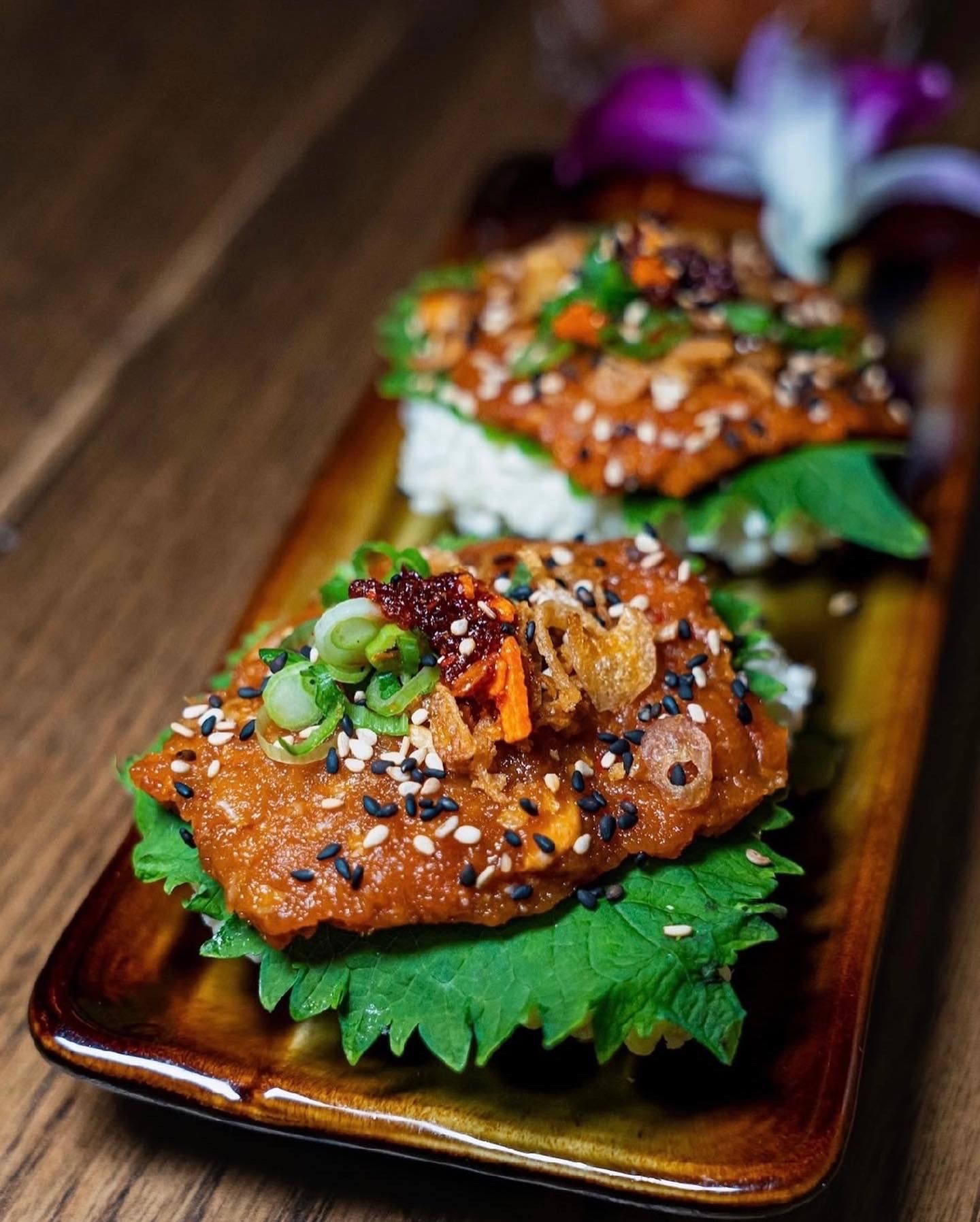11 Tigers is New York City’s first-ever speakeasy with a Thai heart and a Japanese soul. The marriage of these two culinary cultures is reflected in our menu, which includes small plates like Crying Tiger Gyoza and Thai Larb Tuna as well as larger dishes like 11 Tigers Tom Yum Ramen—tonkatsu ramen with jumbo prawn—and Black Panther Curry, squid ink fettuccine in makrut lime scented Thai Panang curry topped with seared ribeye steak.