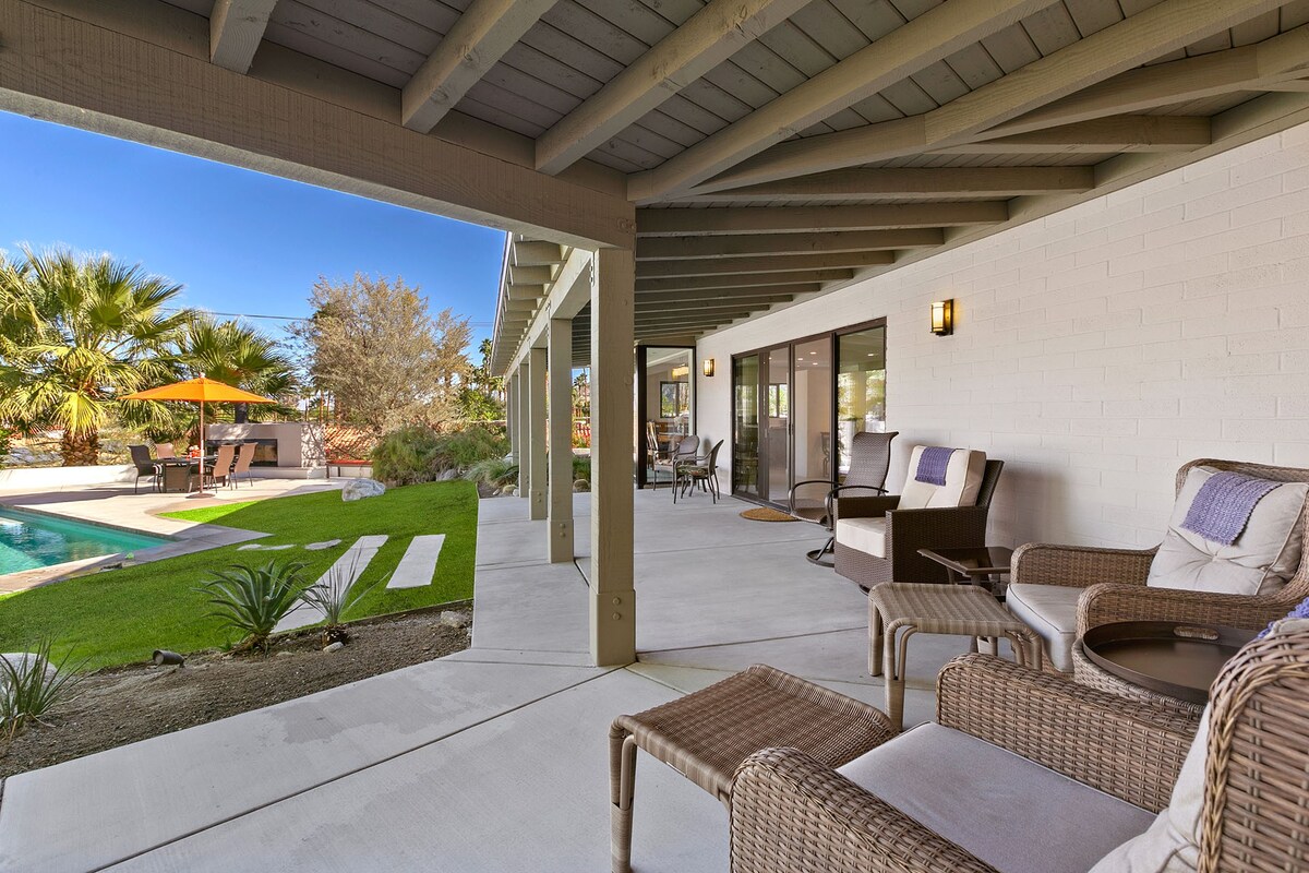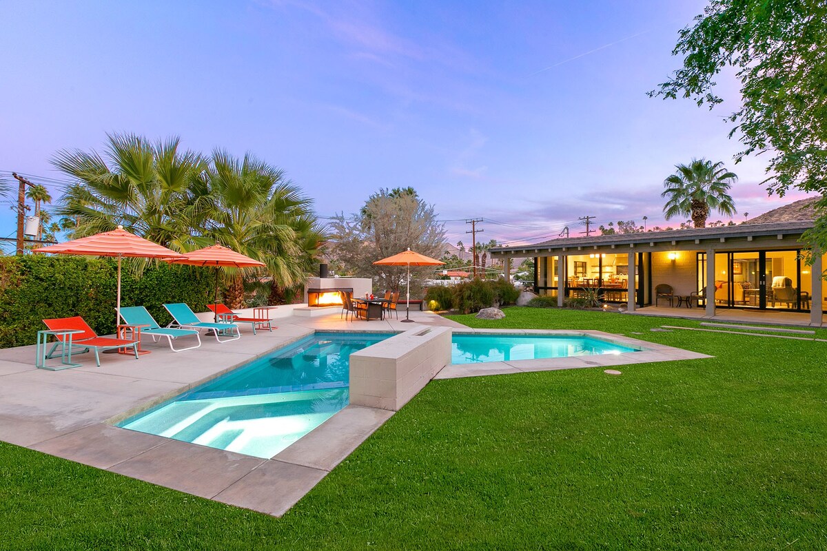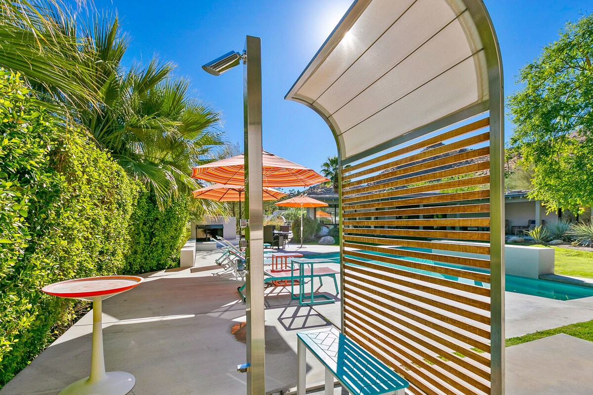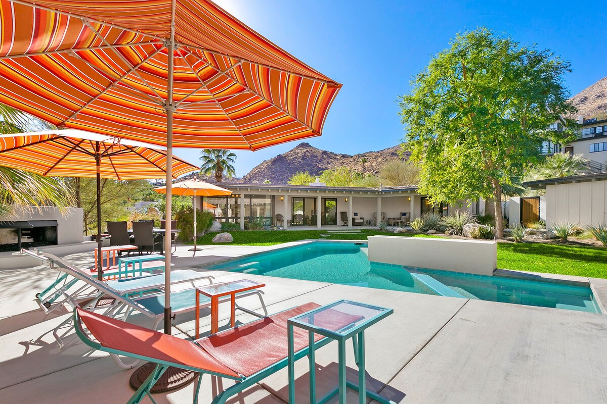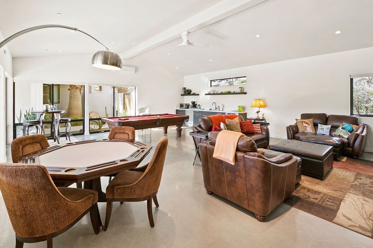 In the heart of a residential neighbourhood at the foot of the San Jacinto Mountains, this sparking villa is a spectacular home with touches that resemble the safari lodges of East Africa. This Palm Springs home boasts stylish bathrooms, a saltwater pool overlooked by mountains, and a kitchen equipped with all the appliances you'll need. After a languorous day spent lounging in the hot desert air and a quick rinse in the outdoor shower, fix up a couple of piña coladas and challenge your party to a few rounds of pool or poker inside – it's the ideal space for filling those couple of hours in-between afternoon and evening activities or hosting a games night. At night, stargazing around the fire pit is a memorable experience in itself. Whether you're here for the hikes of desert living or to discover the eclectic dining and nightlife of Downtown Palm Springs (a five-minute drive away), this home is simply irresistible.