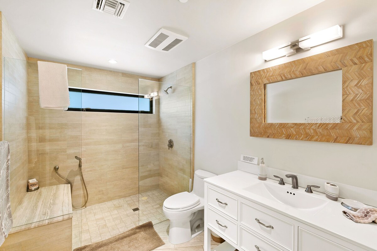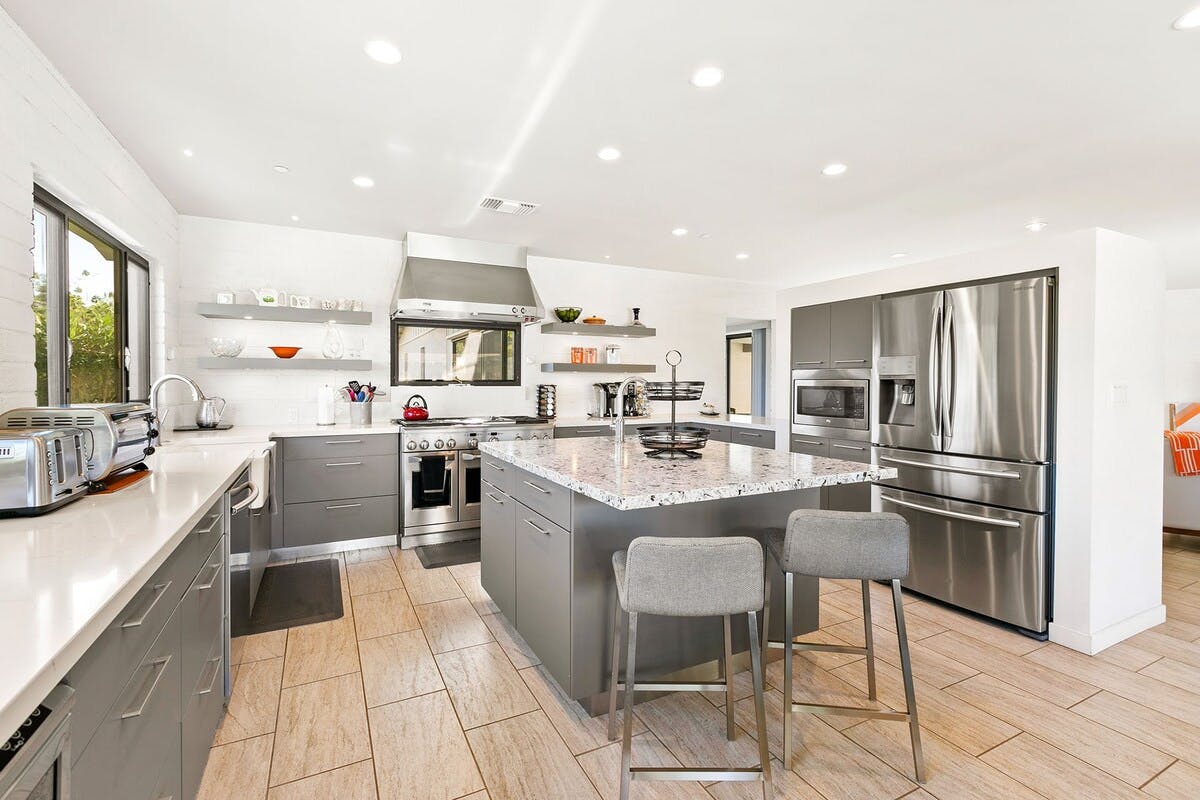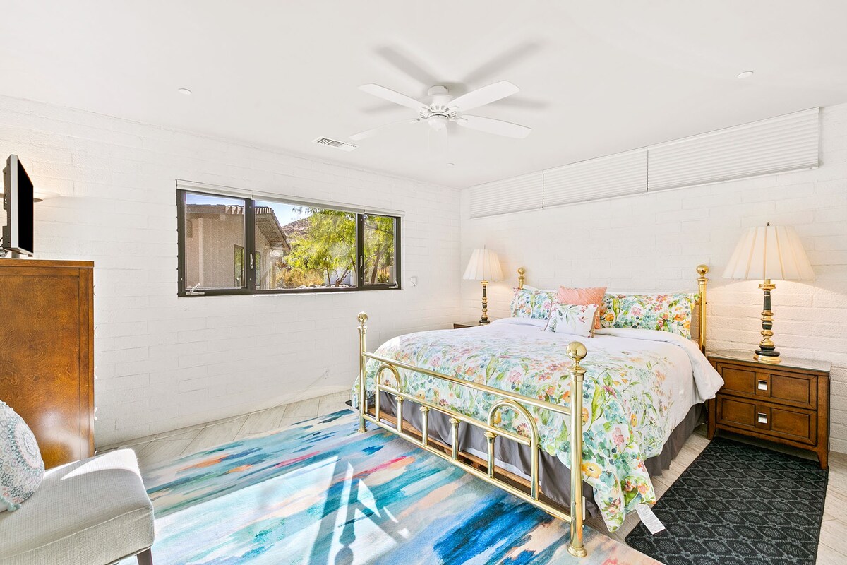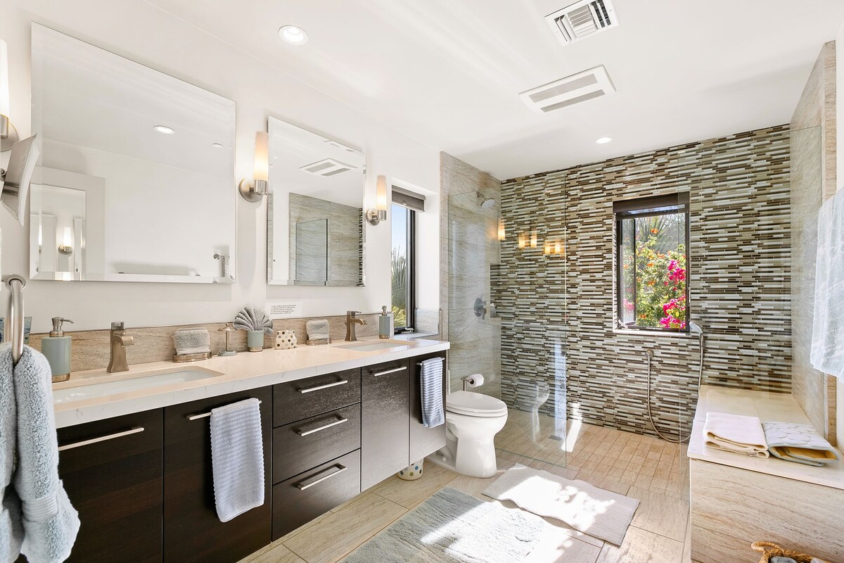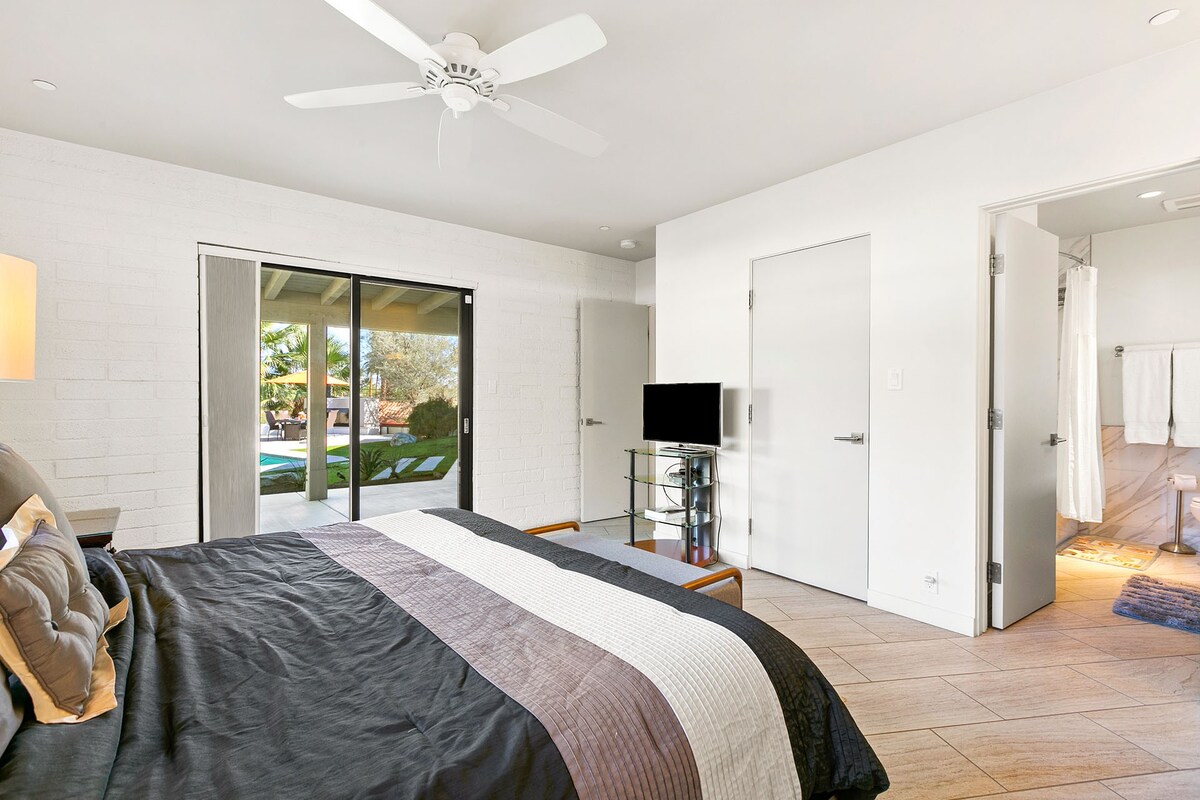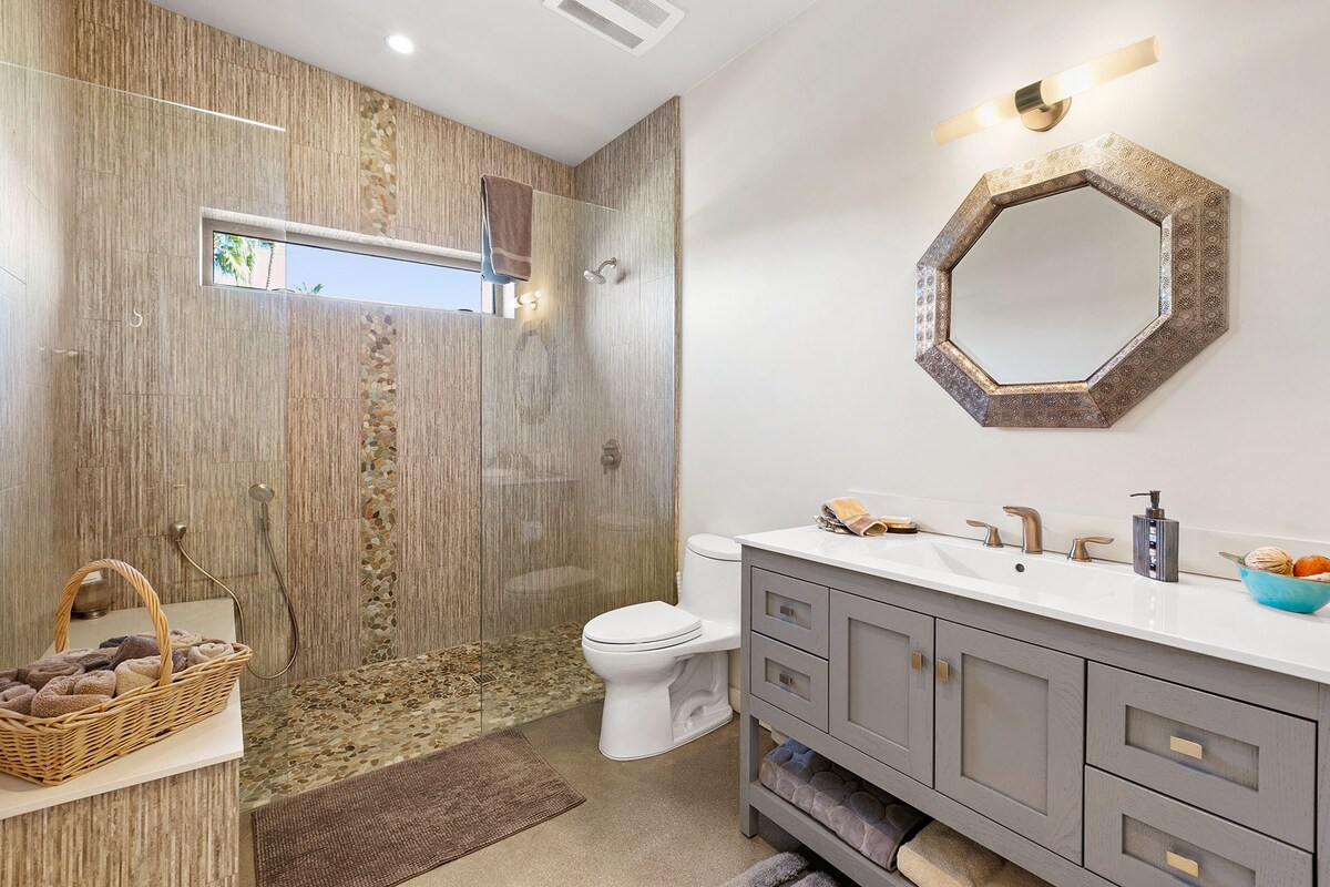 In the heart of a residential neighbourhood at the foot of the San Jacinto Mountains, this sparking villa is a spectacular home with touches that resemble the safari lodges of East Africa. This Palm Springs home boasts stylish bathrooms, a saltwater pool overlooked by mountains, and a kitchen equipped with all the appliances you'll need. After a languorous day spent lounging in the hot desert air and a quick rinse in the outdoor shower, fix up a couple of piña coladas and challenge your party to a few rounds of pool or poker inside – it's the ideal space for filling those couple of hours in-between afternoon and evening activities or hosting a games night. At night, stargazing around the fire pit is a memorable experience in itself. Whether you're here for the hikes of desert living or to discover the eclectic dining and nightlife of Downtown Palm Springs (a five-minute drive away), this home is simply irresistible.