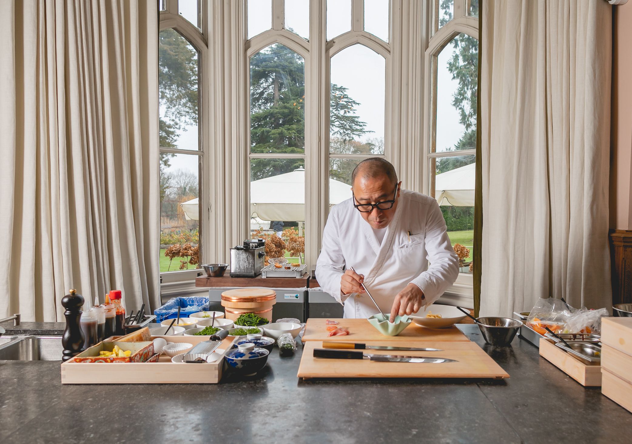 Enjoy a great array of freshly cooked dishes. Magnificent dishes are cooked by Chef Akira. Relax and enjoy lunch or dinner whilst making the most of the gorgeous views of our 33 acre landscaped gardens and The River Thames.The theme of the Omakase course is a fusion of Japanese cuisine with local British and European ingredients. For example, we use traditional European ingredients such as croissants to create sushi and pasta to create Japanese dishes. We use the fresh Japanese wagyu beef for our starters and sushi, and we also use the Japanese techniques of curing local fish of Europe - using kombu seaweed - to bring out the best of the ingredients. Omakase course is £150 pp (£195 with wine & sake pairing)All the guests (10-12 covers) will be seated on the same time on 1 long table. We hope you will enjoy our special Omakase at Oakley Court Hotel.