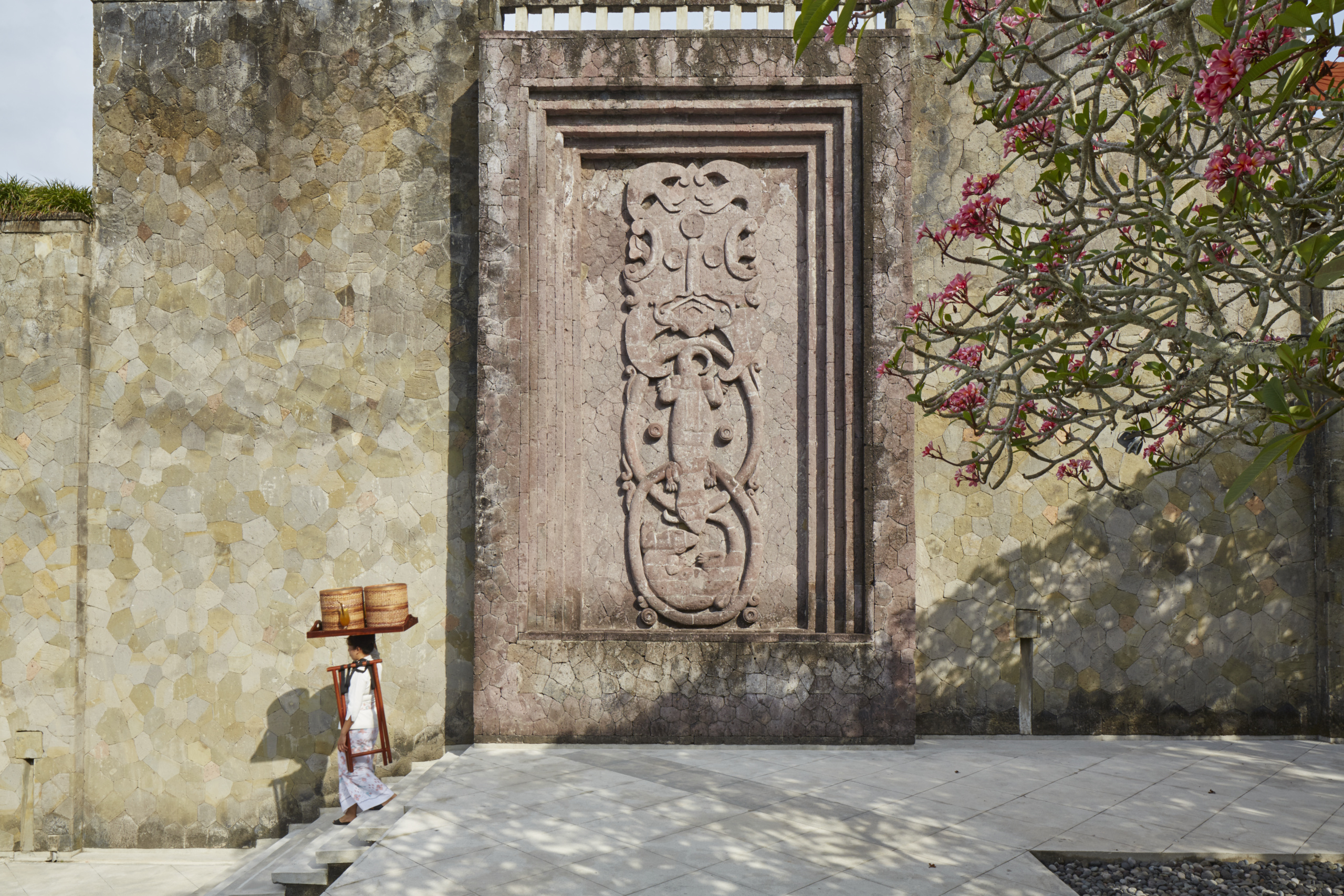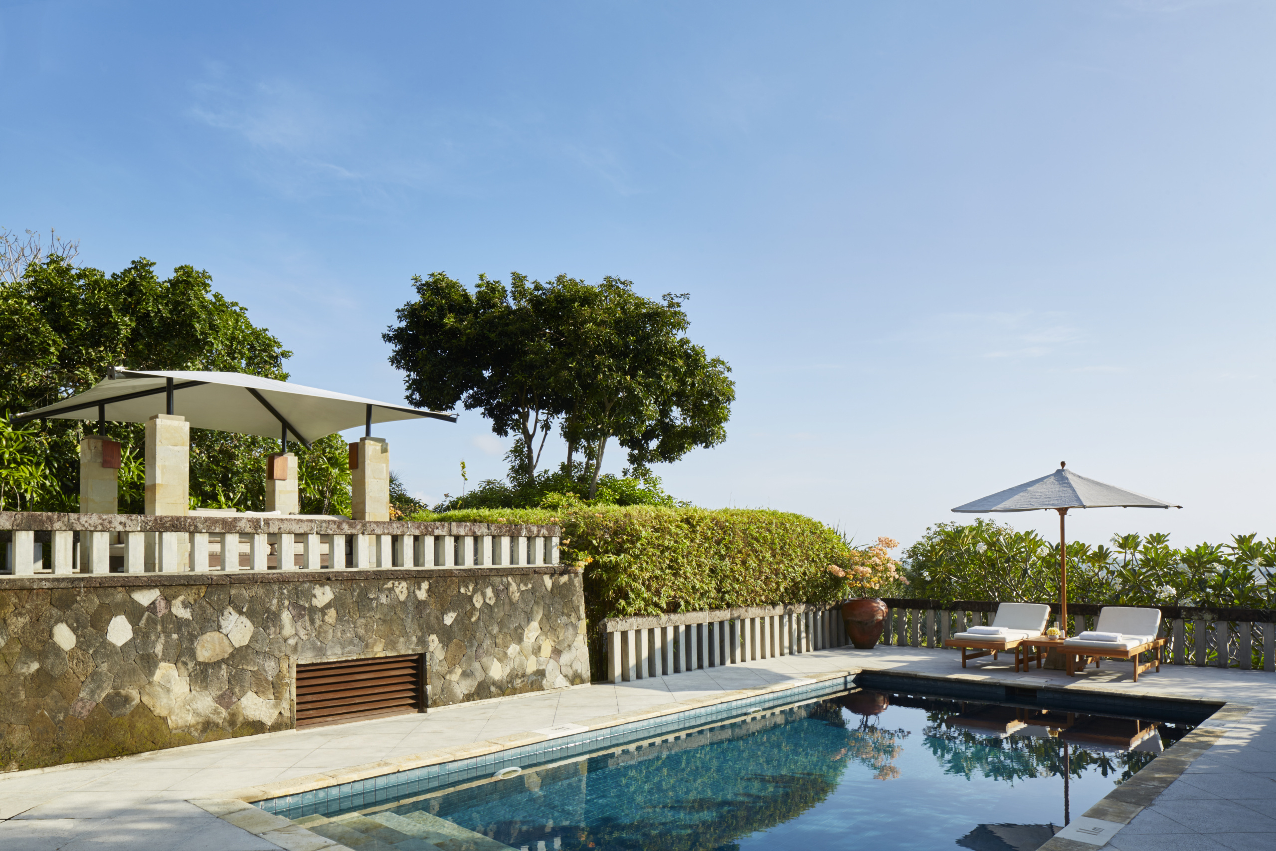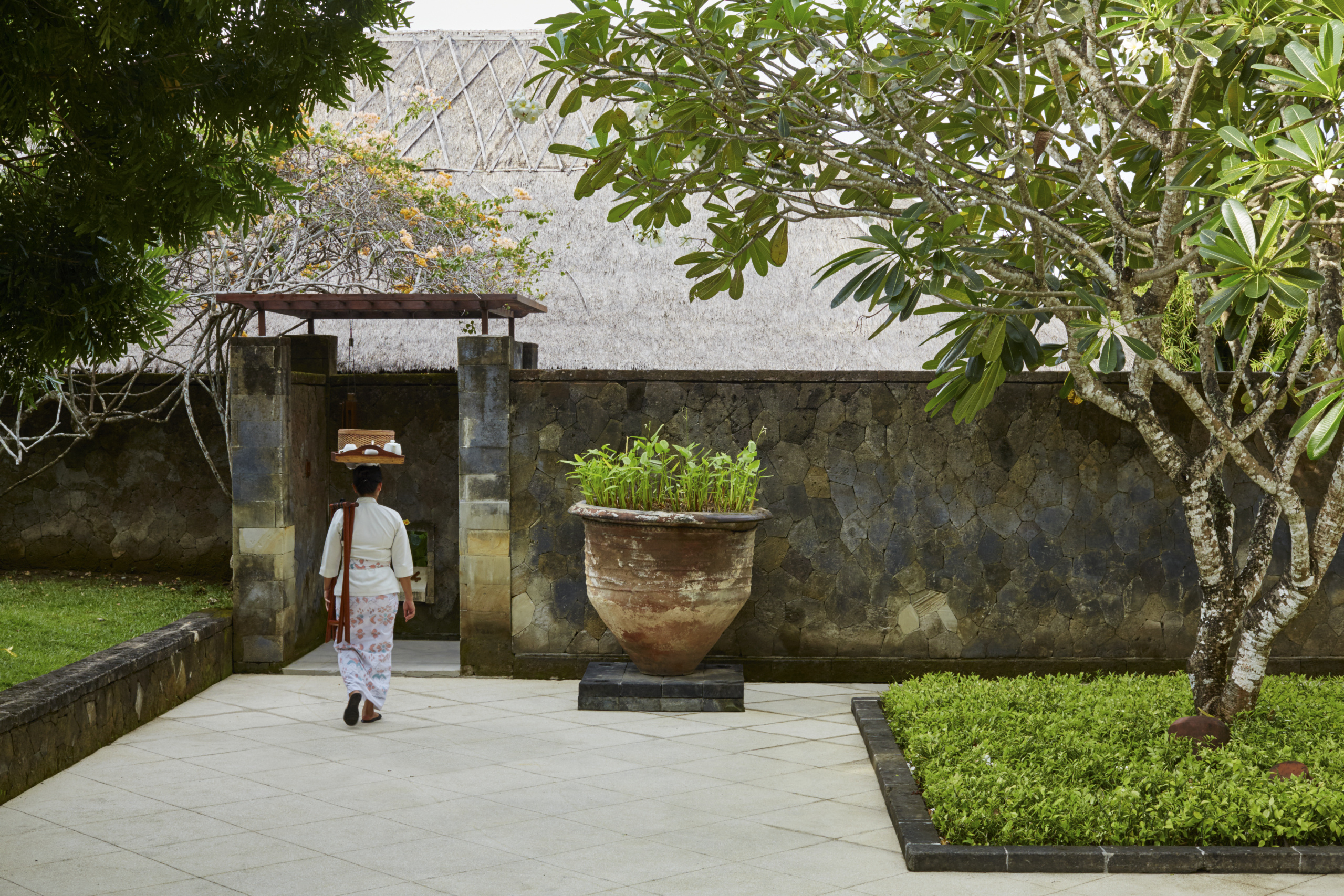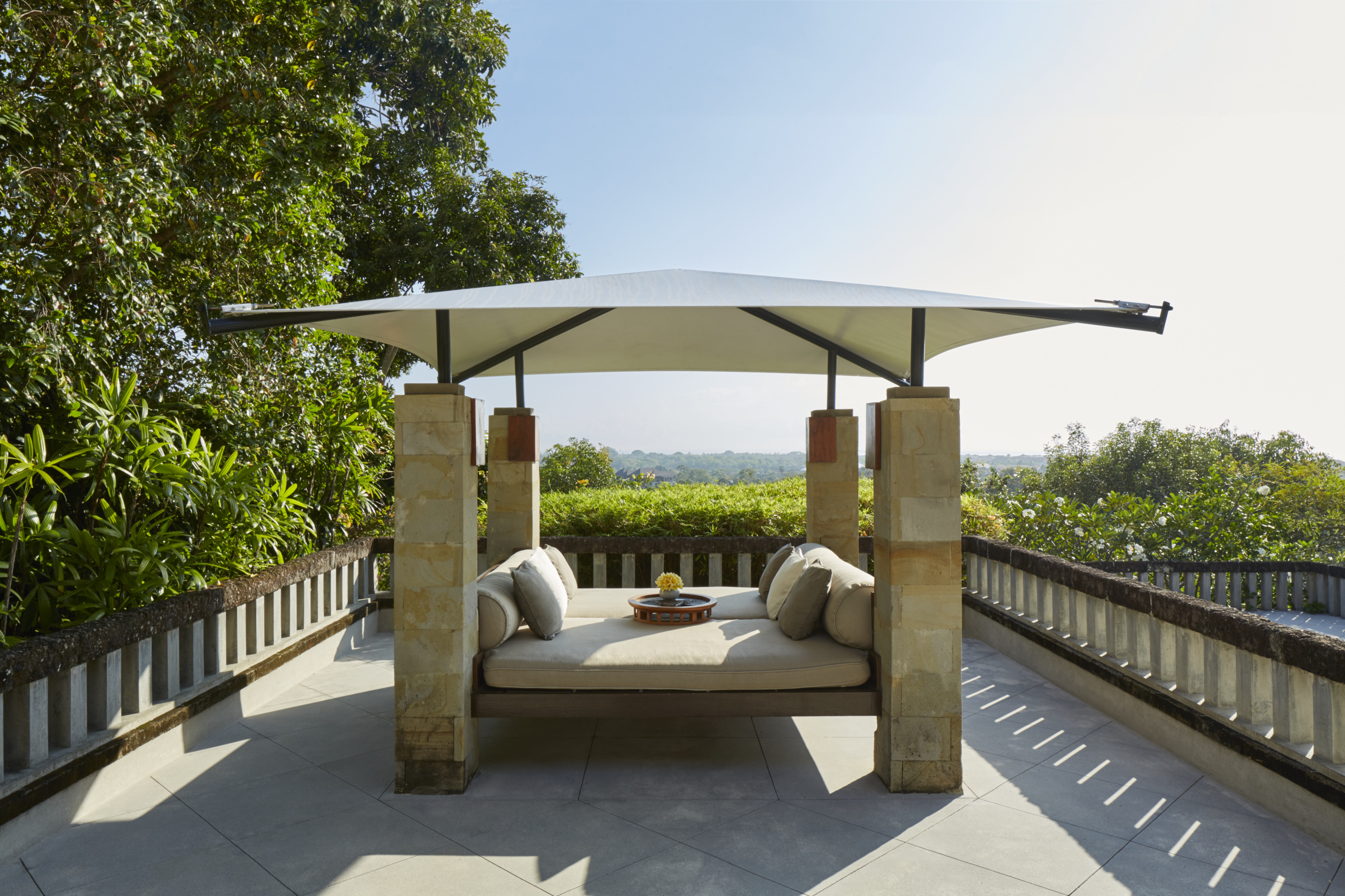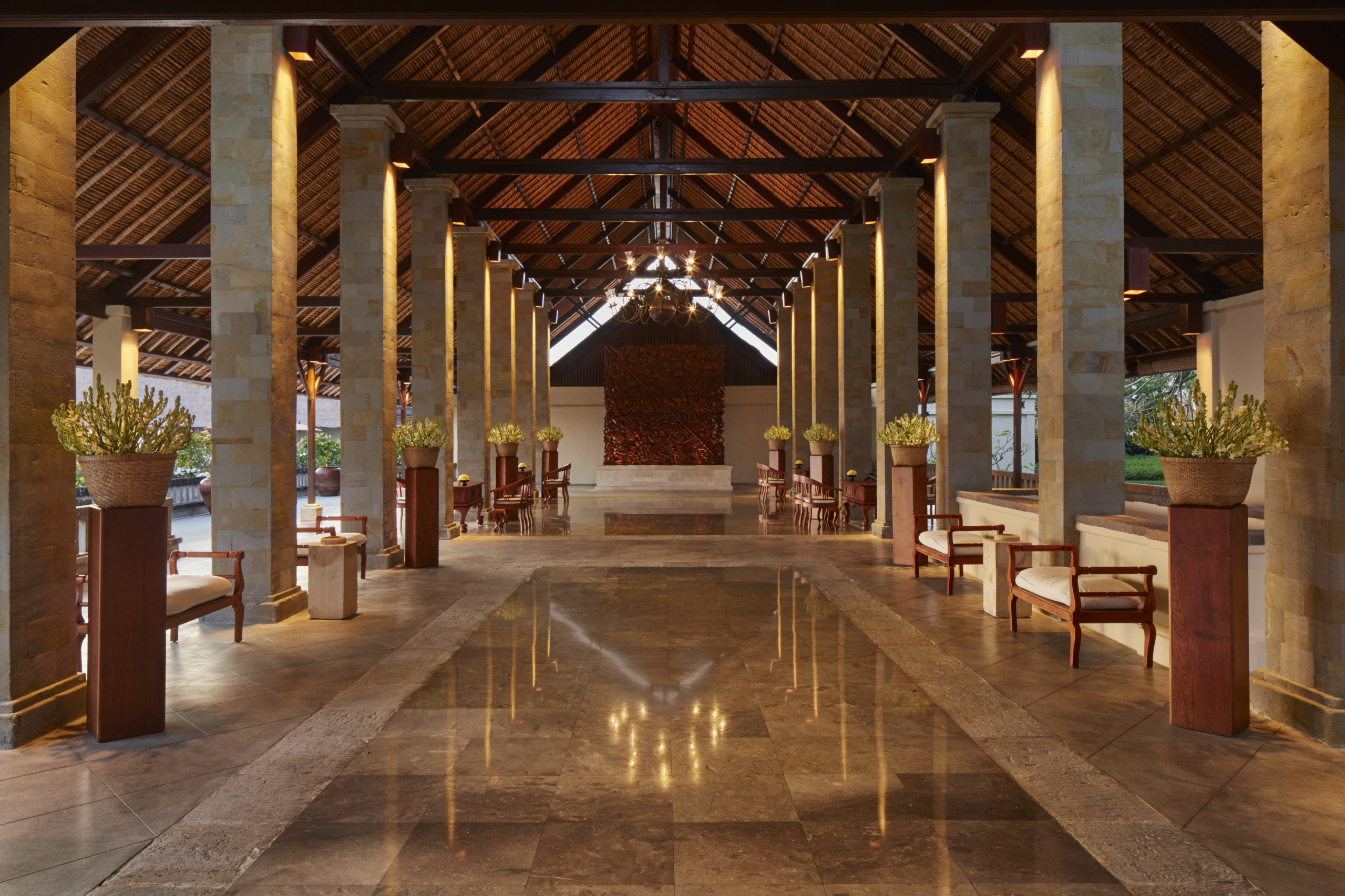 The arrival porte-cochere leads to The Bar and Terrace Restaurant, which enjoy panoramic views and the cool ocean breeze. A colonnade with the Gift Shop, Gallery and Library completes this entry level. The two lower levels house a Boardroom for meetings and The Restaurant with its lofty ceilings and glass panels that look across a lawn to the main Swimming Pool. An informal Beach Club is located on the beachfront approximately 1500 meters from the resort, and consists of private bales with grass thatched roofs and accompanying sun loungers.