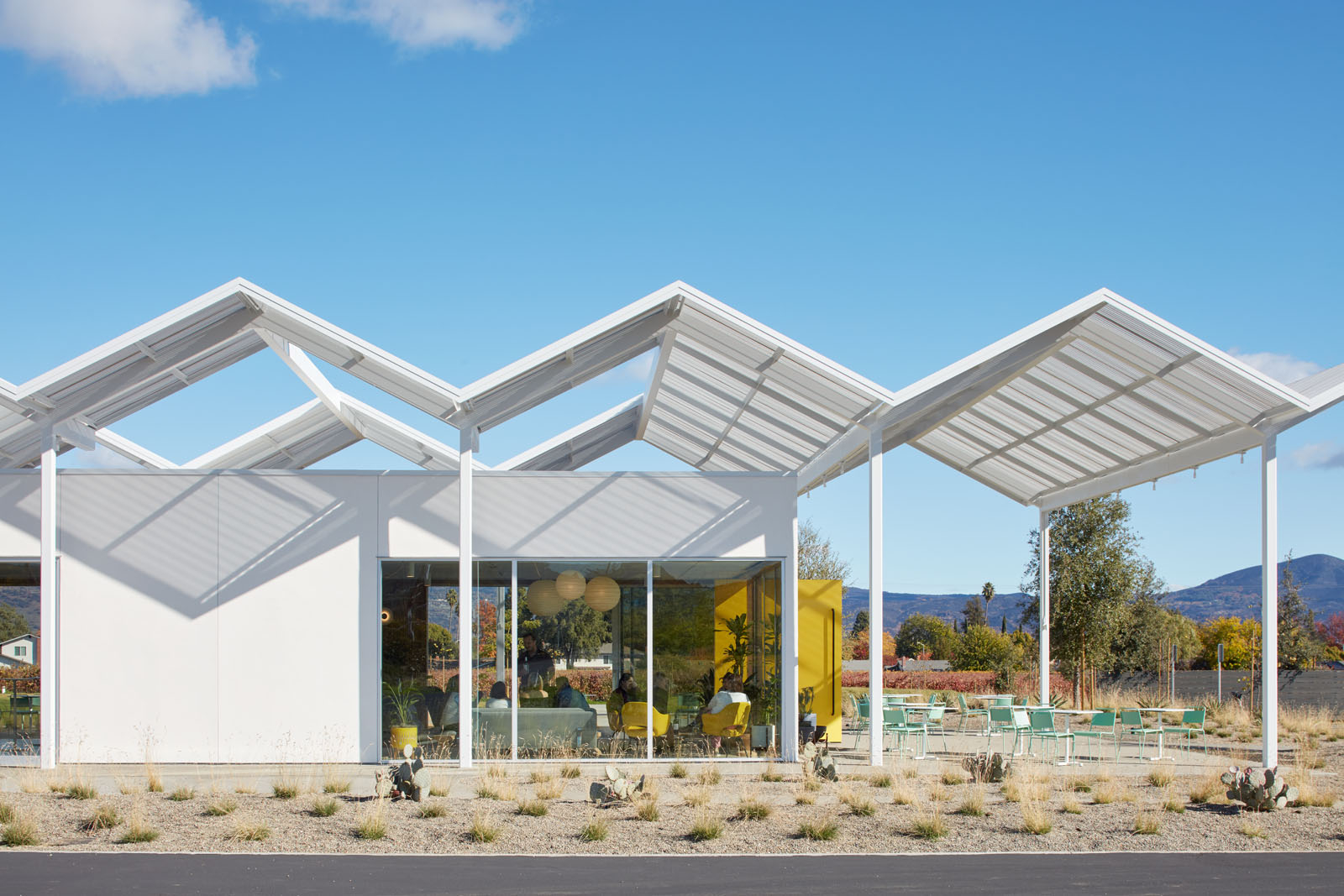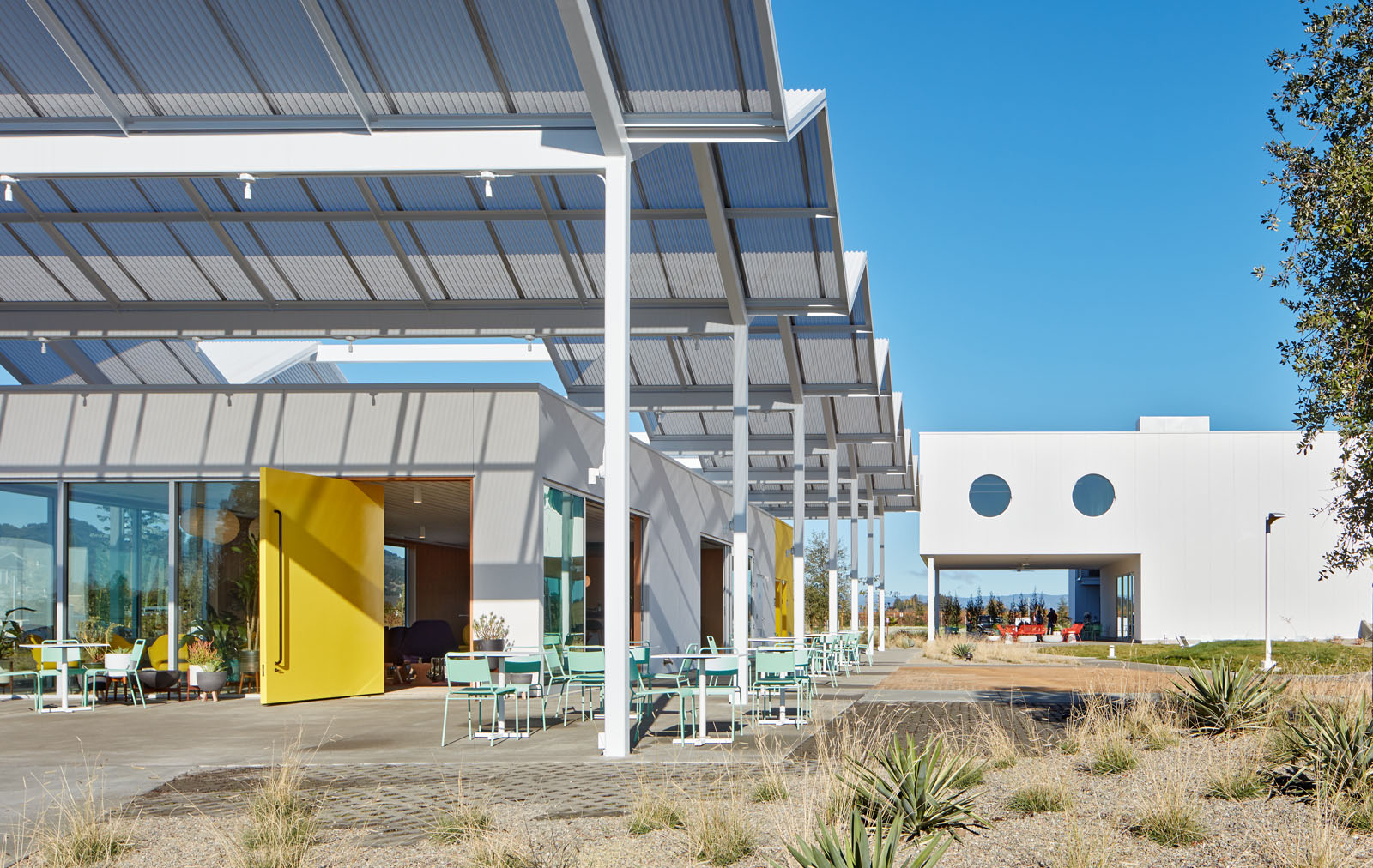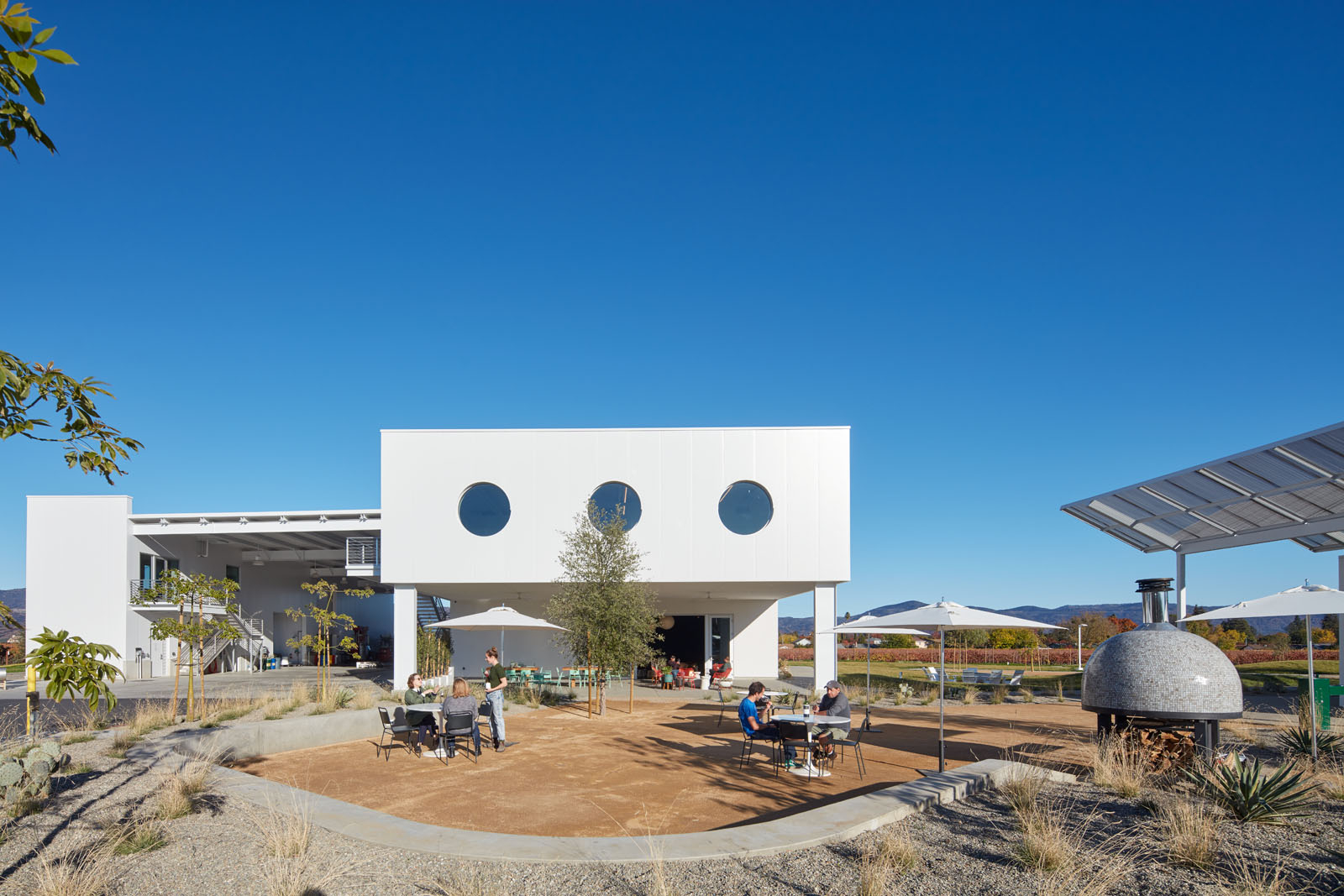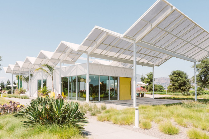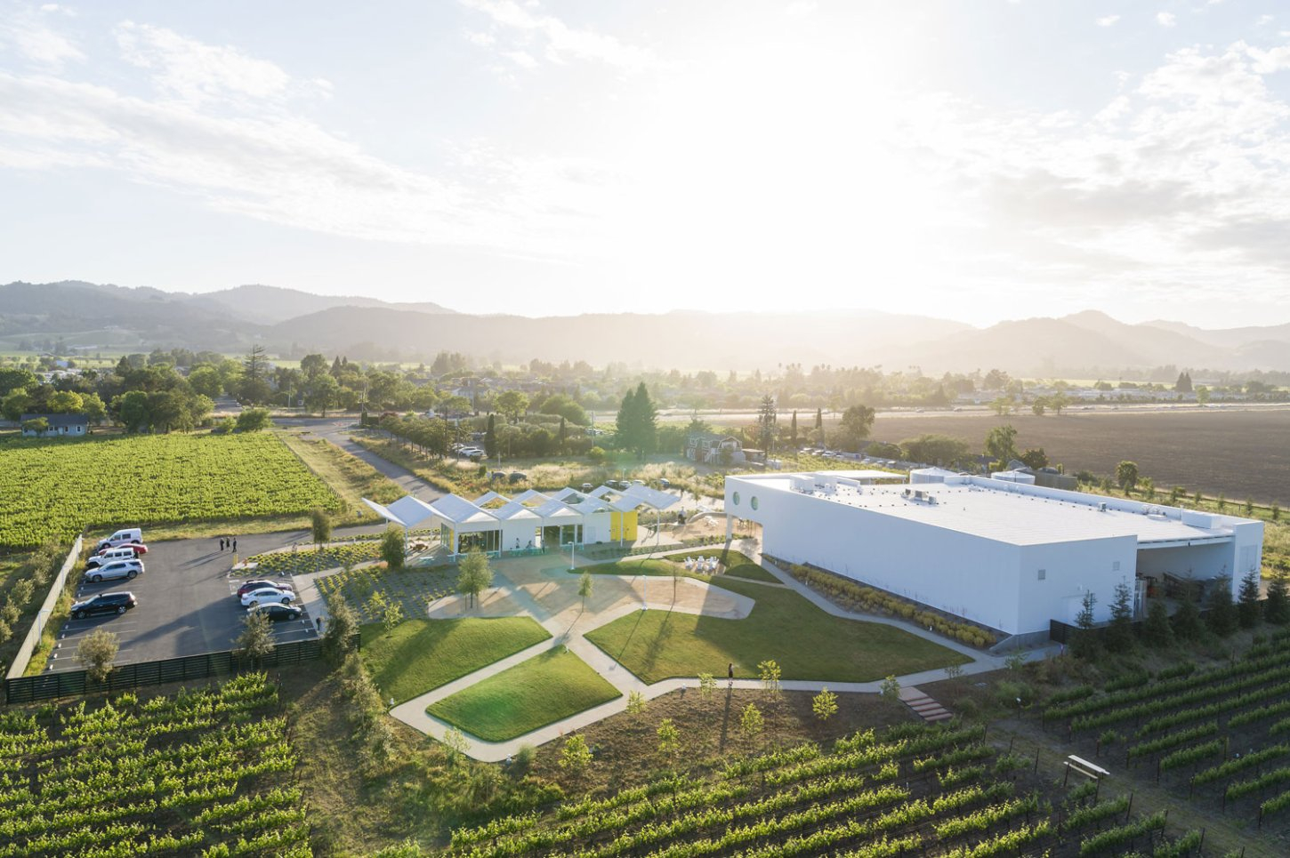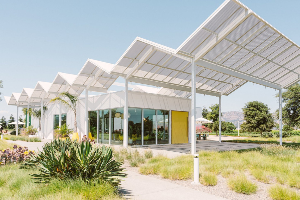 Located at the gateway of Napa Valley along its main artery, Highway 29, Ashes & Diamonds Winery’s mid-century approach extends to its architecture. As an homage, the iconic zig-zag roof and portholes are a few of the iconic references to the heritage of California mid-century modern design, seamlessly integrated with a state-of-the-art wine production facility surrounded by light, airy landscapes and playful, rolling berms.