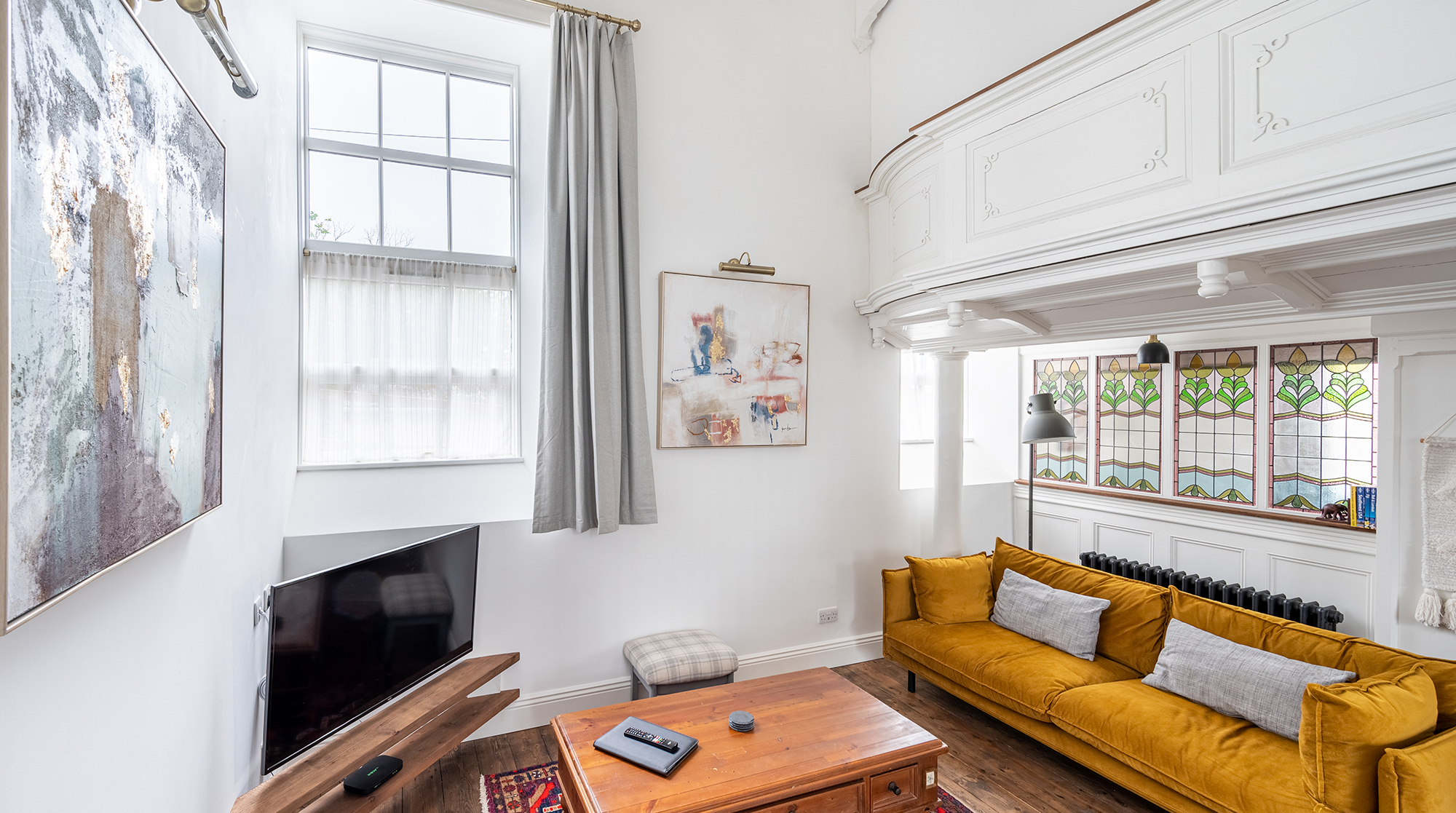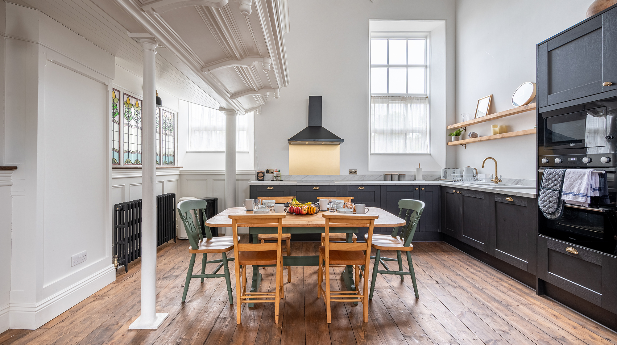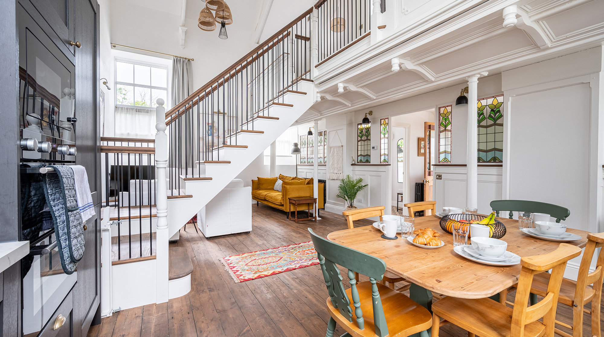 Inside, it's a timeless canvas of high ceilings and hardwood floors. Original features – including pewters, stained glass windows and, though purely decorative, an old church balcony – add bundles of charm while offering a glimpse into the building's storied past. Admire it all from the open-plan living space, snuggled up on the sofa, baking cookies in the fully-equipped kitchen or roosted at the dining table for a delicious home-cooked feast. Outside, the street-facing terrace offers an idyllic spot for sipping tea in the morning sun before a day of exploring.