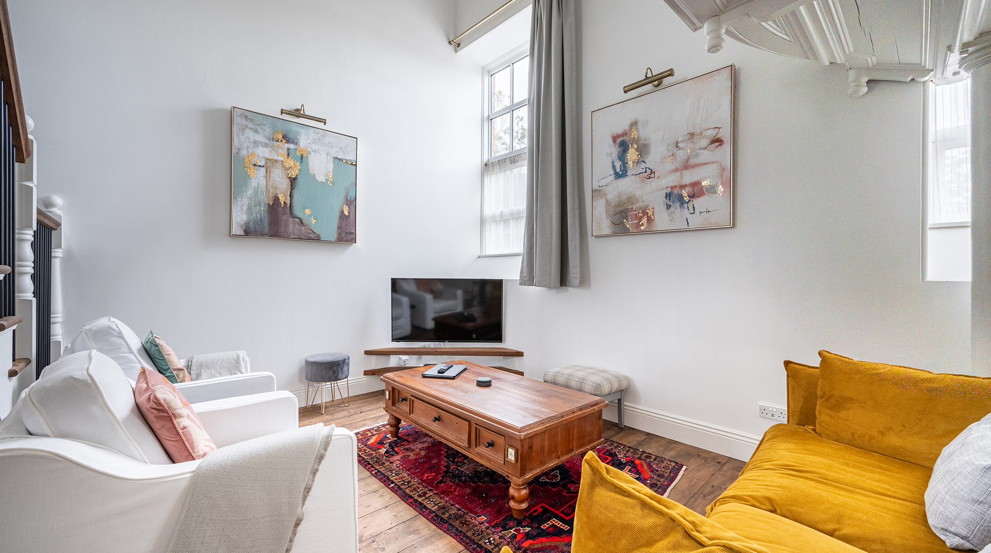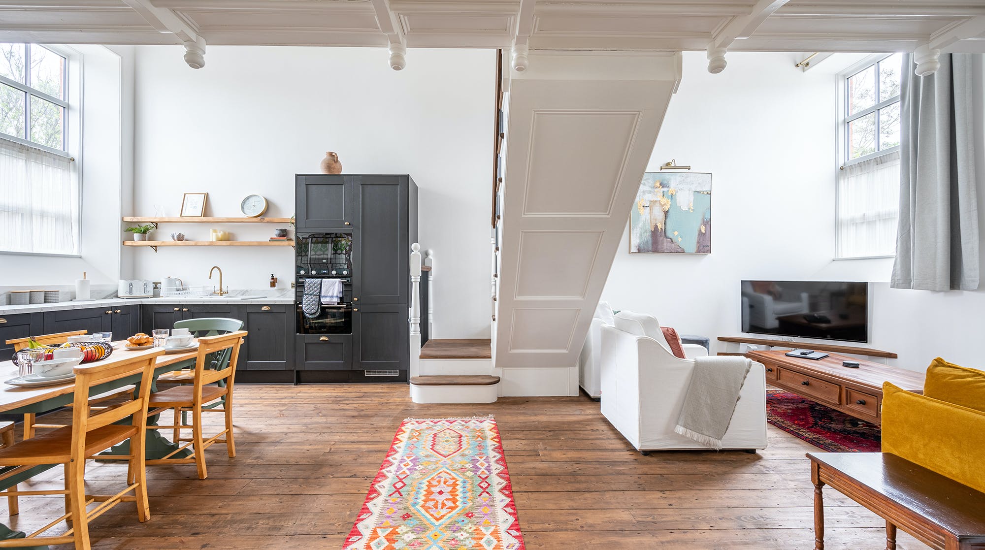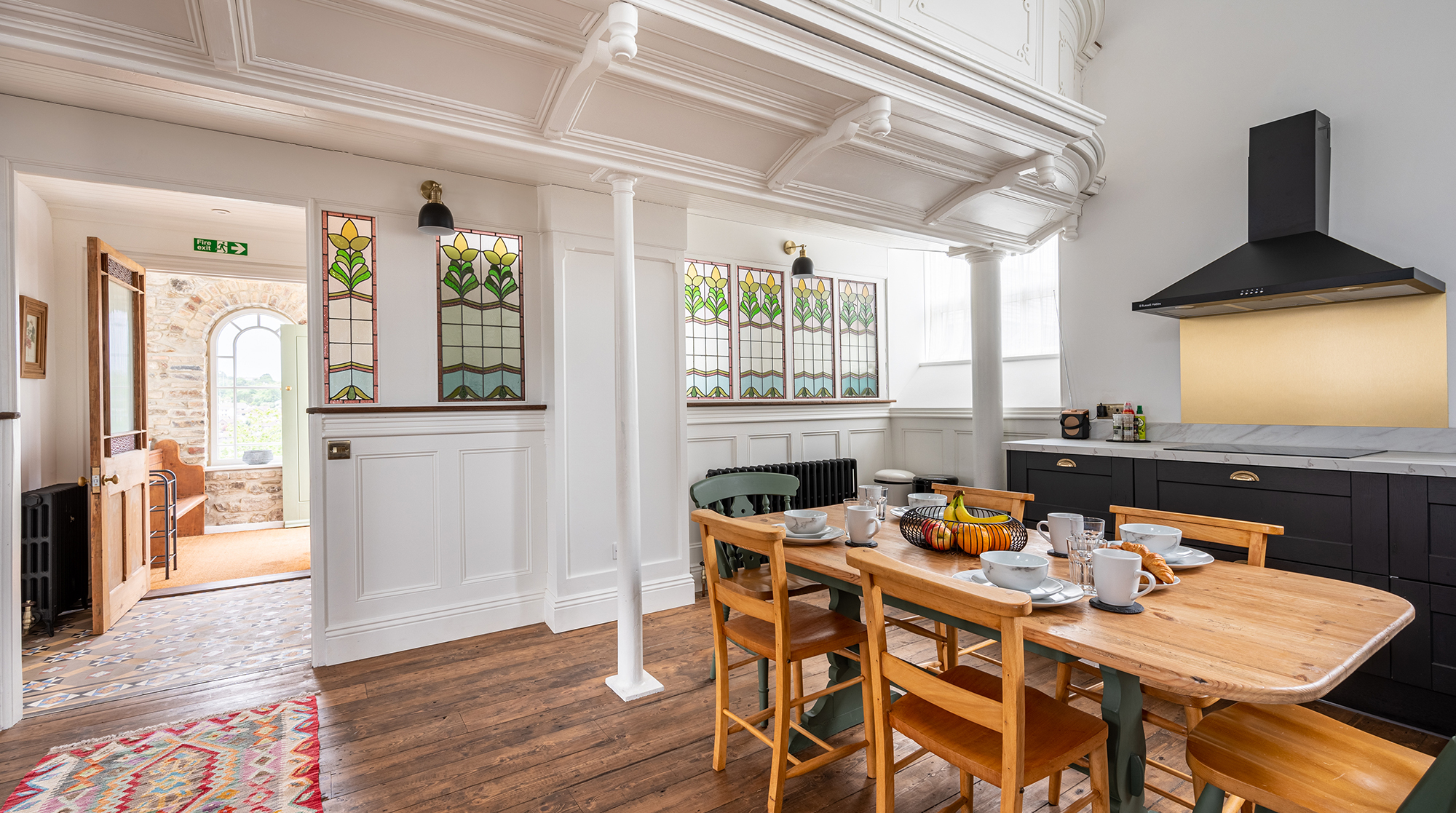 Inside, it's a timeless canvas of high ceilings and hardwood floors. Original features – including pewters, stained glass windows and, though purely decorative, an old church balcony – add bundles of charm while offering a glimpse into the building's storied past. Admire it all from the open-plan living space, snuggled up on the sofa, baking cookies in the fully-equipped kitchen or roosted at the dining table for a delicious home-cooked feast. Outside, the street-facing terrace offers an idyllic spot for sipping tea in the morning sun before a day of exploring.