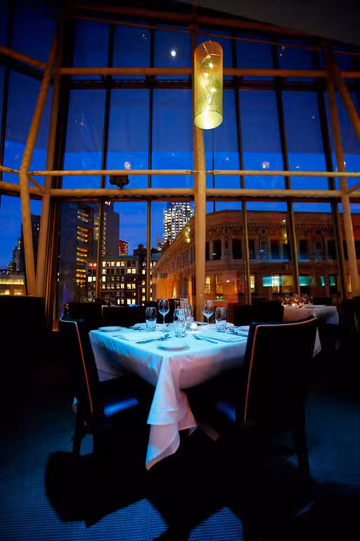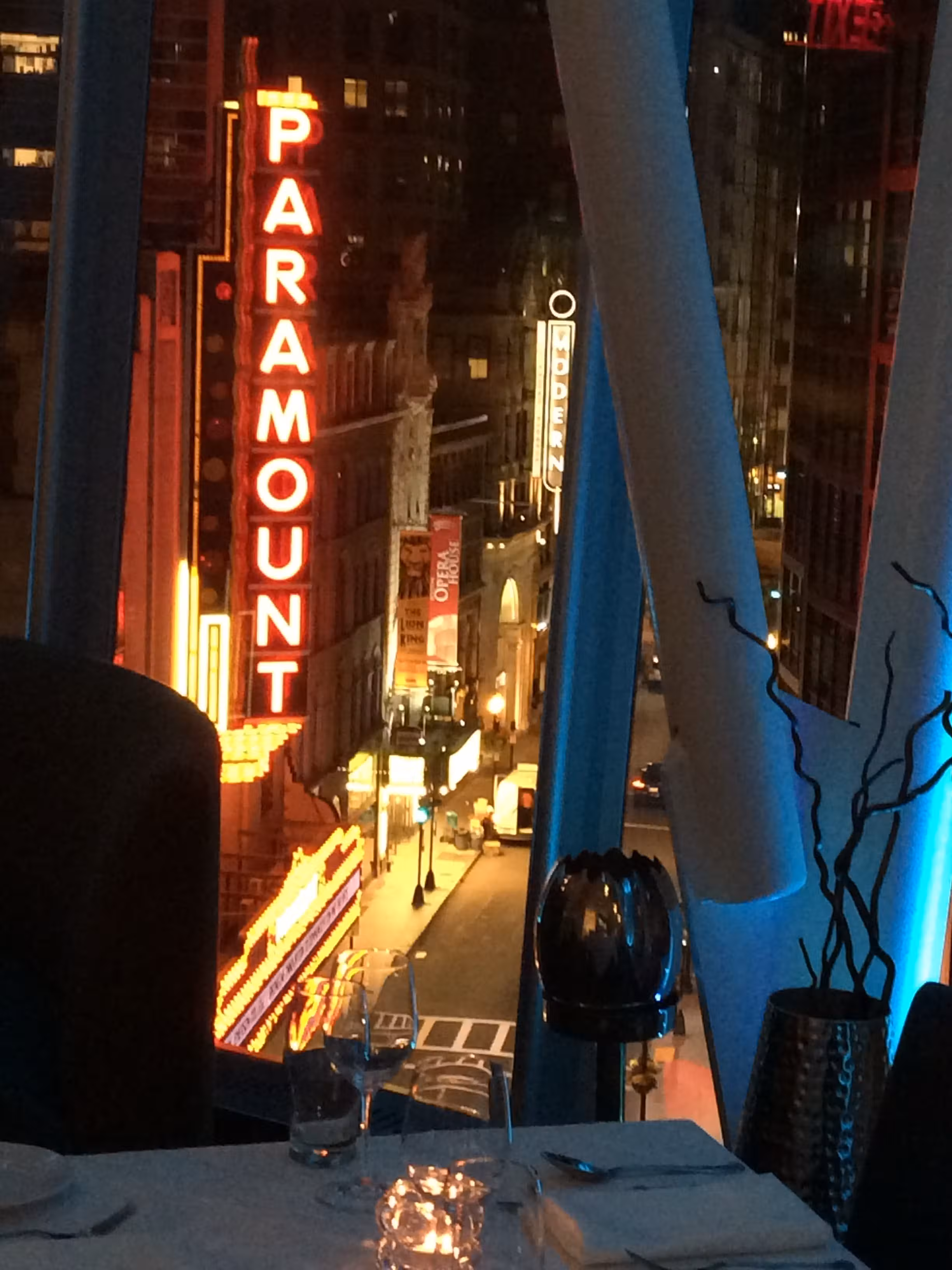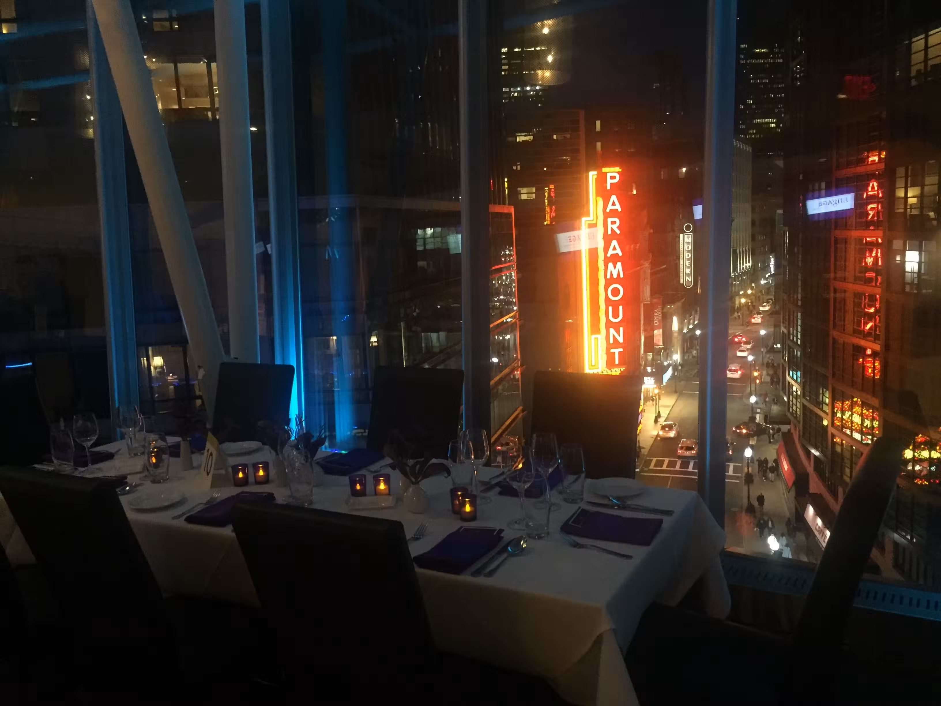 Views of the Paramount sign on Washington Street reminds one of a little Times Square. Floor to ceiling blu lights and all around glass windows make a perfect ambience to celebrate a special occasion and act as a perfect background for pictures. Enjoy our fresh seasonal menu like our Sirloin Steak and Rack of Lamb. Vegan and vegetarian options are also available and it’s very gluten free friendly.Blu Restaurant and Bar is located on the 4th Floor of the Ritz Carlton Complex, inside of EquinoxSports Club. WINDOW SEATING IS NOT RESERVABLE AND GUARANTEED, IT’S FIRST COME FIRST SERVED. WE STRONGLY SUGGEST A 2 HOUR WINDOW WHEN DINING WITH US, ESPECIALLY IF ATTENDING THE THEATERS NEARBY AS WE ARE COMPLETEALY BOOKED DURING THOSE TIMES. WE ARE ONLY ABLE TO HOLD A TABLE FOR 15 MINUTES.