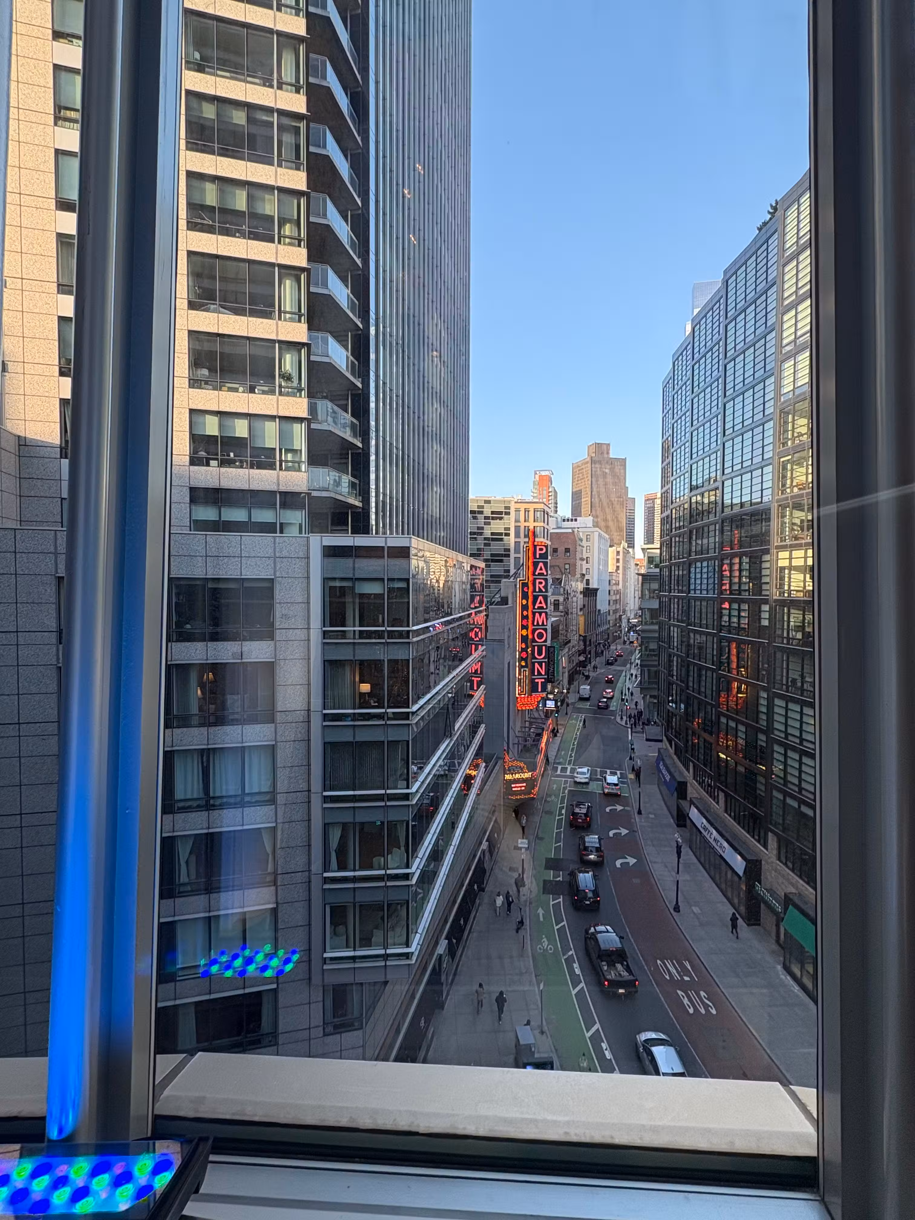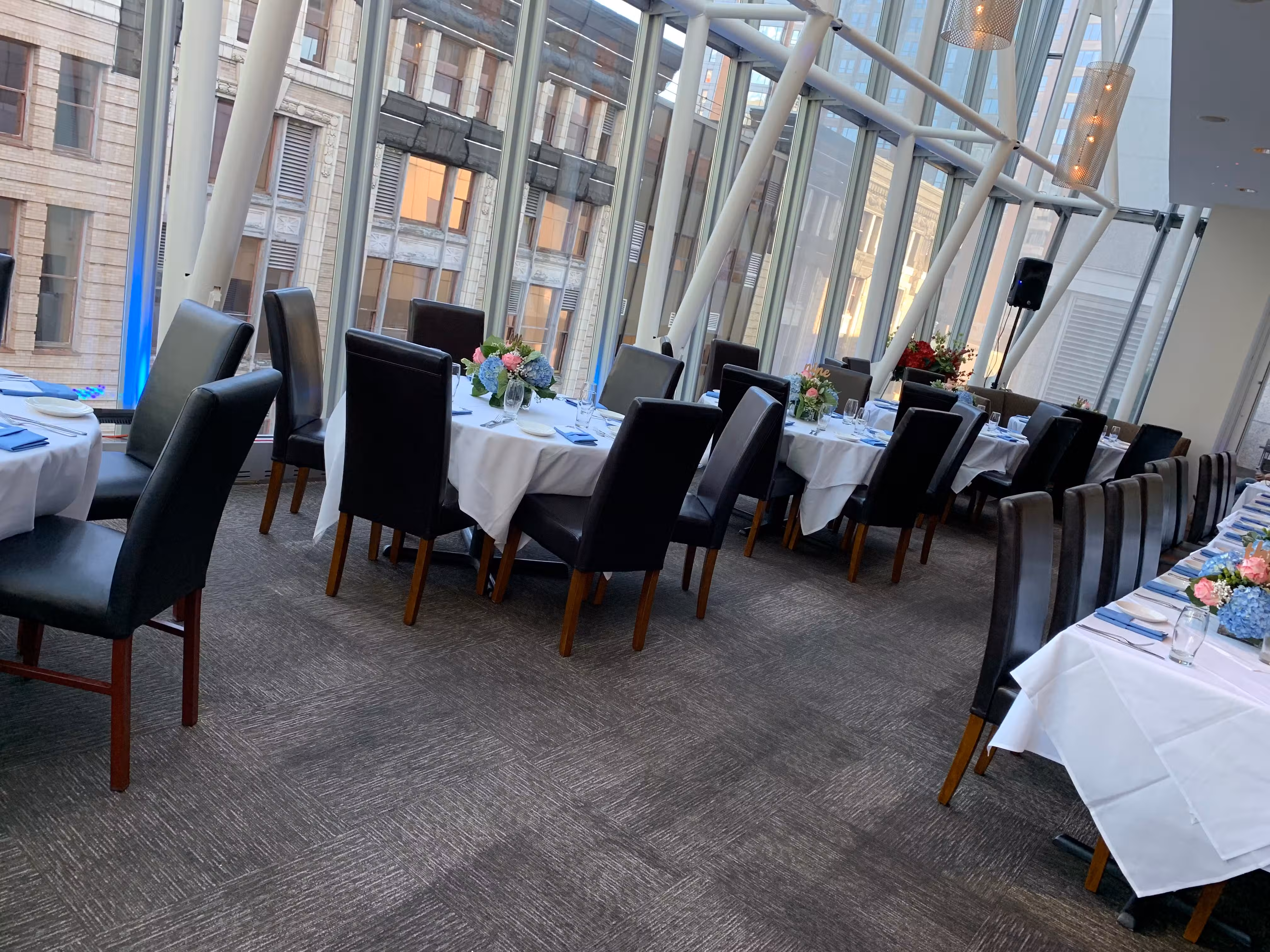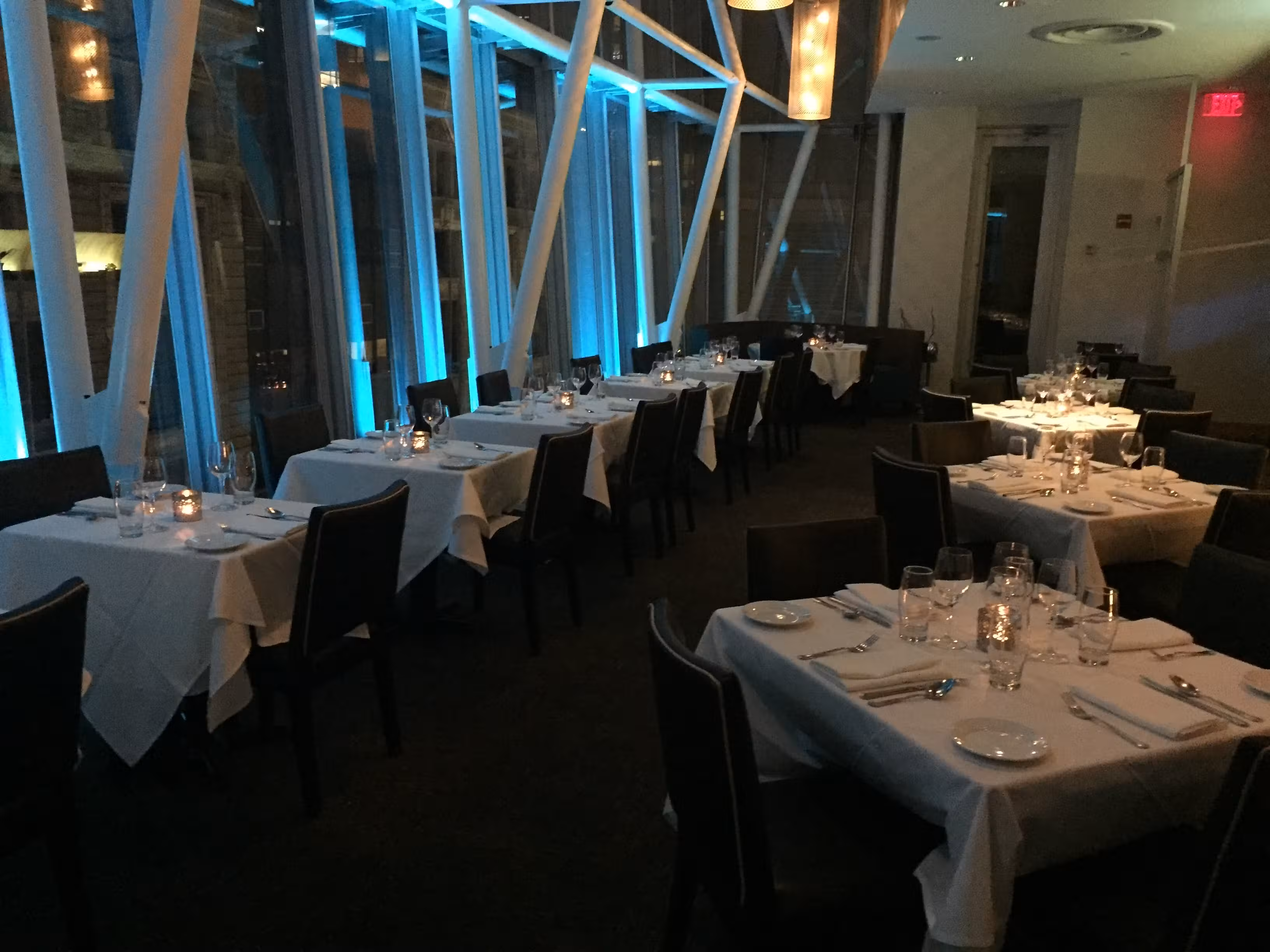 Views of the Paramount sign on Washington Street reminds one of a little Times Square. Floor to ceiling blu lights and all around glass windows make a perfect ambience to celebrate a special occasion and act as a perfect background for pictures. Enjoy our fresh seasonal menu like our Sirloin Steak and Rack of Lamb. Vegan and vegetarian options are also available and it’s very gluten free friendly.Blu Restaurant and Bar is located on the 4th Floor of the Ritz Carlton Complex, inside of EquinoxSports Club. WINDOW SEATING IS NOT RESERVABLE AND GUARANTEED, IT’S FIRST COME FIRST SERVED. WE STRONGLY SUGGEST A 2 HOUR WINDOW WHEN DINING WITH US, ESPECIALLY IF ATTENDING THE THEATERS NEARBY AS WE ARE COMPLETEALY BOOKED DURING THOSE TIMES. WE ARE ONLY ABLE TO HOLD A TABLE FOR 15 MINUTES.