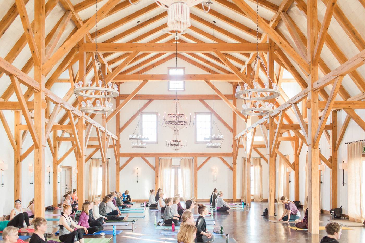 Beautiful, rustic rope chandeliers and circular, wooden pendant lights hang from the ceiling, while iron sconces illuminate the walls.