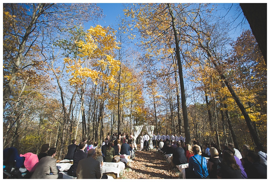 The secluded ceremony site is a clearing in the the woods which grow on a ridge with dramatic drops on either side covered with trillium in the spring.