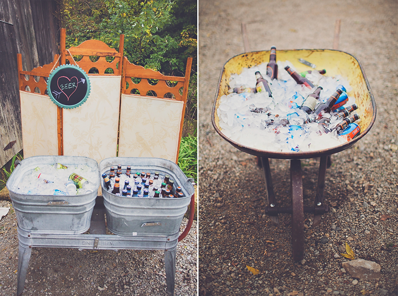 The reception area is in the upper bank barn and the original barn doors open to a rustic space dressed with large cotton drapes.