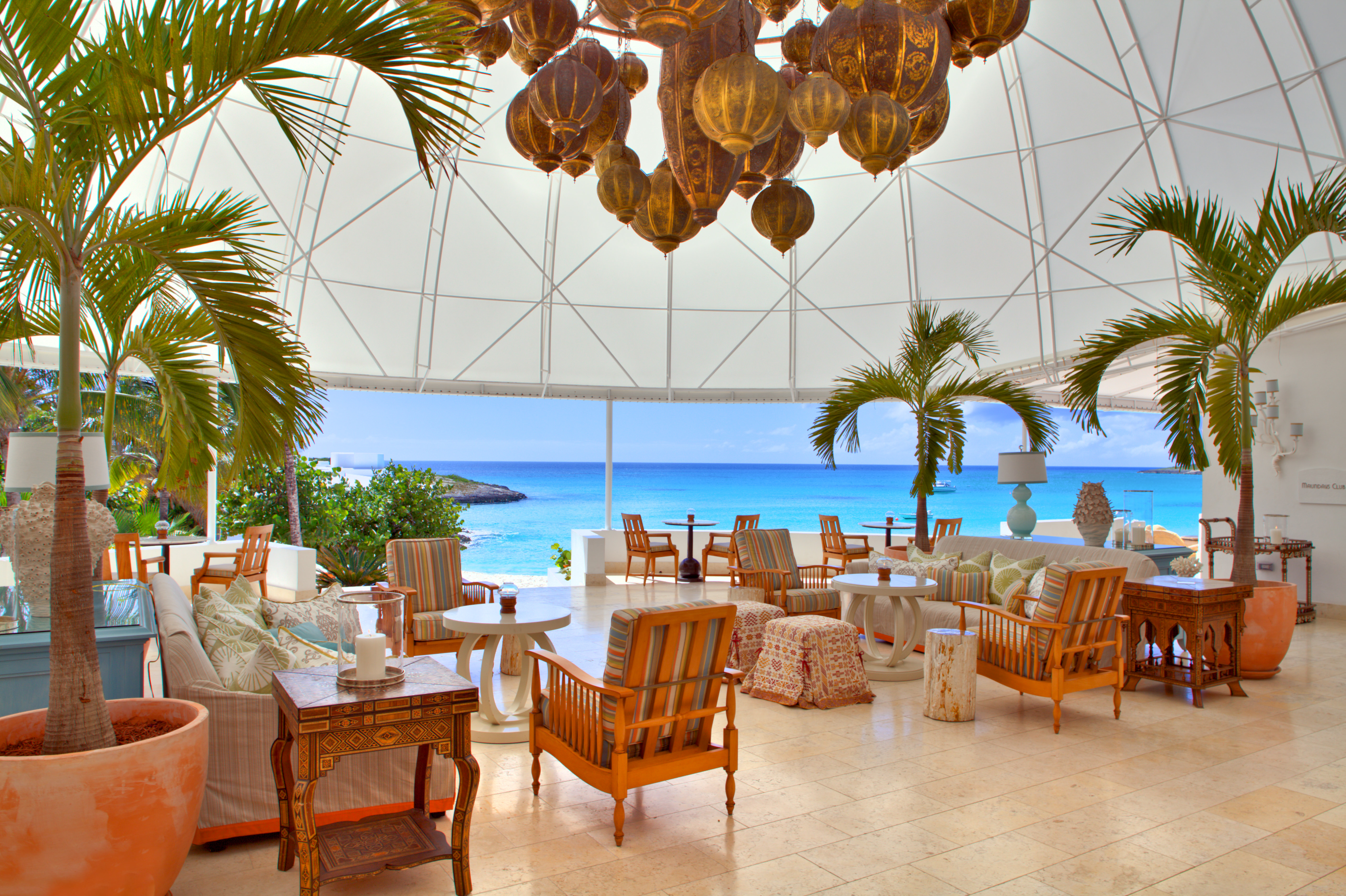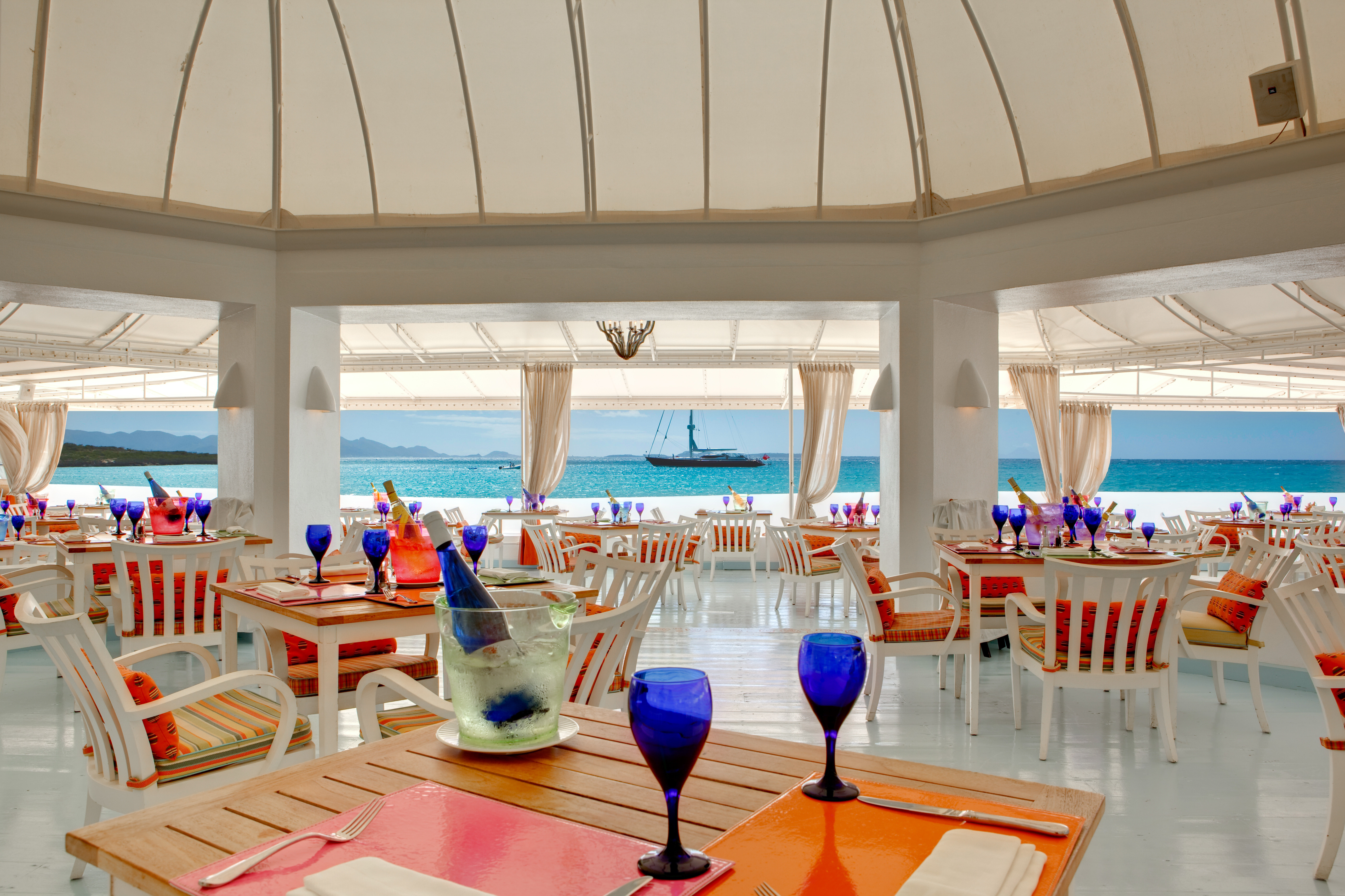 Blue, with its breathtaking panoramic views of St. Maarten and the Caribbean Sea, has been recently refurbished with a bright white and pale azure backdrop accented with bright sorbet-colored chairs.