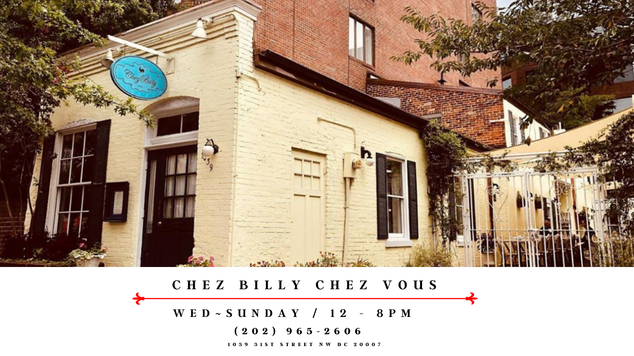 Welcome to Chez Billy Sud, your classic neighborhood French bistro in the heart of historic Georgetown! We accept reservations on a rolling 30 day basis. Reservations can be made for parties up to 6 guests for bistro dining. Our private dining room can be reserved for large parties (7-16 guests) by contacting our event coordinator at events@chezbillysud.com. For general inquiries, please contact us at info@chezbillysud.com.Depending on the weather, our patio is available on a first-come basis. Please check with your host upon arrival for patio seating.Our Bar à Vin (located right next door) is open for dinner and drinks 7 days a week and requires no reservations. Please visit our website ChezBillySud.com or check us out on Instagram @ChezBillySud.We look to hosting you!