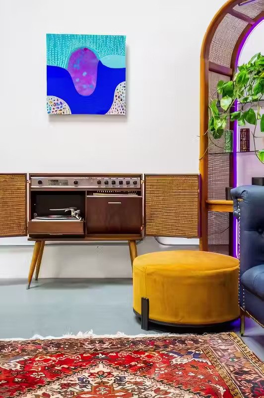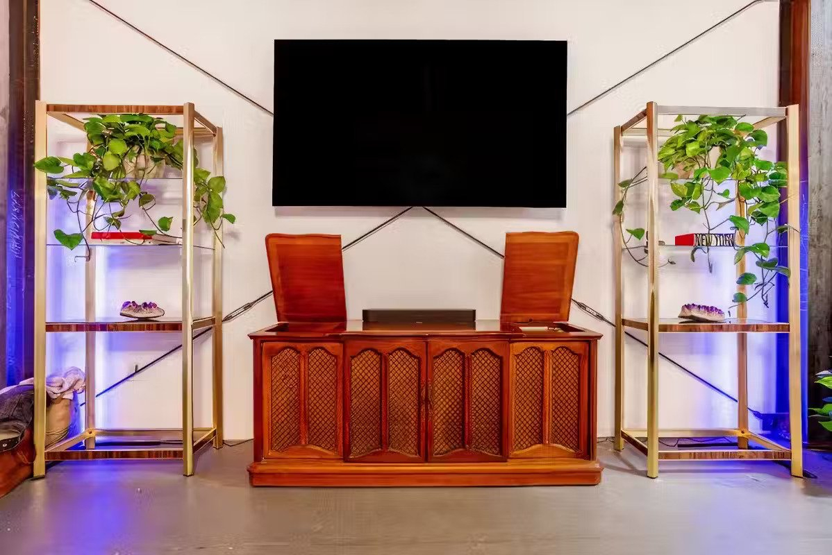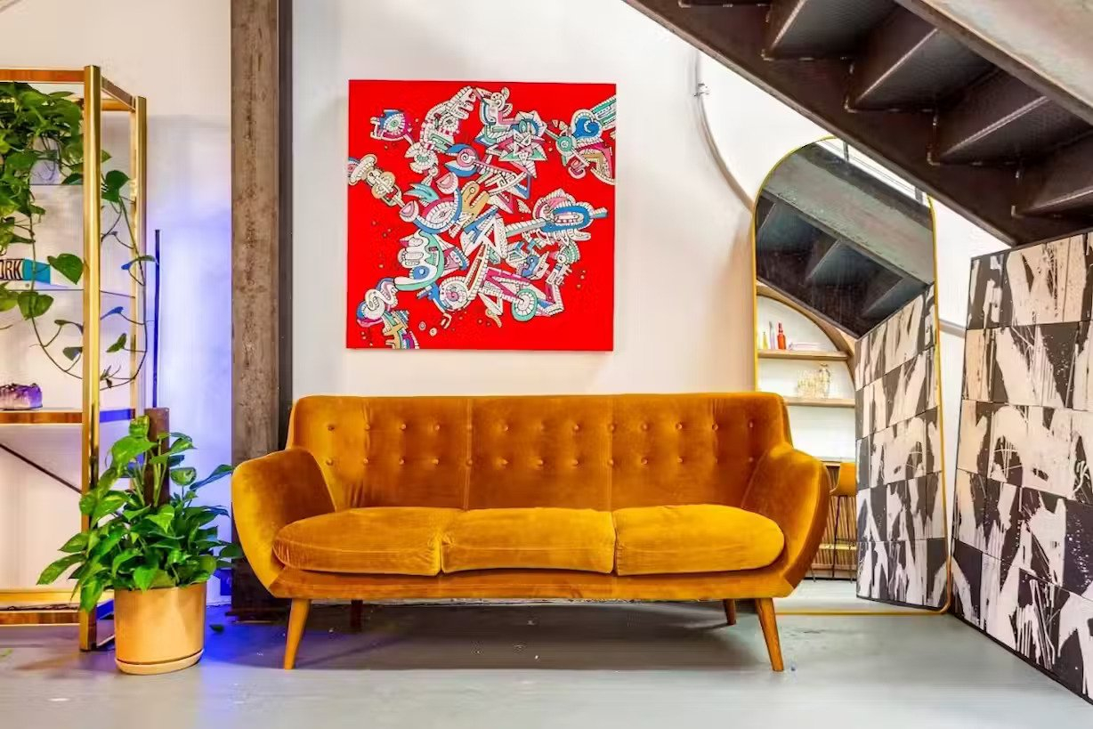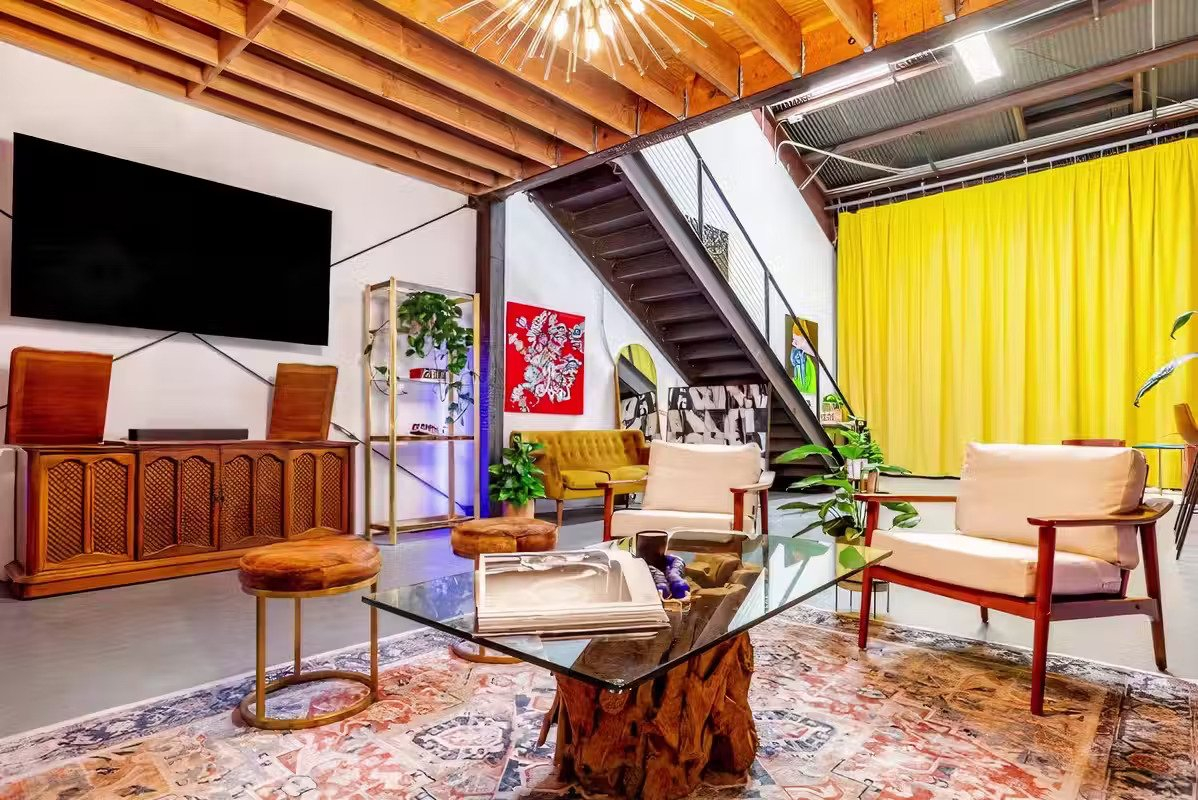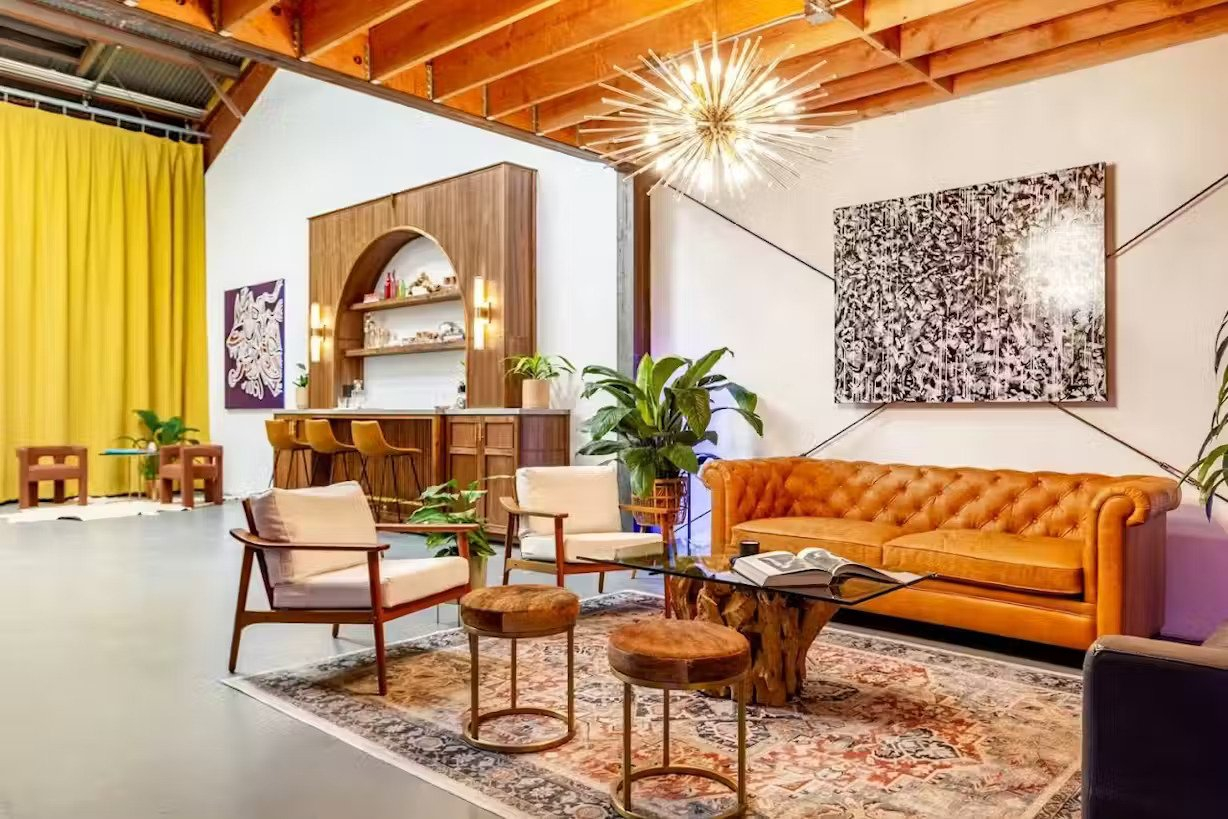 Immerse yourself in the unique ambiance of our living room, featuring a comfortable couch, chair, and table. As part of our commitment to the Venice art community, creatives, and entrepreneurs, Create Studios proudly showcases a revolving collection of vintage items, vinyl, and art by renowned and emerging local artists.