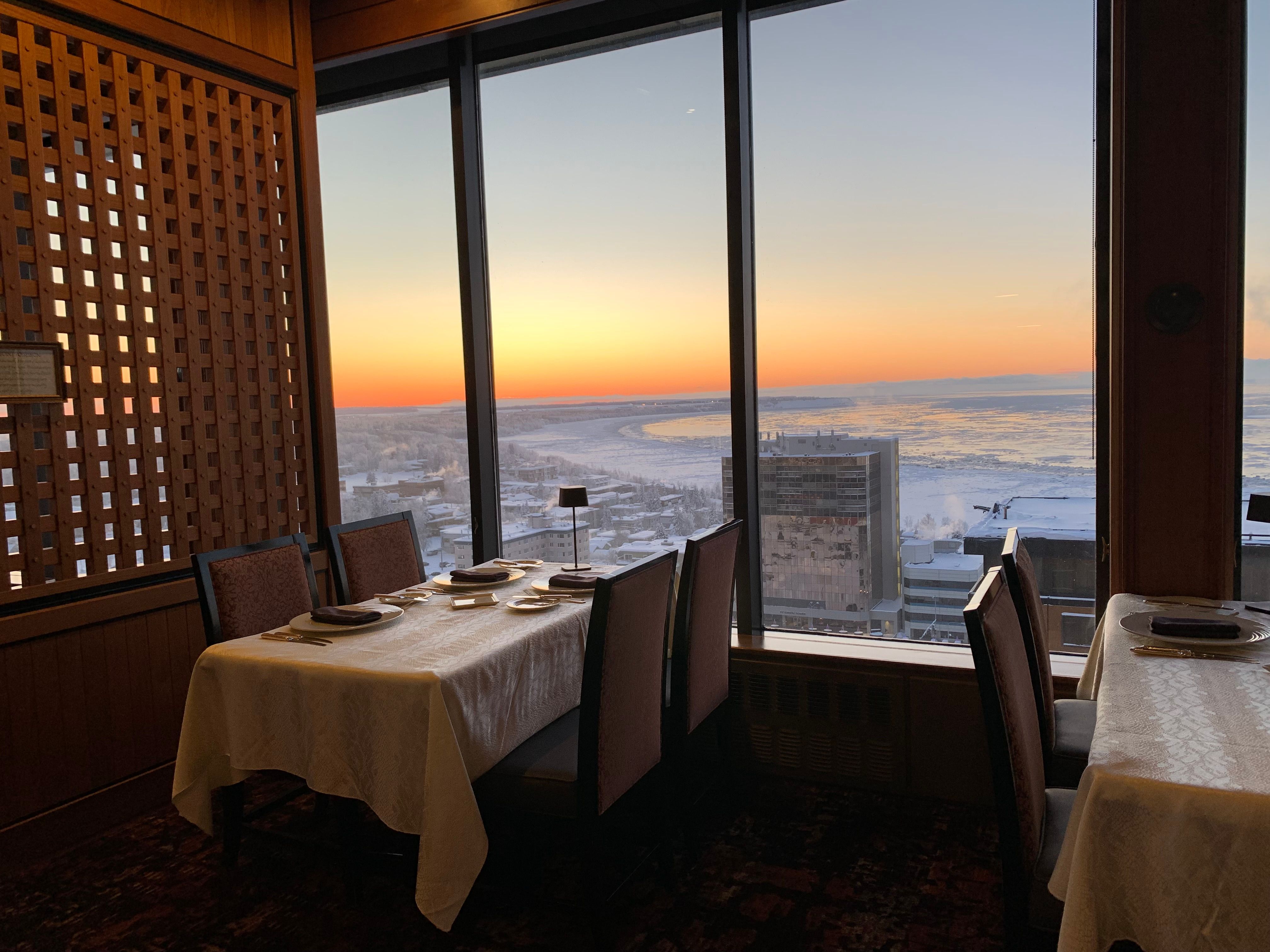 Innovative French and New American cuisine, paired with an outstanding selection of over 10,000 bottles of wine. 360 degree views of downtown Anchorage, Chugach Mountain Range and Cook Inlet. Experience Alaska’s finest, at the Hotel Captain Cook. Dining room is reserved for guest who want the full dining experience. Our bar and lounge offers open seating for guests. All guests for be of 16 years or older to dine in our bar and lounge.