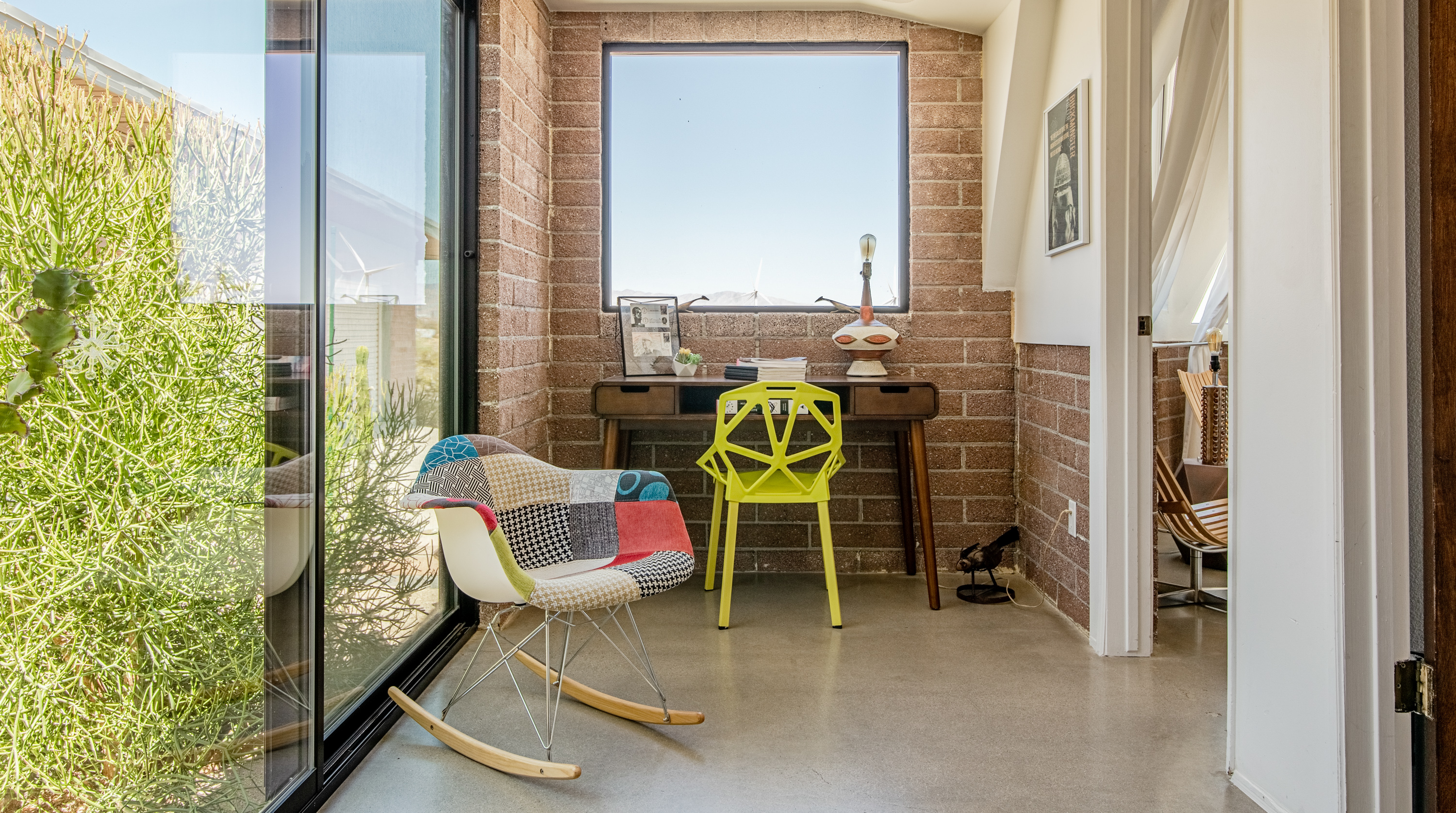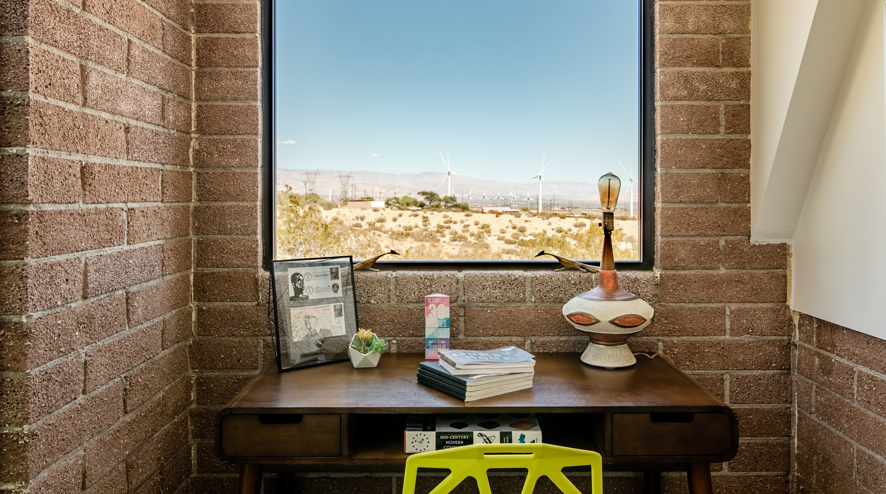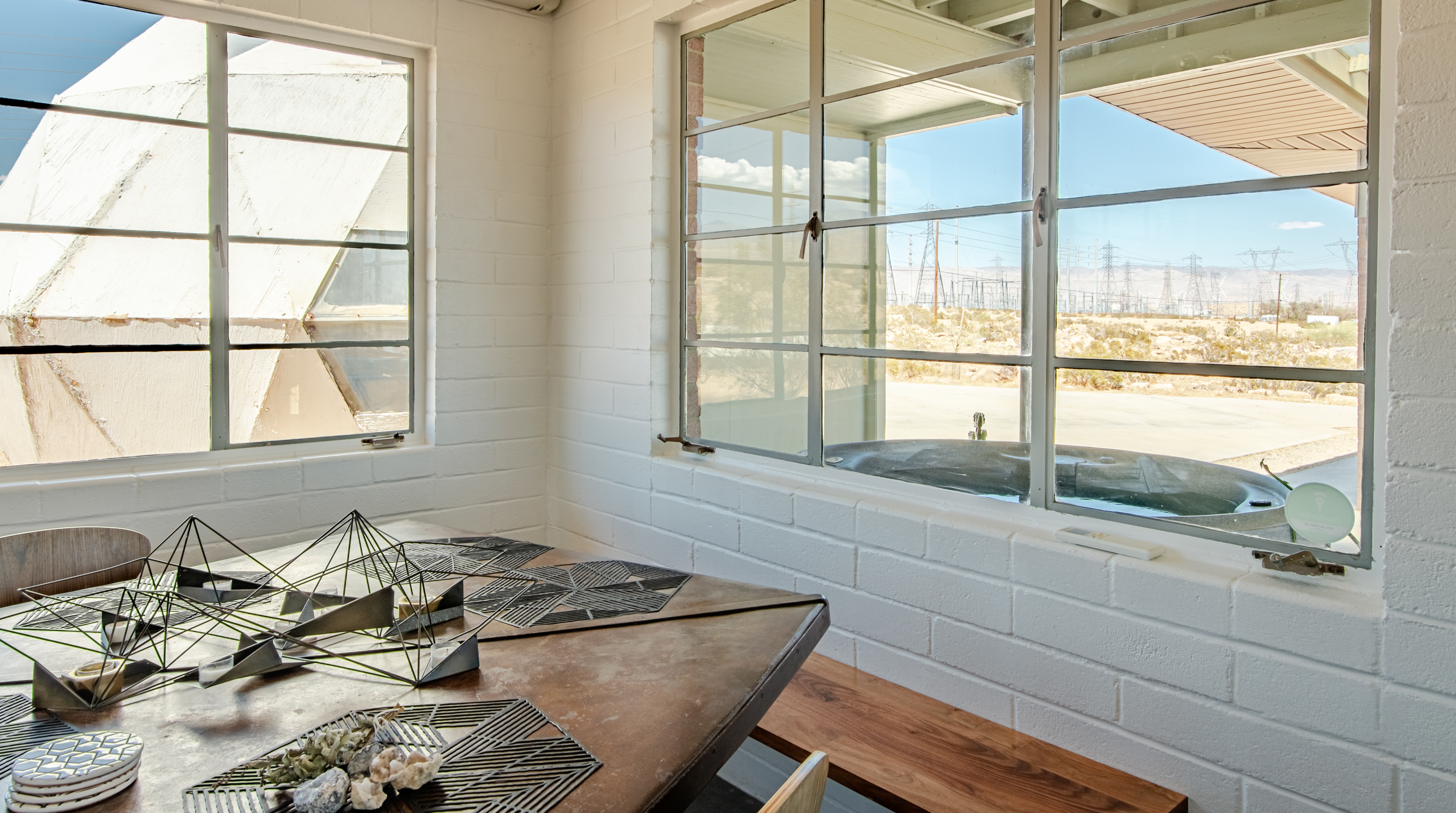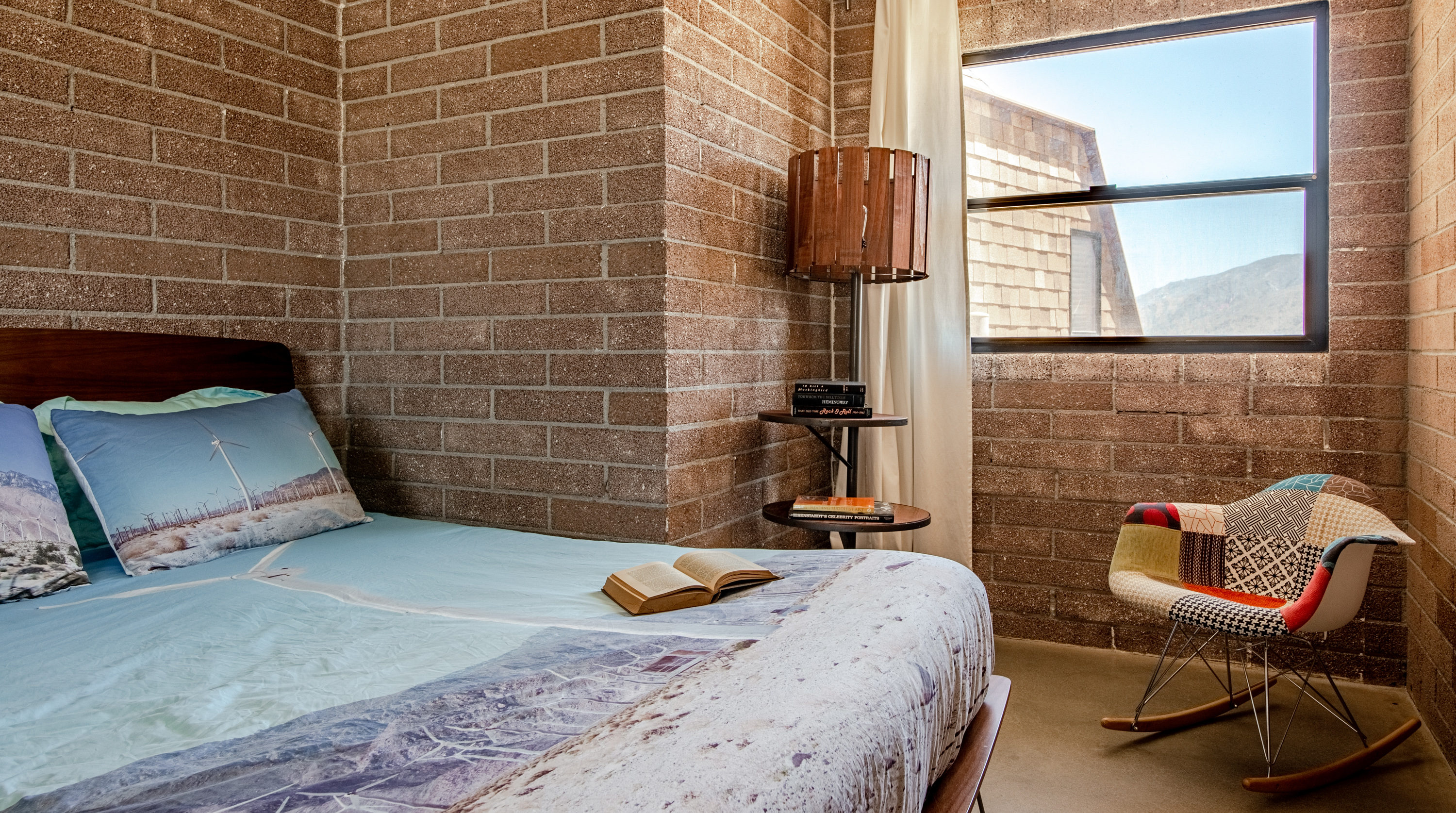 Like a spaceship that's just landed in the desert, this home is an extraordinary stay. Surrounded by hundreds of windmills, the rugged San Jacinto mountains and expansive valley views, the most dominating element of this home is dome-shaped annexe with expansive windows offering unbeatable, panoramic views. Inside, the owners have gone to town with the otherworldly theme. In the kitchen, sleek metal kitchen countertops like the exterior of a rocket ship are paired back by warm brick walls. In the living room, egg shaped chairs sit opposite a honeycombed bookshelf, with a wood-and-metal floating spiral staircase that leads up to the loft bedroom. All three bedrooms have deluxe double beds, luxurious bathrooms with walk-in showers, and uninterrupted desert views. Joshua Tree National Park - and its miles of remote hiking routes - is at your fingertips, or if you're ready to re-enter reality, Downtown Palm Springs, with its glitzy shops and trendy restaurants, is a short drive away.
