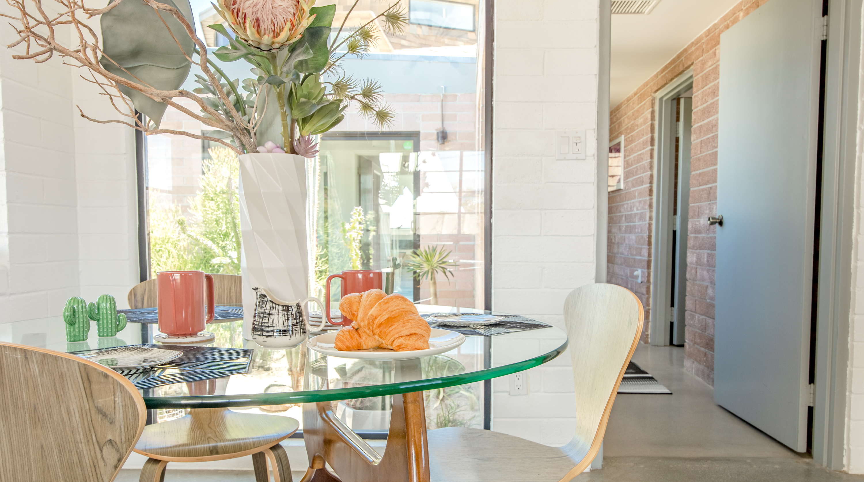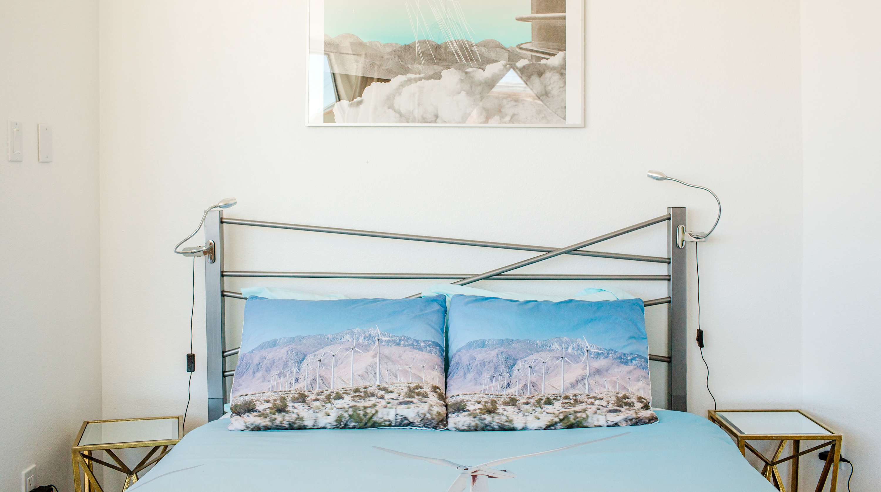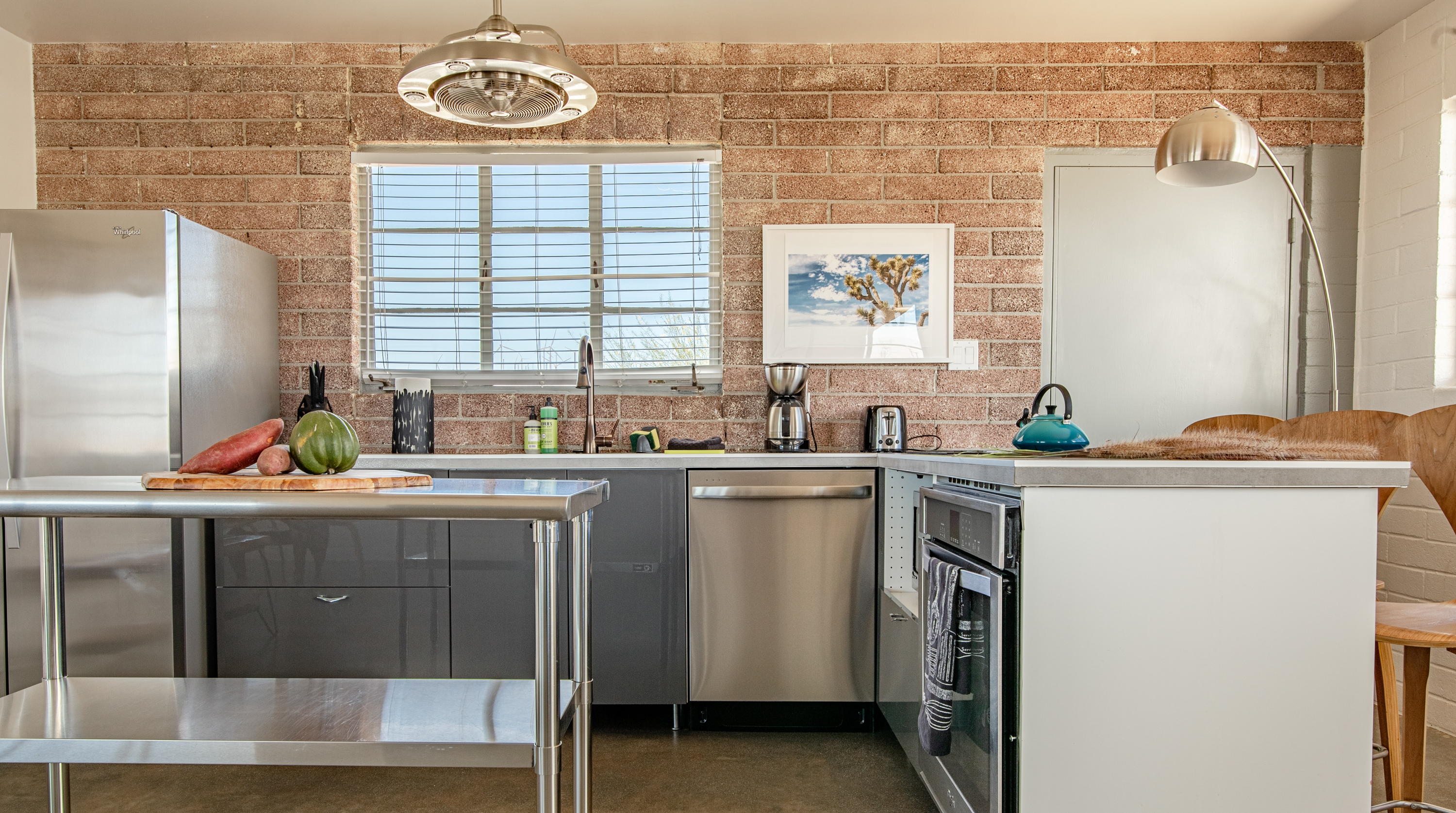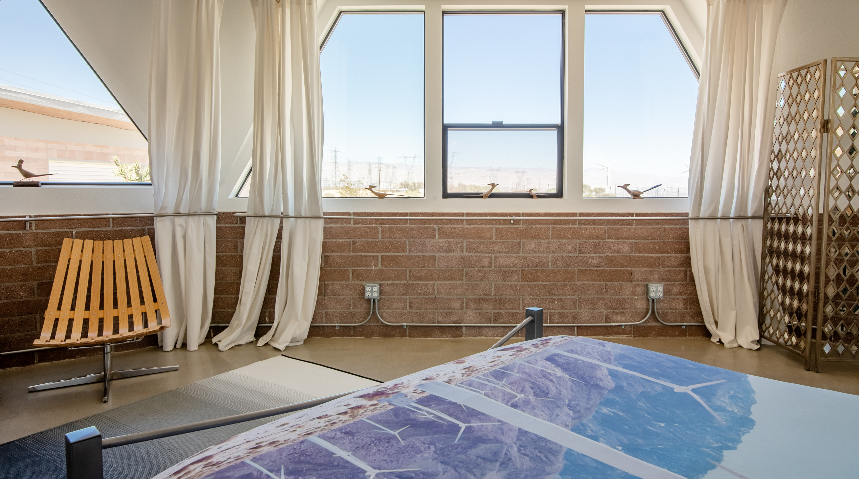 Like a spaceship that's just landed in the desert, this home is an extraordinary stay. Surrounded by hundreds of windmills, the rugged San Jacinto mountains and expansive valley views, the most dominating element of this home is dome-shaped annexe with expansive windows offering unbeatable, panoramic views. Inside, the owners have gone to town with the otherworldly theme. In the kitchen, sleek metal kitchen countertops like the exterior of a rocket ship are paired back by warm brick walls. In the living room, egg shaped chairs sit opposite a honeycombed bookshelf, with a wood-and-metal floating spiral staircase that leads up to the loft bedroom. All three bedrooms have deluxe double beds, luxurious bathrooms with walk-in showers, and uninterrupted desert views. Joshua Tree National Park - and its miles of remote hiking routes - is at your fingertips, or if you're ready to re-enter reality, Downtown Palm Springs, with its glitzy shops and trendy restaurants, is a short drive away.