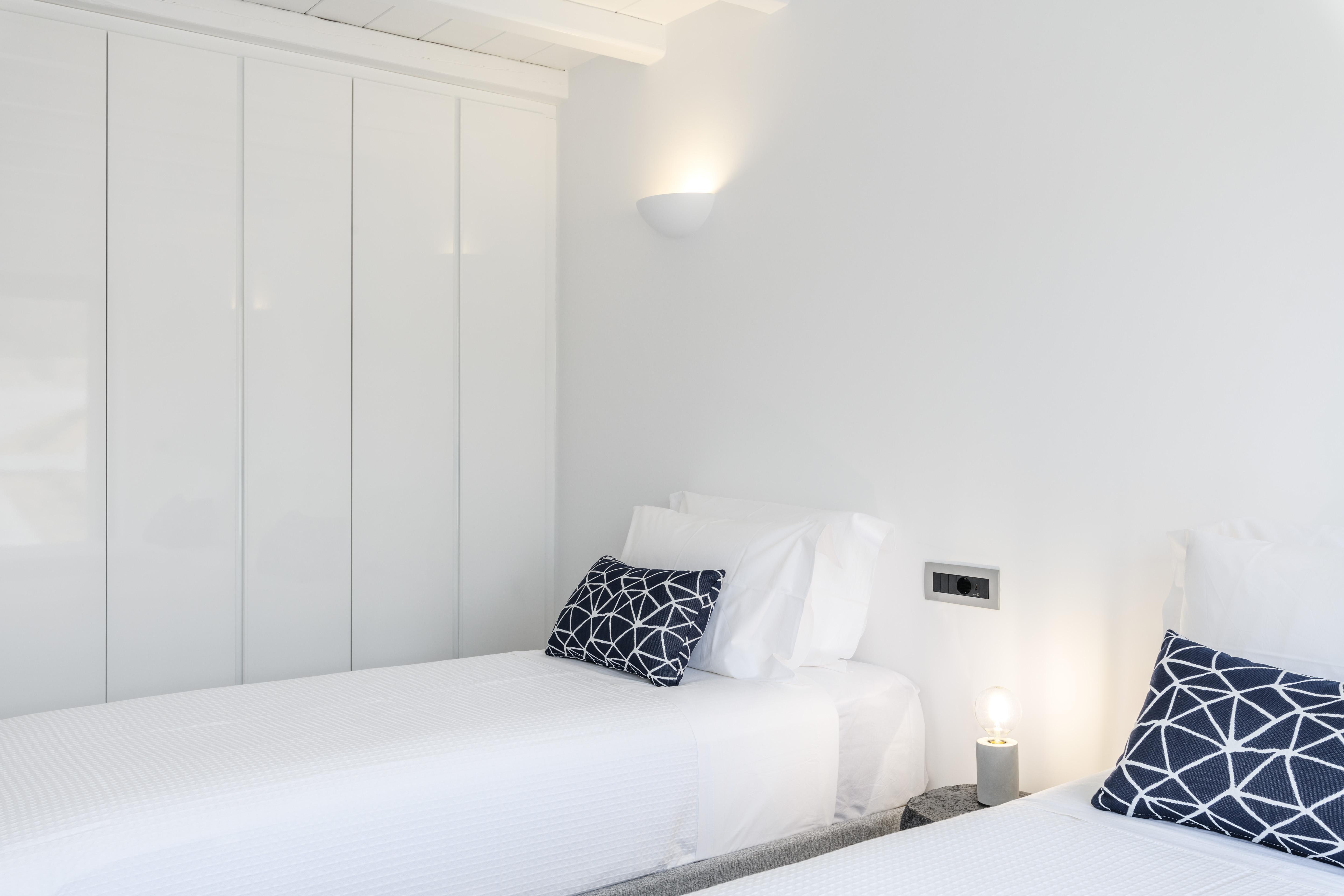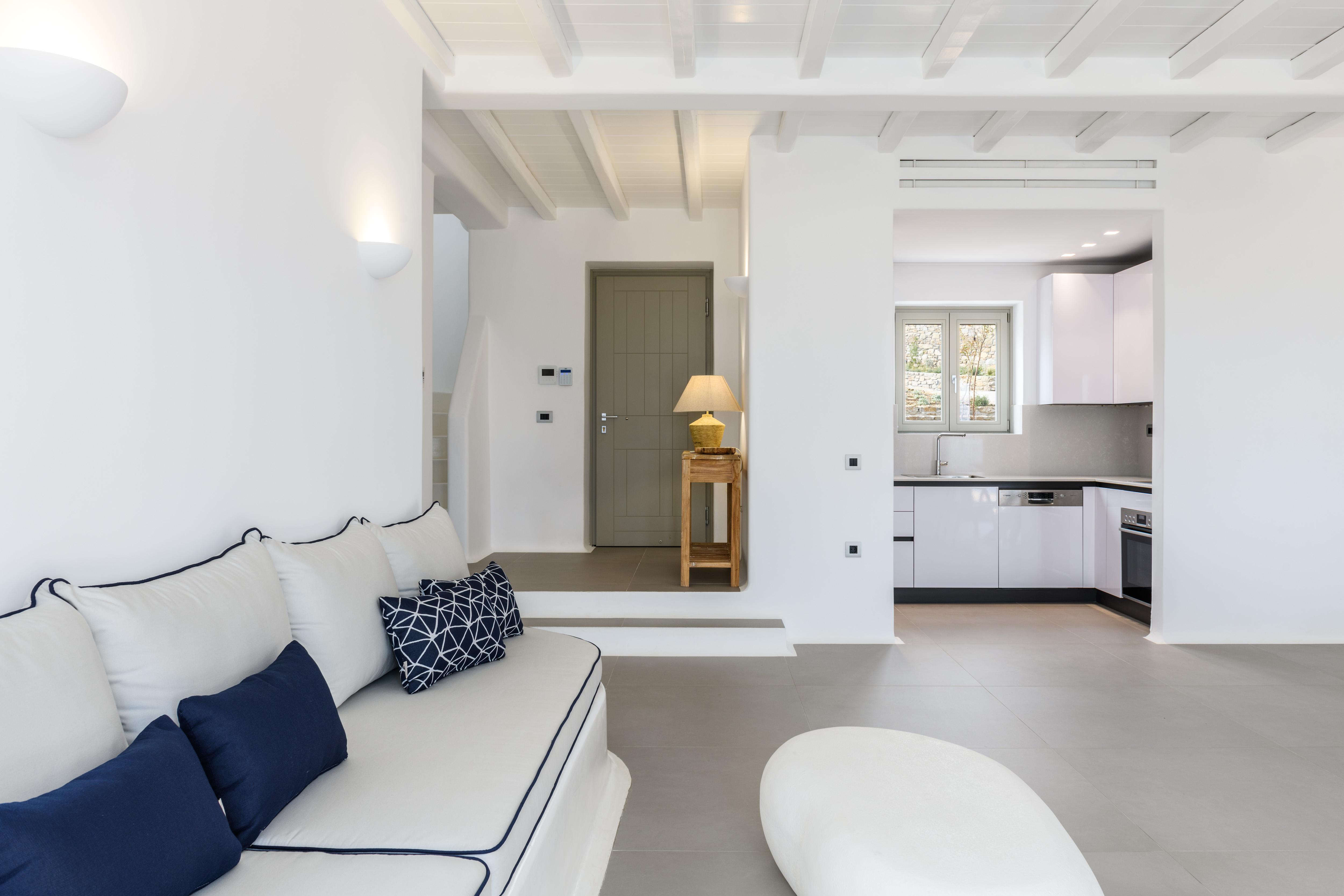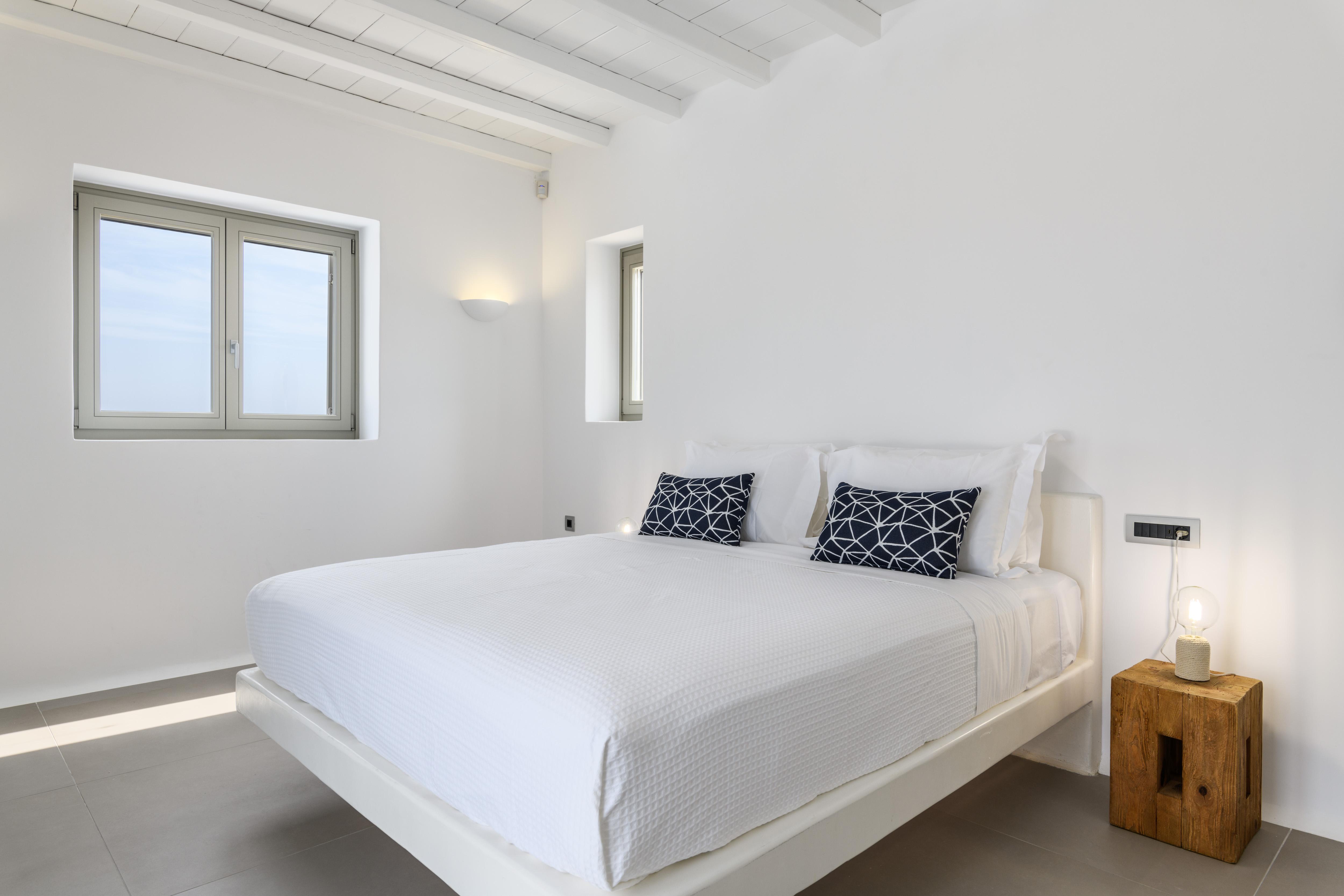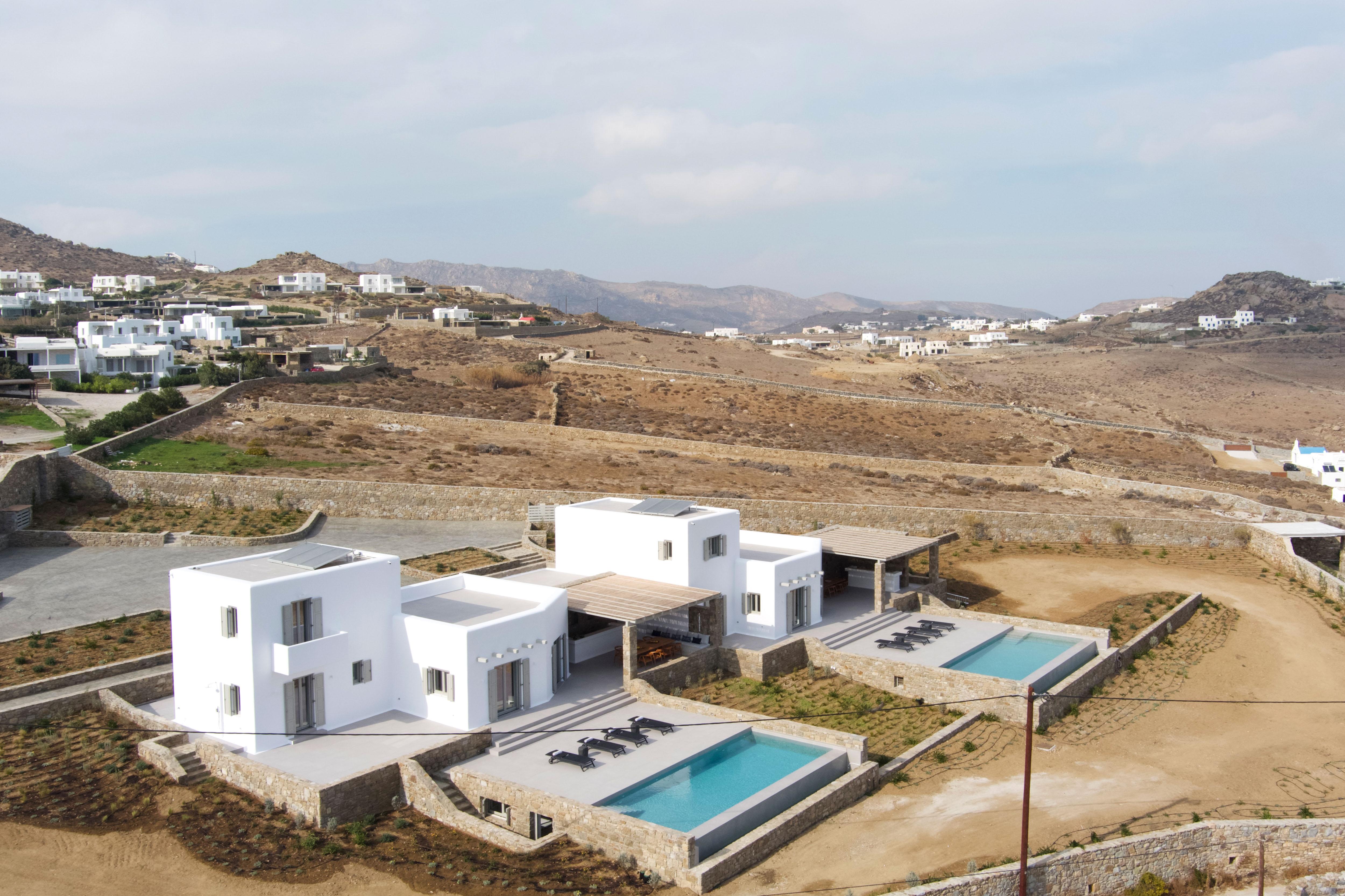 Comprising two sugar cube-style villas, this sprawling estate is perfect for large friendly reunions and multigenerational family get-togethers. From the pools flanked with sunbeds to the Cycladic-inspired interiors, effortless Greek island living is the way here. Mornings begin with breakfast on the terraces, catching up over freshly strained yoghurt and honey, before finding a spot to while away the hours in the sunshine. Should you need to take a break from the heat, the minimalist living spaces are the perfect place to unwind with an ice-cold beverage. And if a midday snooze sounds tempting, retreat to quiet bedrooms and fall back into sumptuous beds. In the afternoon, slip on your sandals and take the fifteen-minute stroll to Kalafati Beach for golden sands and crystal clear waters. Explore a little further afield with a seventeen-minute car ride to Mykonos town – famous for its windmills, labyrinthine streets and white-washed buildings.