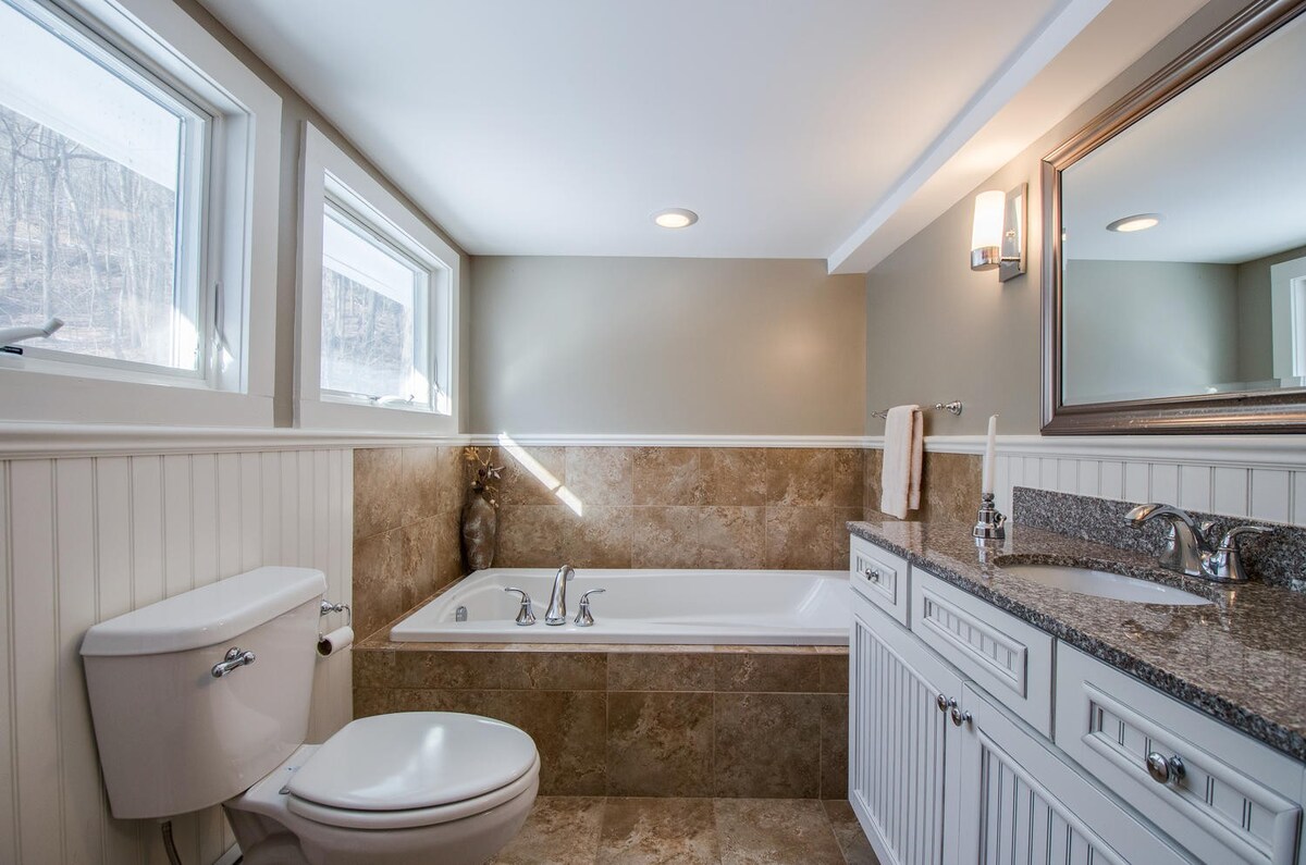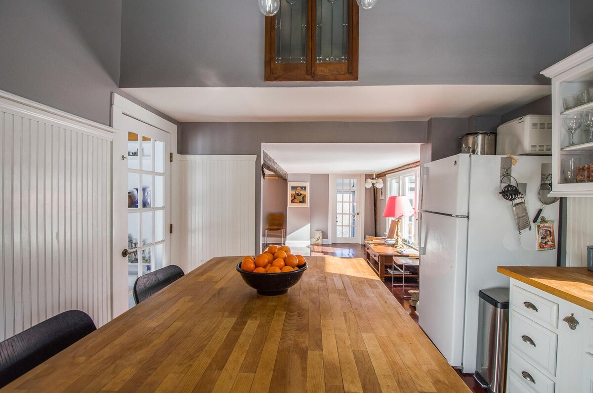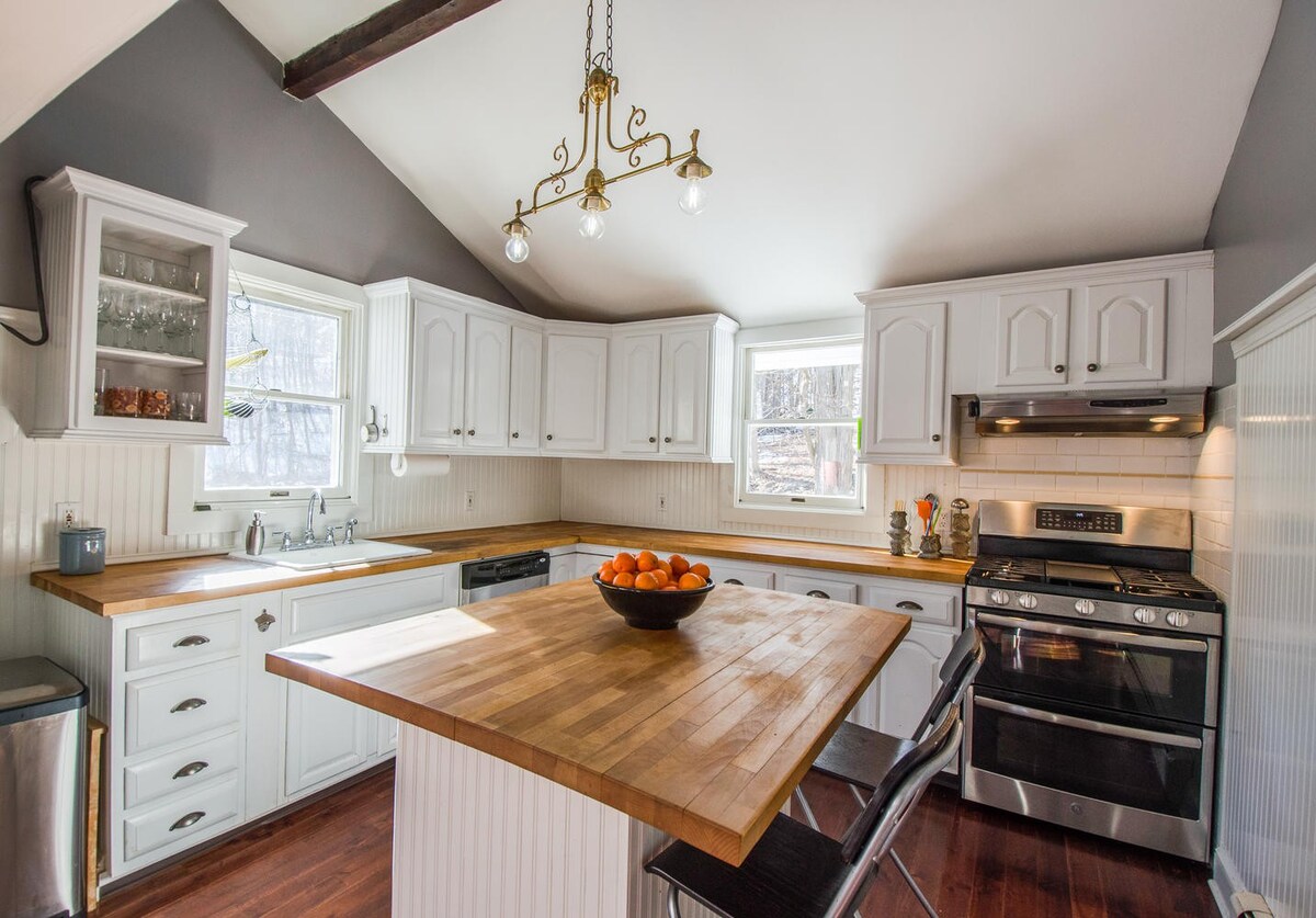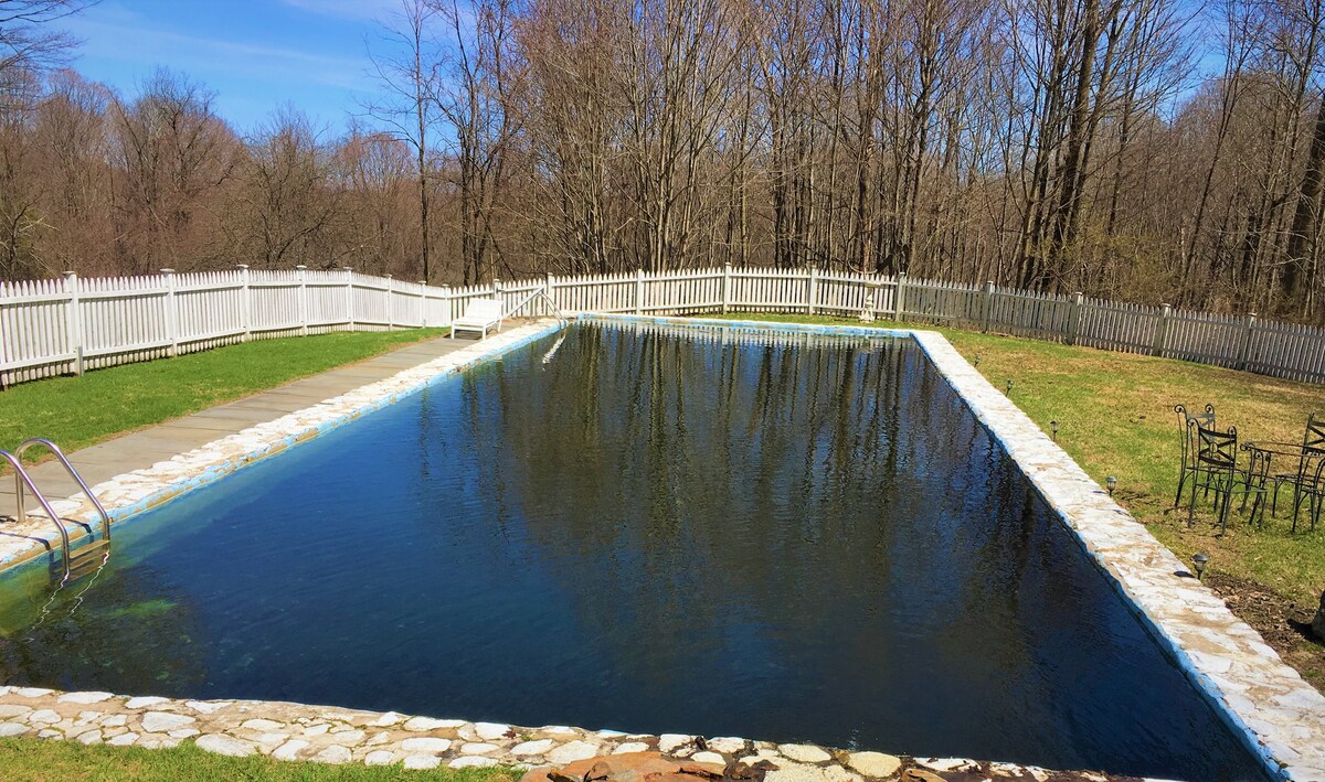 Originally built in the 1870s, this farmhouse has been added to over time to create a sociable family home. Inside, original details such as exposed wooden beams and large sash windows are complemented by vintage furniture and traditional furnishings, while a bar is ideal for evening cocktails. But you’re likely to spend most of your time outside, exploring the ten acres of land, enjoying a drink outside on the deck, taking some time to reflect at the koi pond, or gathering around the outdoor fireplace after the sun goes down. There’s also a natural pool fed by a mountain stream, which you can swim in, surrounded by frogs, water lilies and other aquatic life.