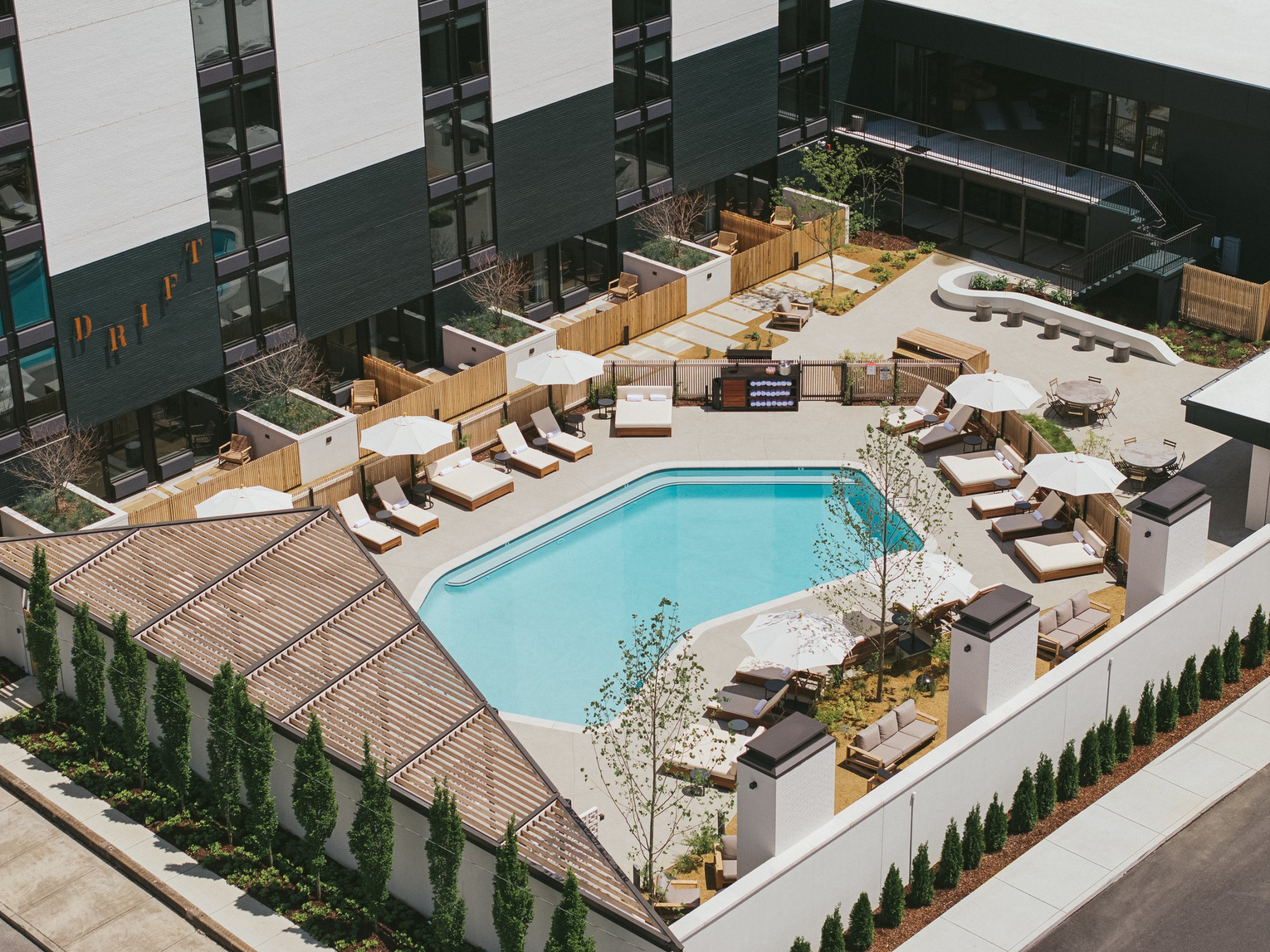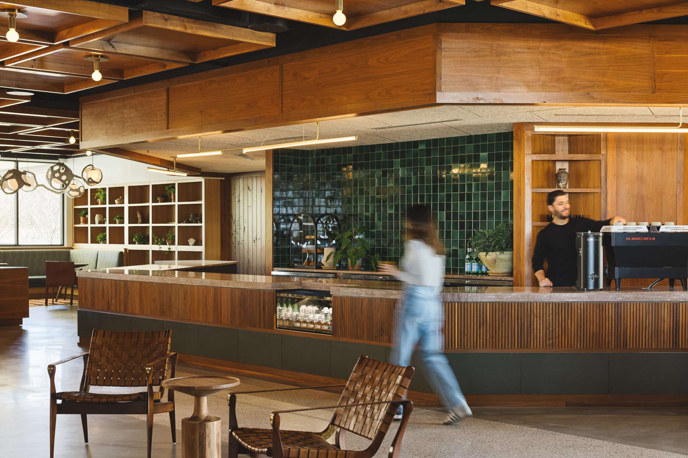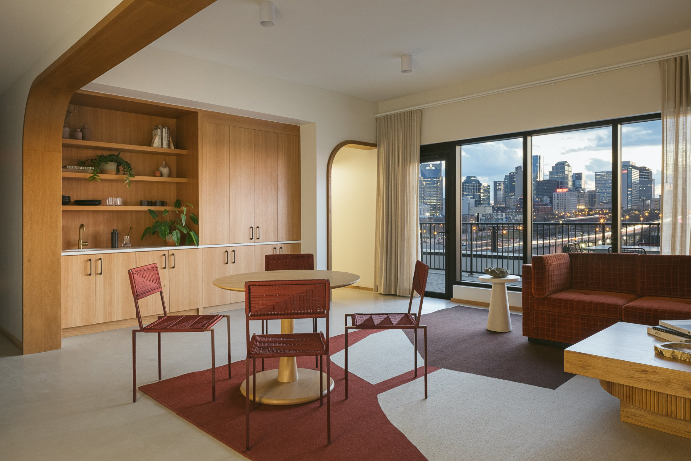 The interior of Drift embraces Nashville’s local makers from the custom wood door handle when you first enter the lobby to the handmade plaster lighting sculptures over the welcome desk and seating area to the handmade tile in the rooms, cafe, and lobby bar to every art piece. Every touch is made by someone from the community. Inspired by the original integrity of the mid century architecture and textures of the Southwest and Mexico. The hotel focuses on using a mix of materials for texture, local handmade tile, wood, brick, terrazzo, concrete, terracotta, soft velvets, leather, and rugs to create a comfortable and relaxing atmosphere