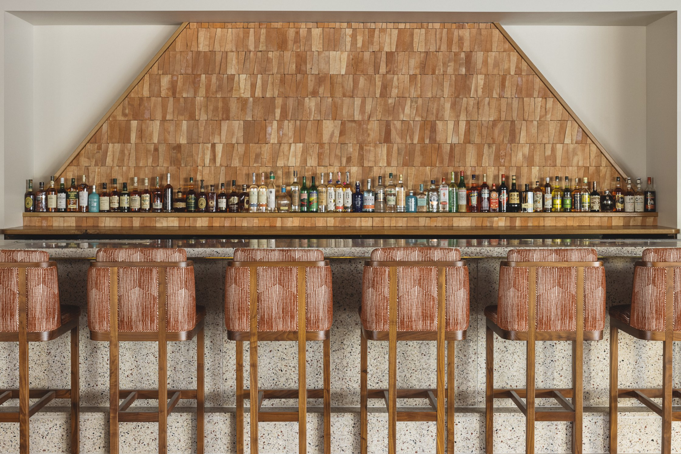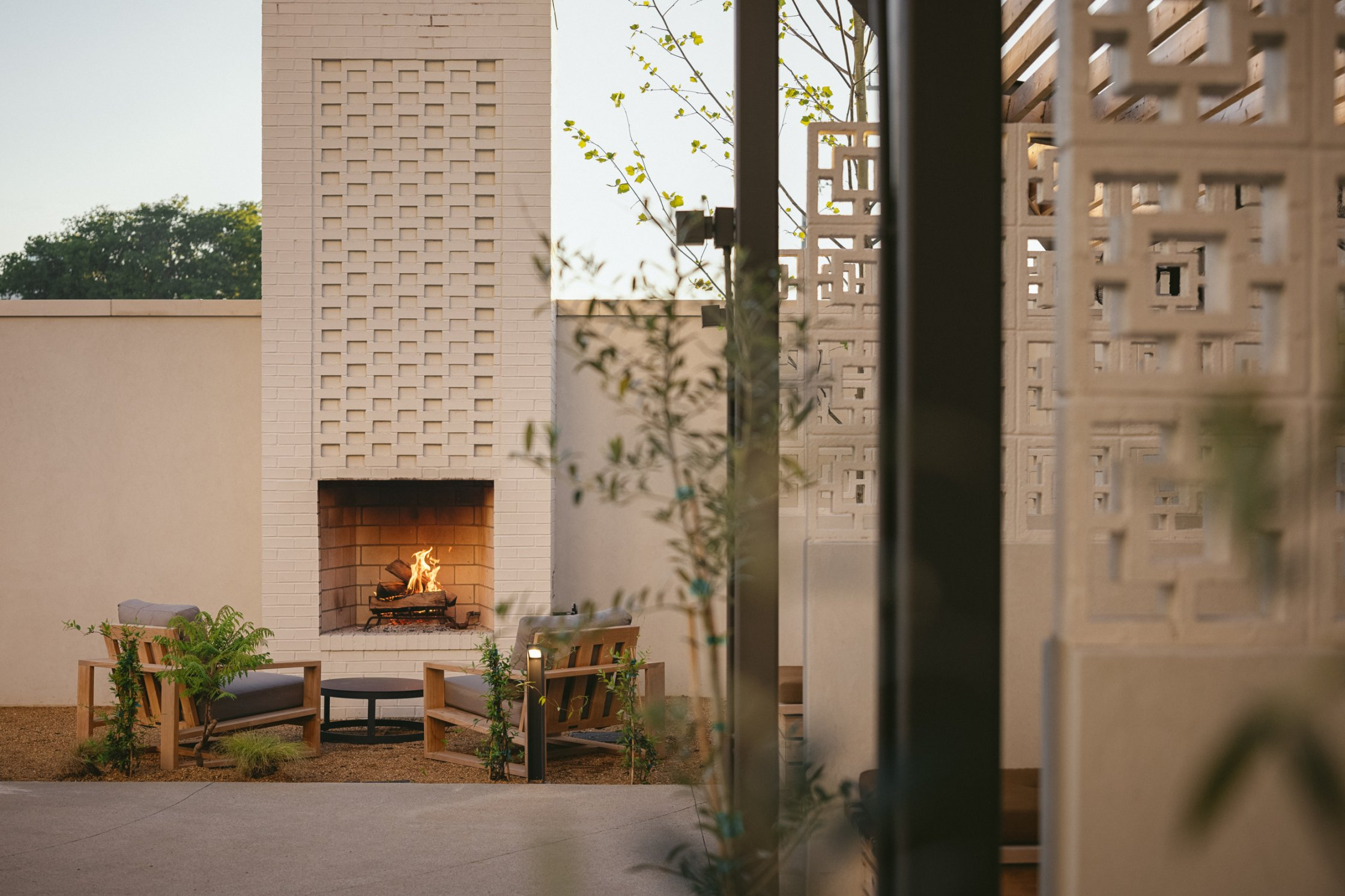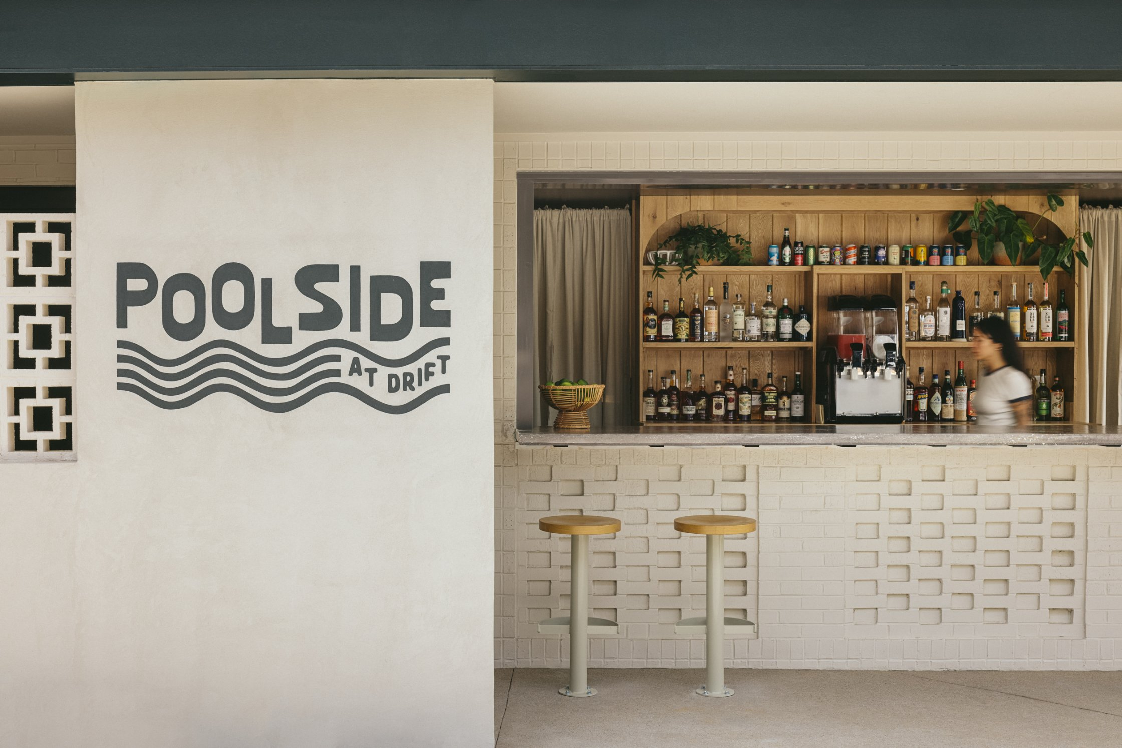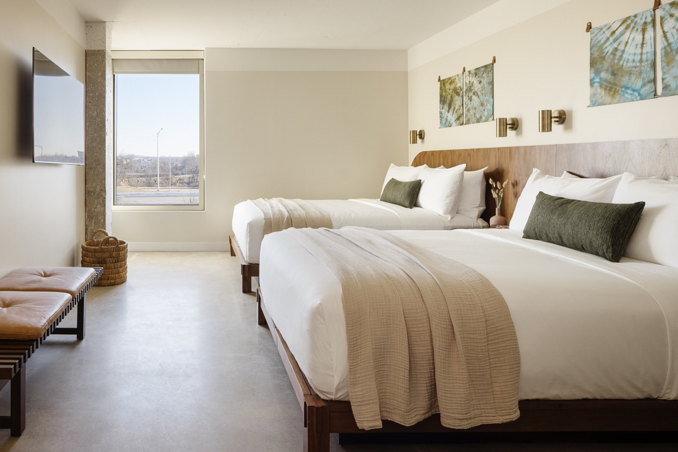 The interior of Drift embraces Nashville’s local makers from the custom wood door handle when you first enter the lobby to the handmade plaster lighting sculptures over the welcome desk and seating area to the handmade tile in the rooms, cafe, and lobby bar to every art piece. Every touch is made by someone from the community. Inspired by the original integrity of the mid century architecture and textures of the Southwest and Mexico. The hotel focuses on using a mix of materials for texture, local handmade tile, wood, brick, terrazzo, concrete, terracotta, soft velvets, leather, and rugs to create a comfortable and relaxing atmosphere