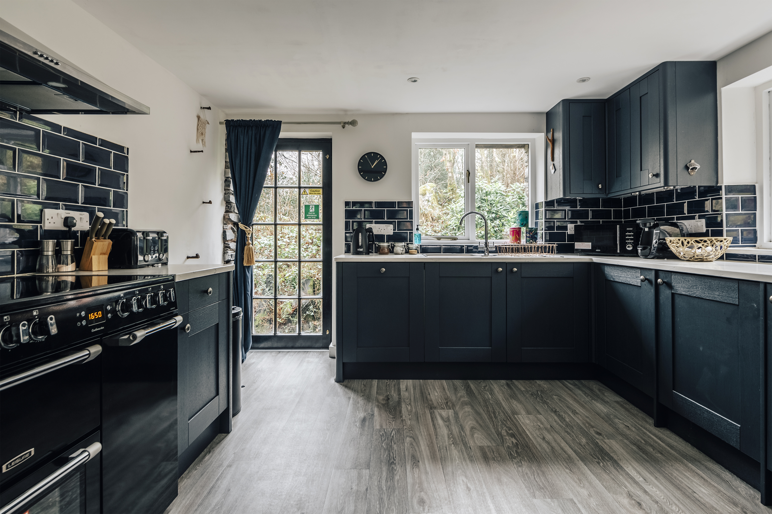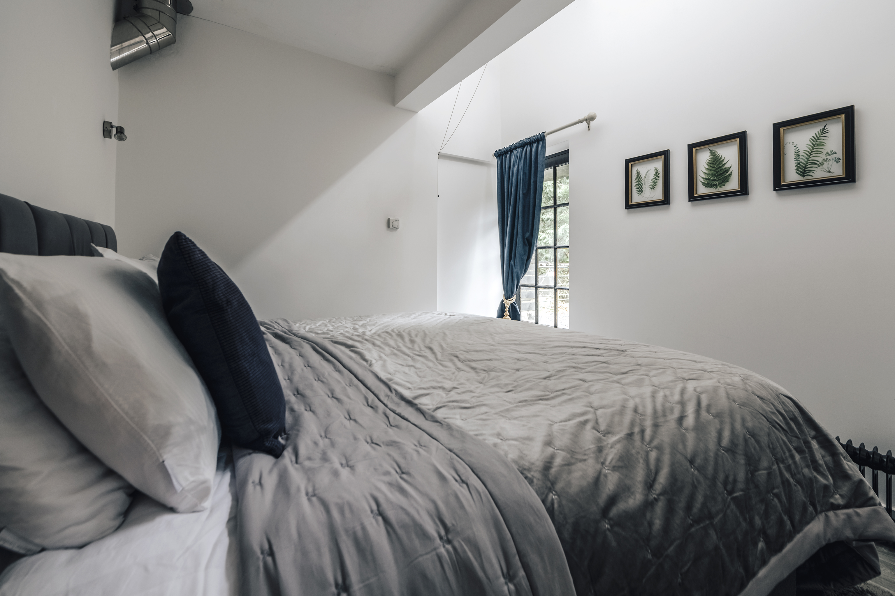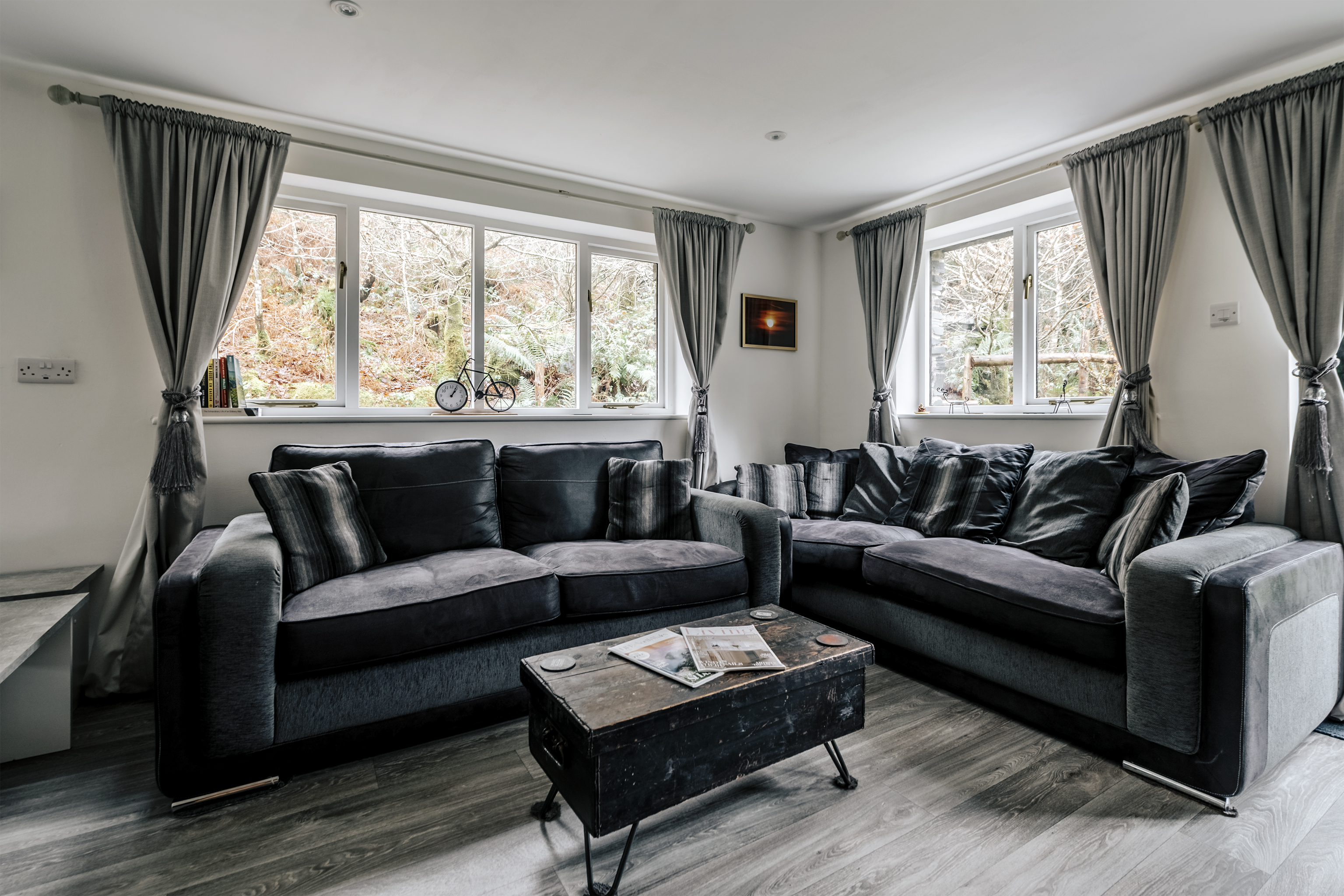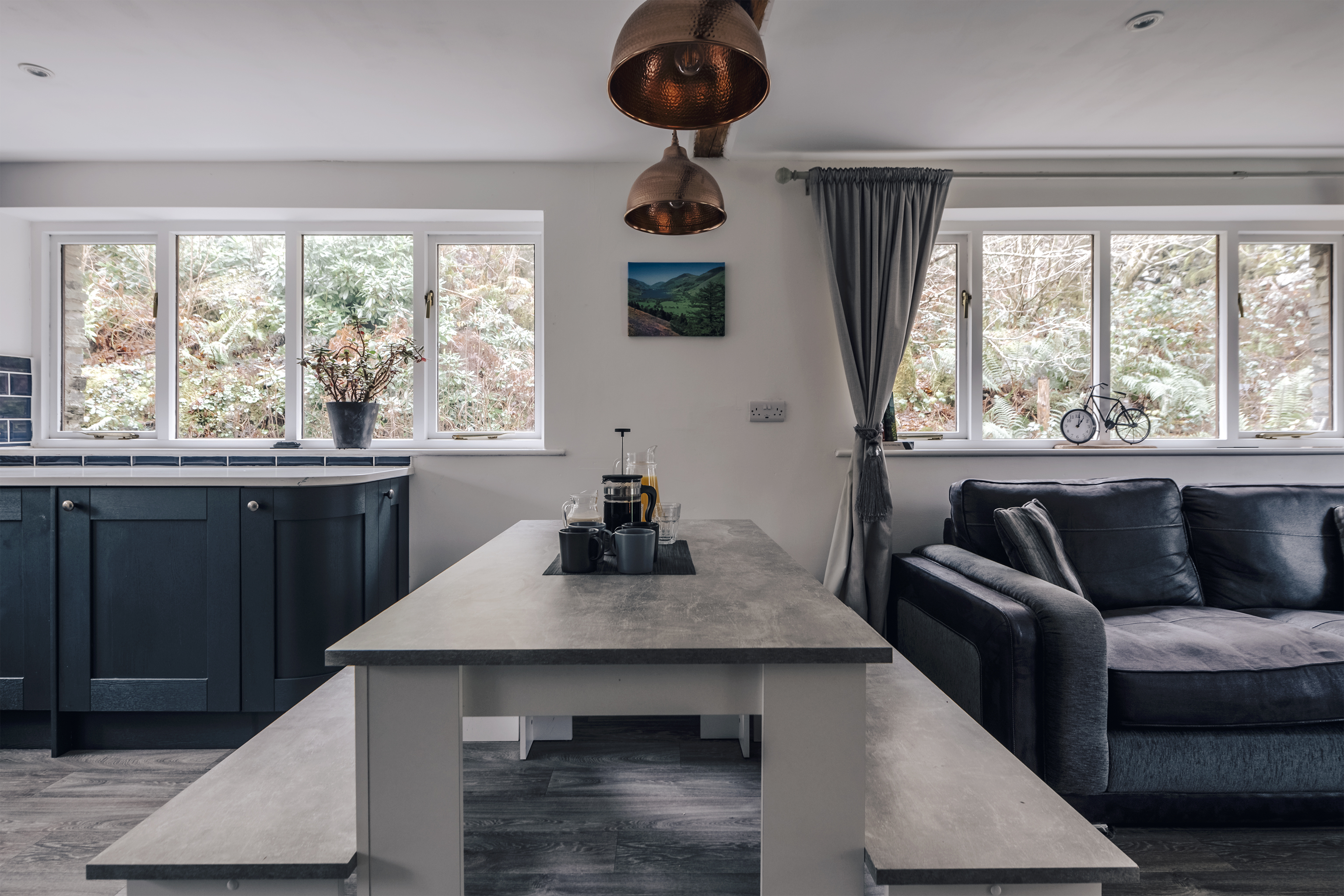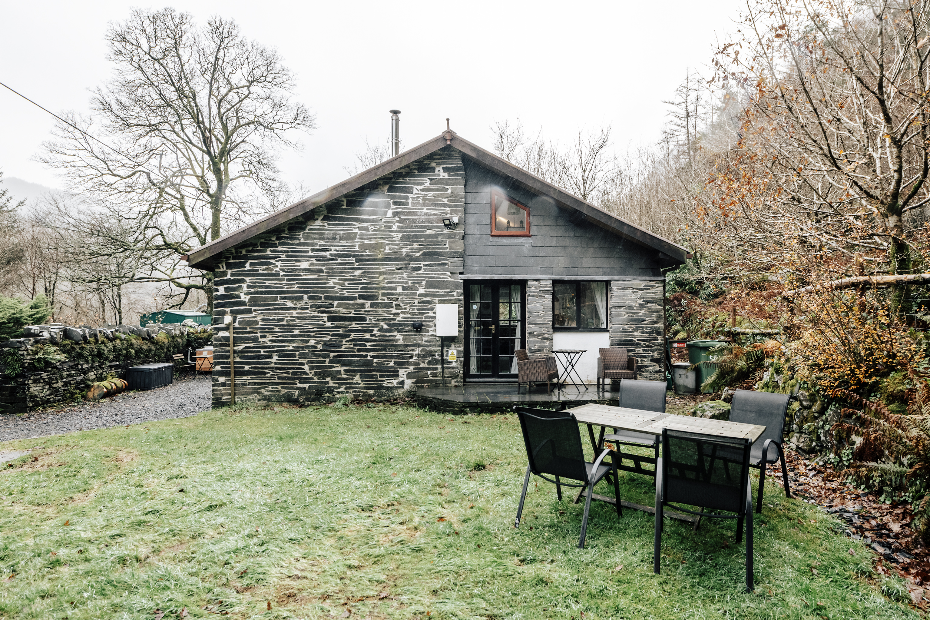 Quiet and secluded, but just a fifteen-minute walk from popular Corris, this lovely lodge has been completely refurbished to create a comfortable rural home. The owners, James and Sophie, live up at the main house and they've put a great deal of care into it. Heated with a ground source heat pump, laid out using the rules of Feng Shui and designed to be as cosy and welcoming as possible, this place will appeal to keen cyclists, walkers and those of us who just want to escape for a bit. Surrounded by pine forest, with a river running opposite, it's in the Dyfi Valley, with the Dyfi bike park just a ten-minute drive. A traditional slate building, the inside is modern and practical. Cosy up on the sofas in front of the fire (a basket of logs is provided), cook in the smart kitchen and eat at the contemporary dining table – it's all one sociable space. There's a bedroom and bathroom on the ground floor, with two more upstairs with sloping ceilings and skylights. In the summer, step out onto your patio with a cup of coffee each morning and just listen to the birds. A short walk away there's a public park – perfect for dog walks – and you can stroll into town to the cafe and pub.