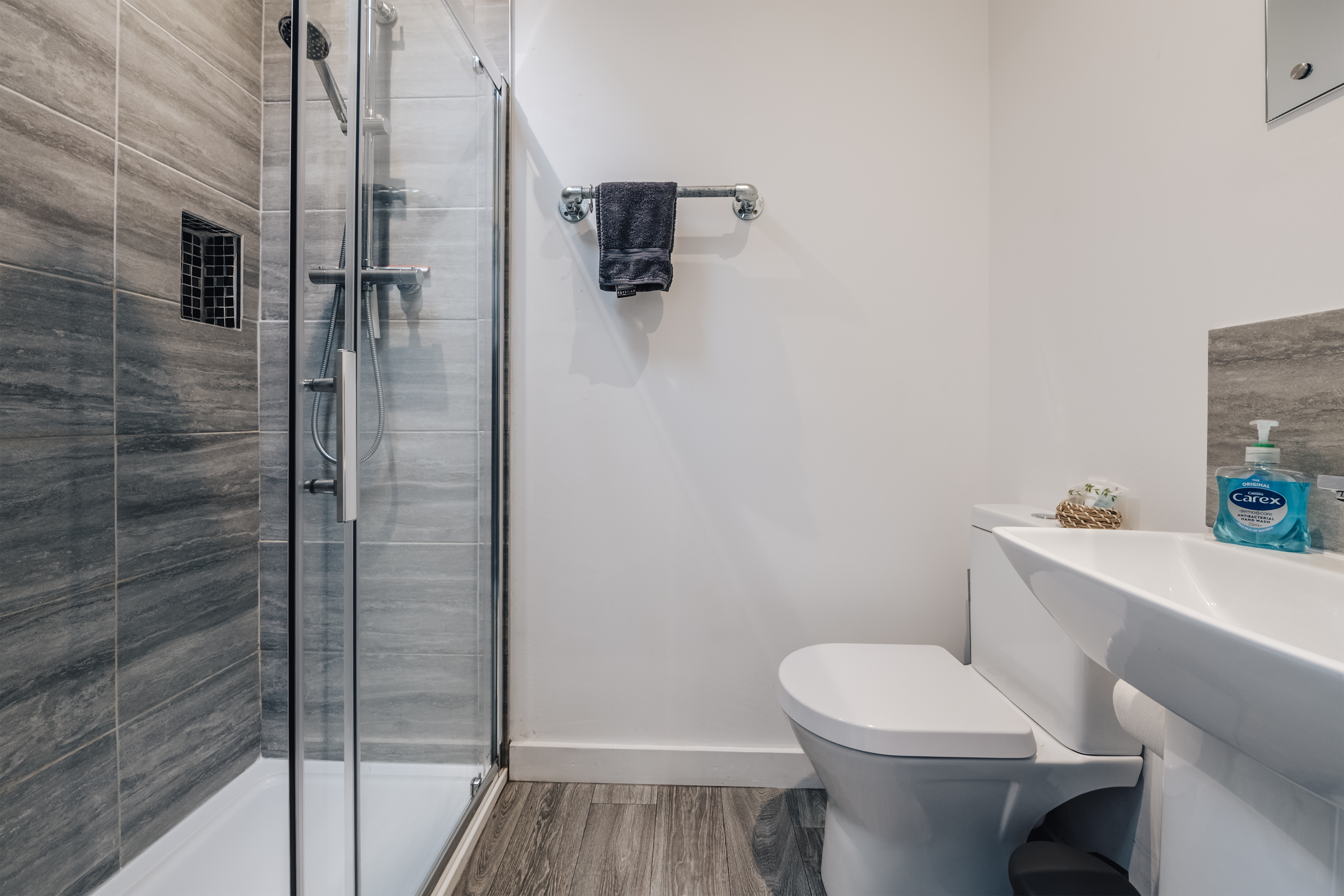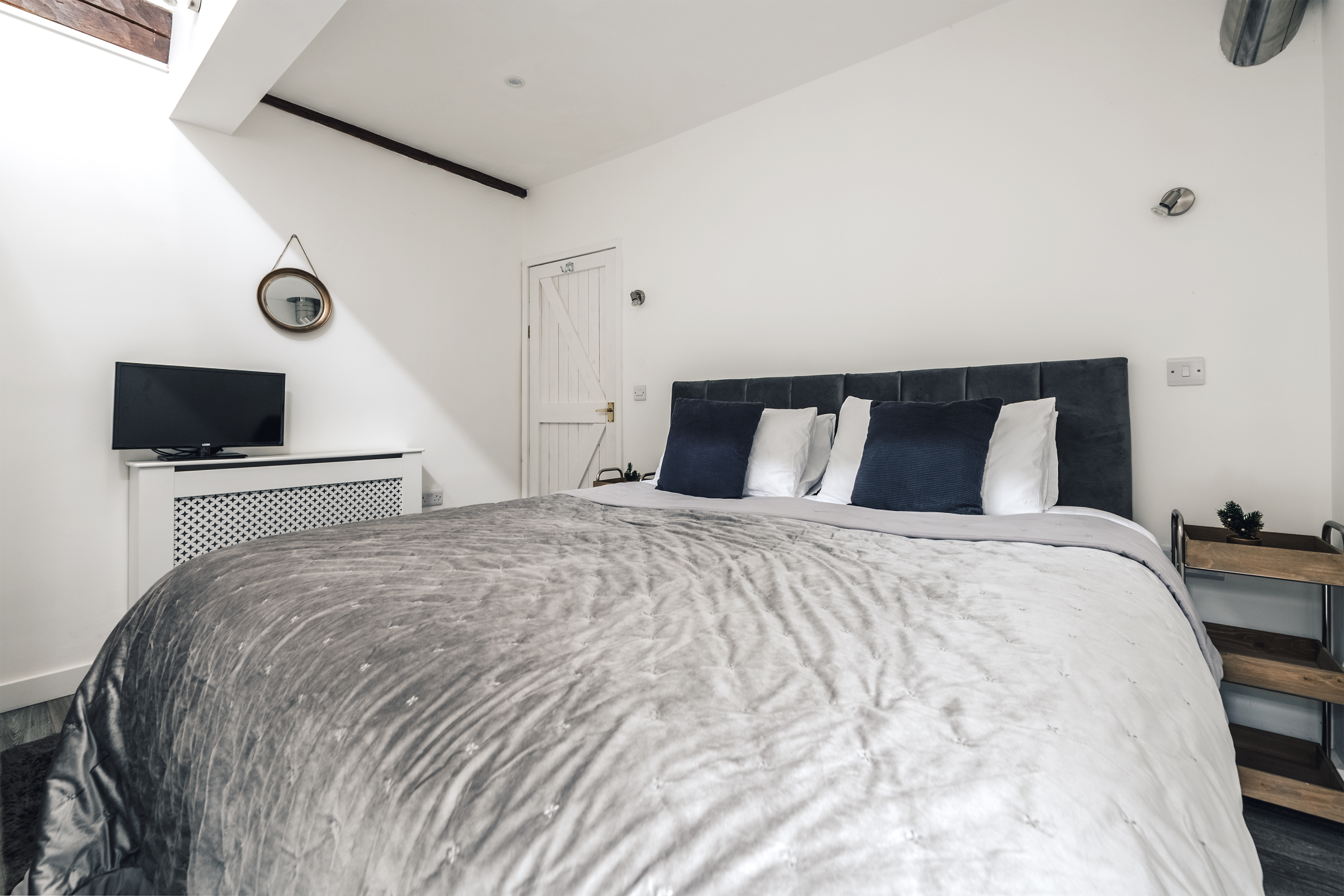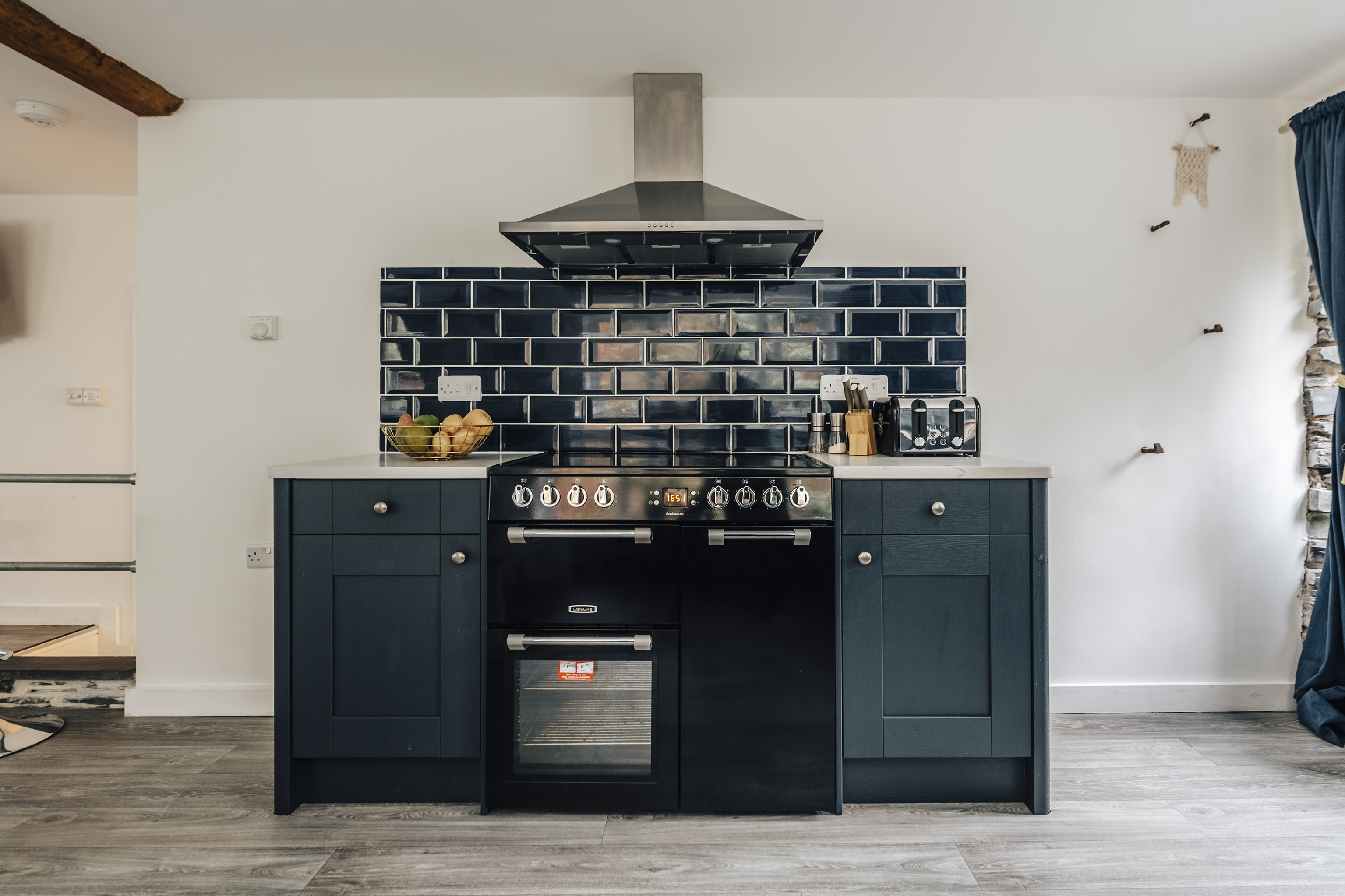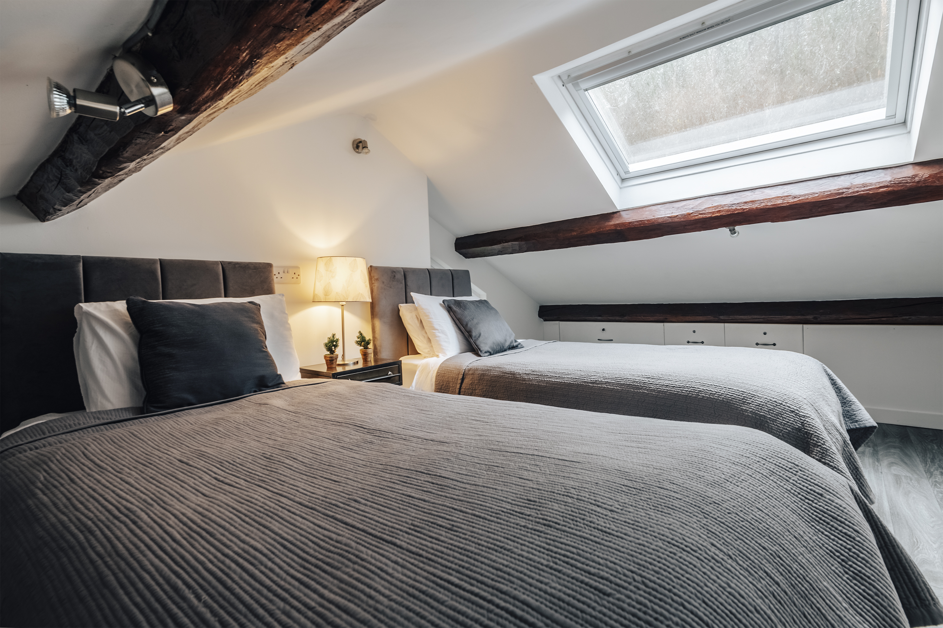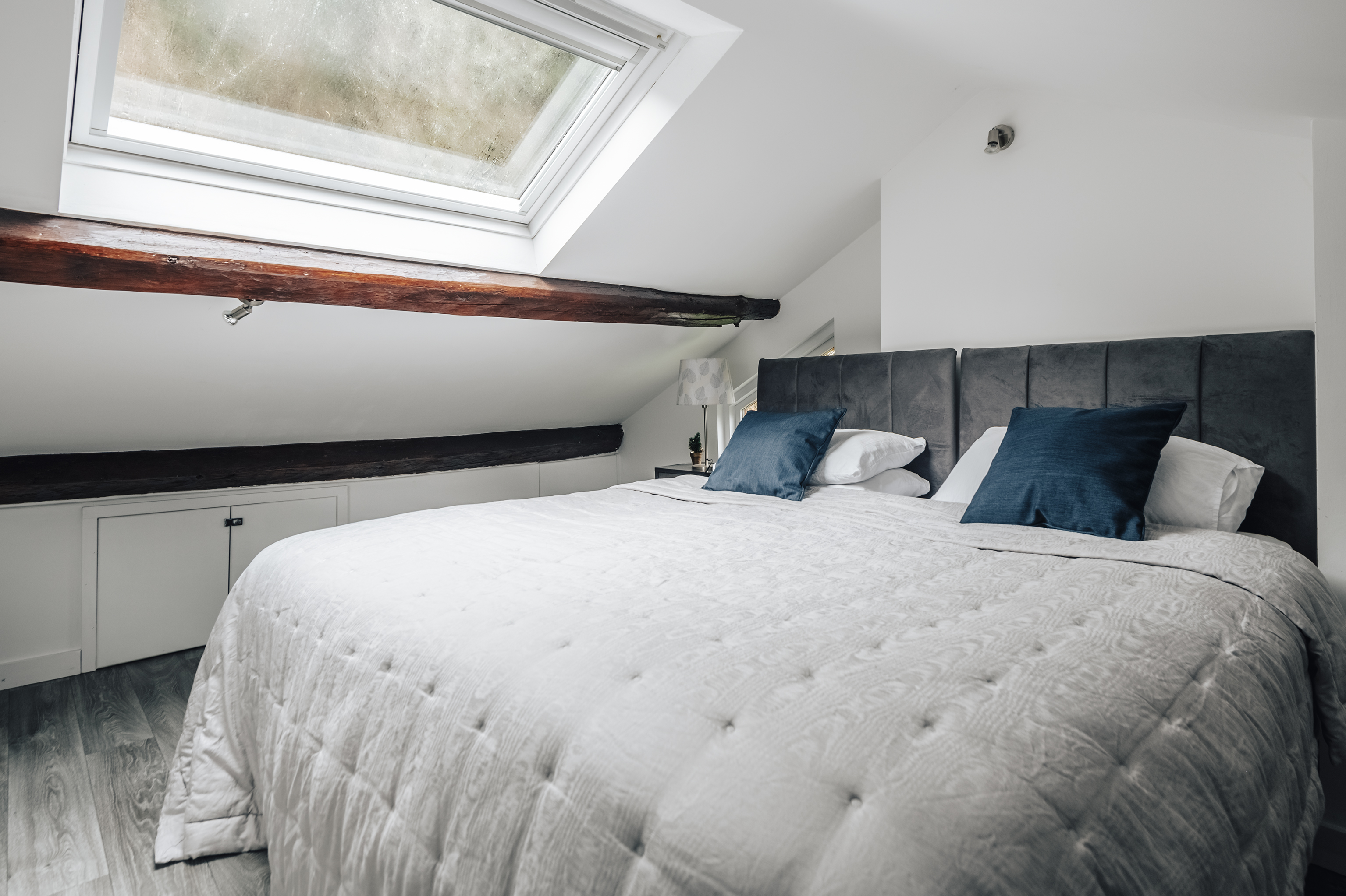 Quiet and secluded, but just a fifteen-minute walk from popular Corris, this lovely lodge has been completely refurbished to create a comfortable rural home. The owners, James and Sophie, live up at the main house and they've put a great deal of care into it. Heated with a ground source heat pump, laid out using the rules of Feng Shui and designed to be as cosy and welcoming as possible, this place will appeal to keen cyclists, walkers and those of us who just want to escape for a bit. Surrounded by pine forest, with a river running opposite, it's in the Dyfi Valley, with the Dyfi bike park just a ten-minute drive. A traditional slate building, the inside is modern and practical. Cosy up on the sofas in front of the fire (a basket of logs is provided), cook in the smart kitchen and eat at the contemporary dining table – it's all one sociable space. There's a bedroom and bathroom on the ground floor, with two more upstairs with sloping ceilings and skylights. In the summer, step out onto your patio with a cup of coffee each morning and just listen to the birds. A short walk away there's a public park – perfect for dog walks – and you can stroll into town to the cafe and pub.
