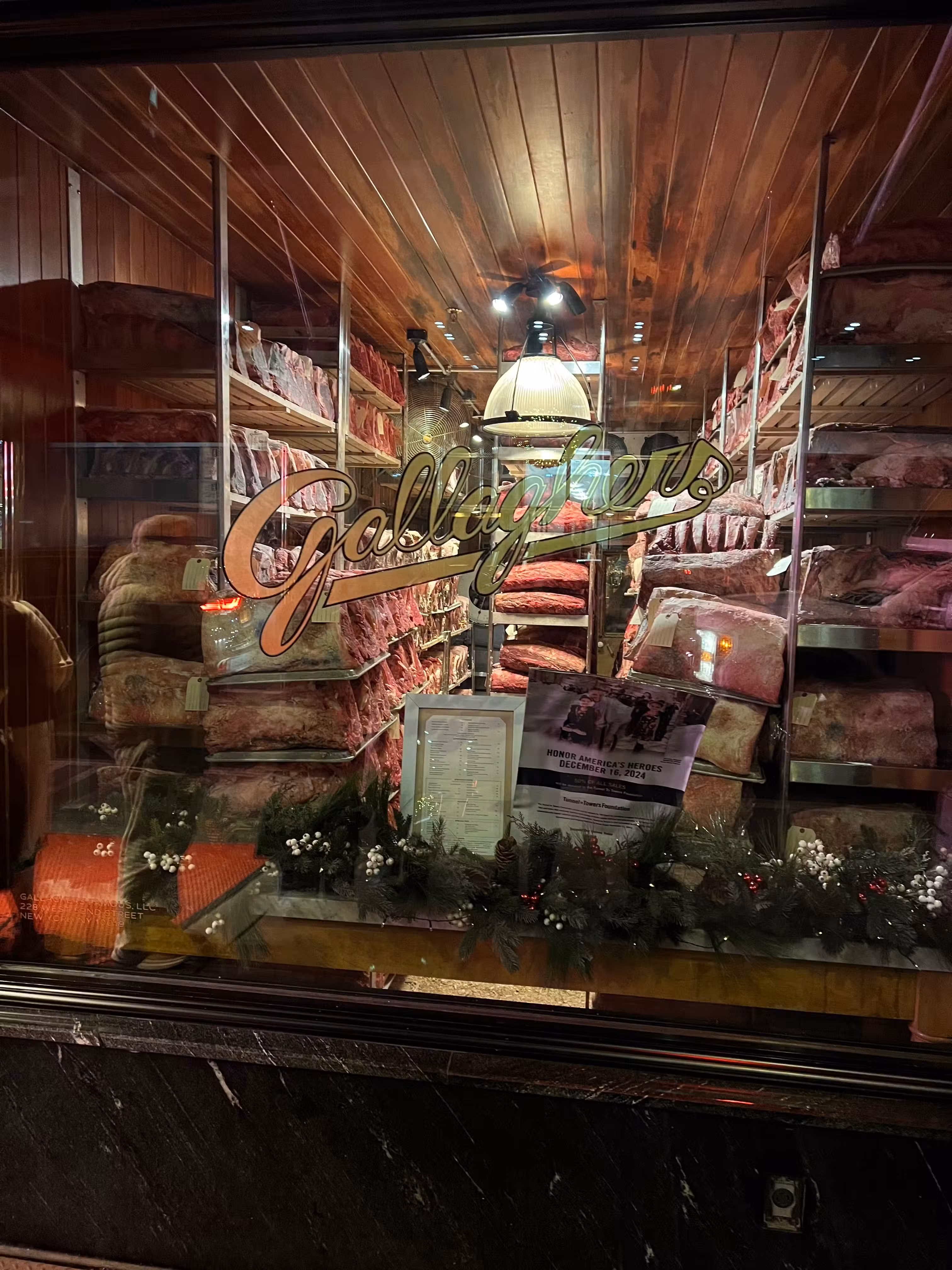 Founded by former Ziegfield girl Helen Gallagher and the colorful gambler and sports enthusiast Jack Solomon, Gallaghers opened as a speakeasy and steakhouse in 1927. At that time, the height of Prohibition, a good stiff drink and a great steak were hard to find in New York – except, of course, at Gallaghers.New Yorkers come for the world-class cocktails and incredible steak – prime beef dry-aged for 21 days in Gallaghers’ legendary windowed meat locker. The combination of all-natural dry aging and cooking it to perfection over hickory coals makes for a steak unlike any other found in New York.Gallaghers’ guests are welcome in a wide variety of attire – from elegant casual to business suits. We respectfully request that you refrain from wearing hats, sports jerseys, tank tops and shorts.